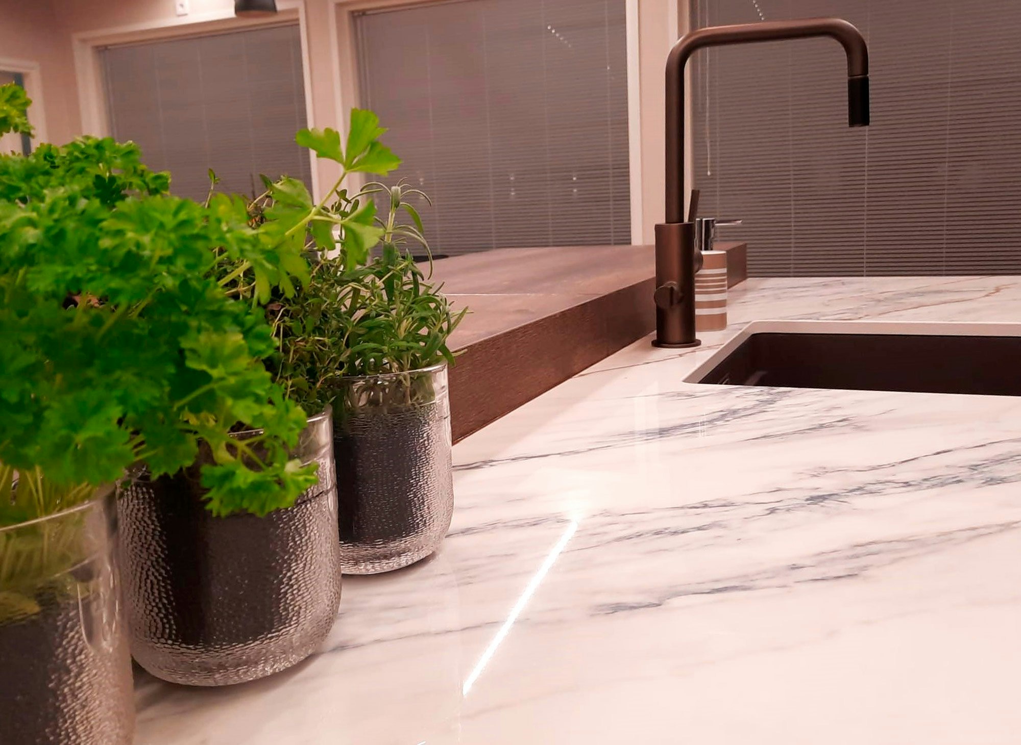 As a kitchen expert, everything had to be perfect in hers, and the other furniture and appliances in the room matched the worktops they had chosen. “The choice of sink was an easy one. We chose the Etagon 500-U from Blanco. We also wanted the sink area to be different from trendy colours, something close to nature, but at the same time in keeping with the taps we had chosen. Therefore, the sink is a coffee colour and the tap is bronze, both dark brown shades. Specifically, we chose the Tapwell ARM887, which has a design that matches the look and feel of the entire kitchen.”