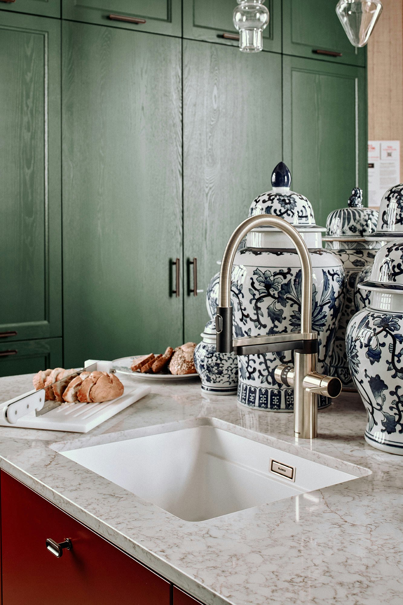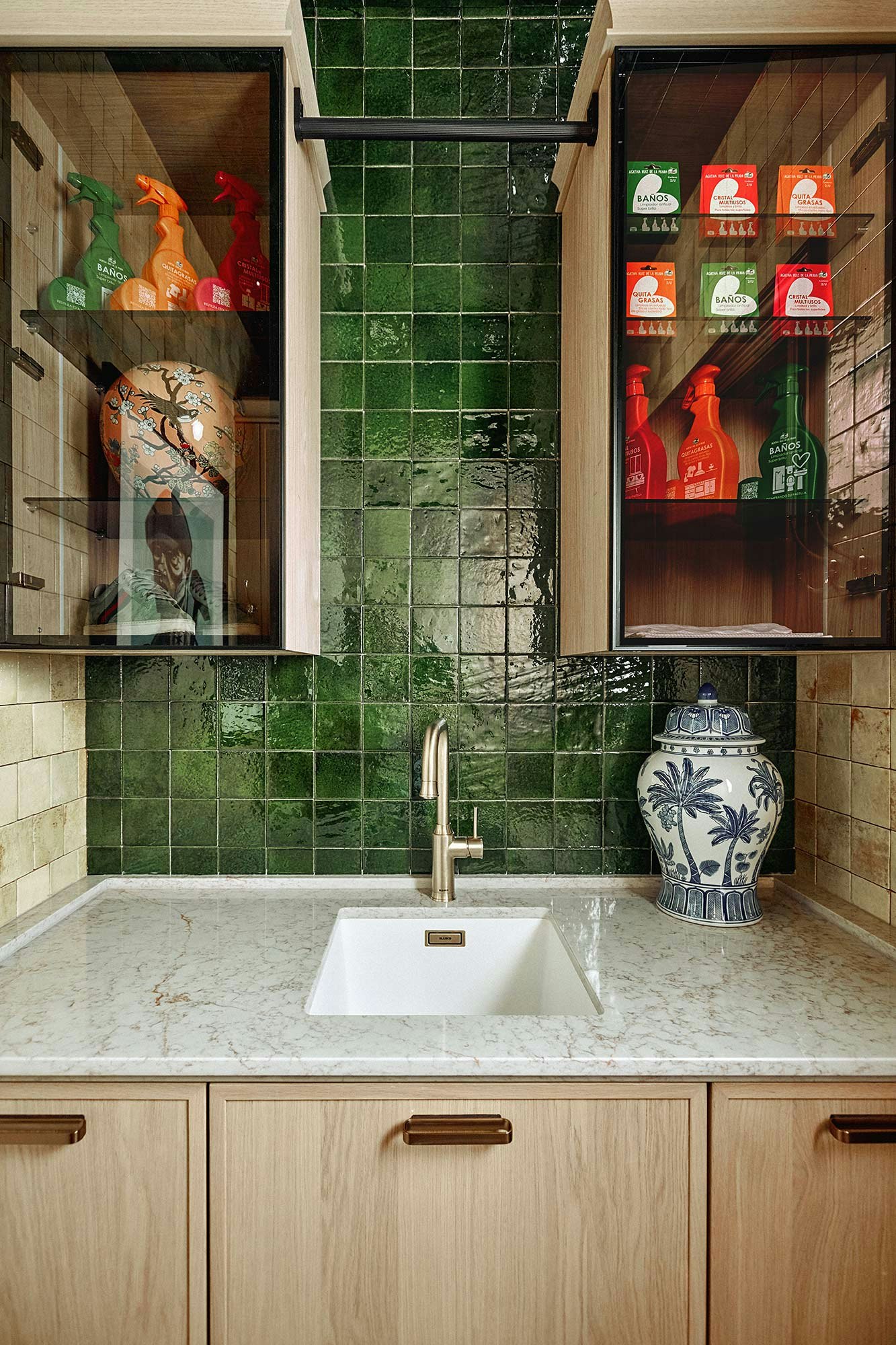 But if anyone thought the laundry room was the most boring space in a home, Porsche proves them completely wrong. His playful proposal for this corner of the house turns the everyday into something inspiring. Here too, Silestone Rivière Rose is present, making this space a place where one might linger even after finishing the laundry.