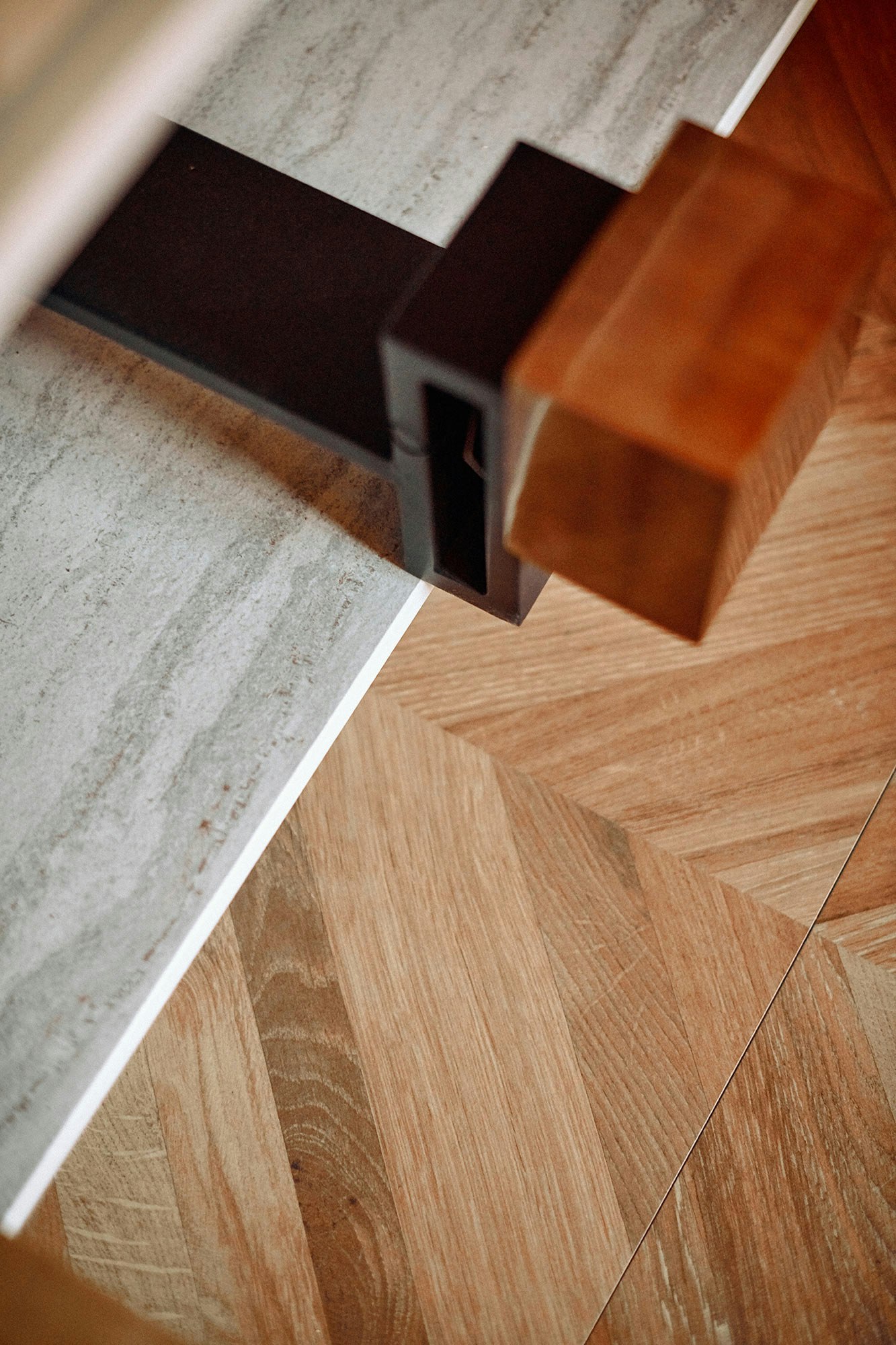 Upon entering 'Toujours à Madrid', the first thing that catches the eye is a kitchen featuring a bold triangular island, a true statement of intent that reflects Madrid's unique way of embracing the unexpected. The worktop in Silestone Rivière Rose, with its pink and grey veining, adds elegance, something Porsche excels at. But, as in Madrid, surprises are hidden in plain sight: behind the doors of the large storage units lie details that invite you to explore every corner.