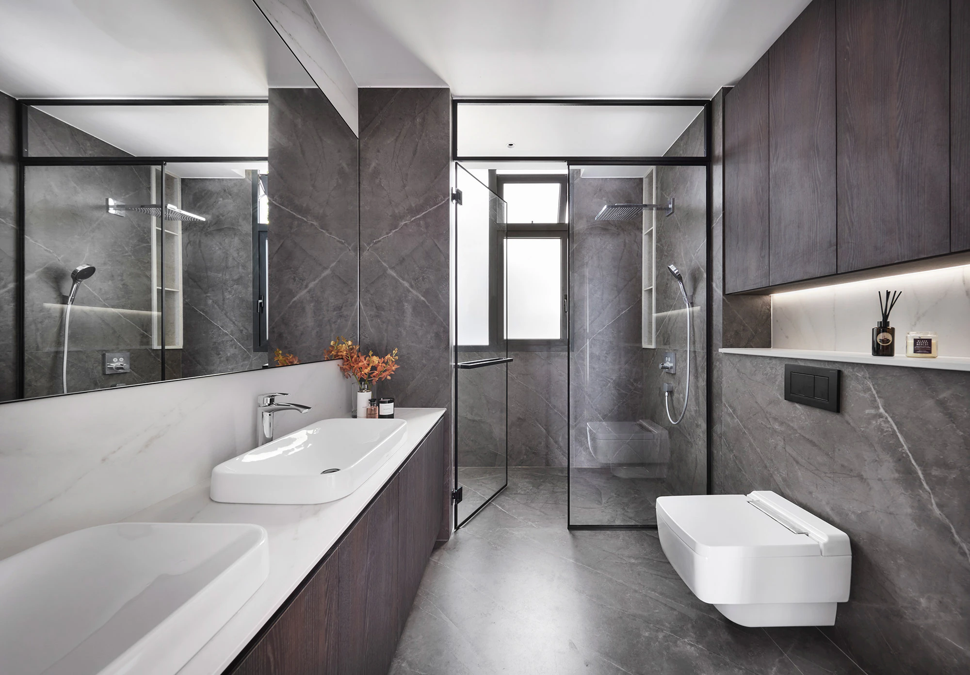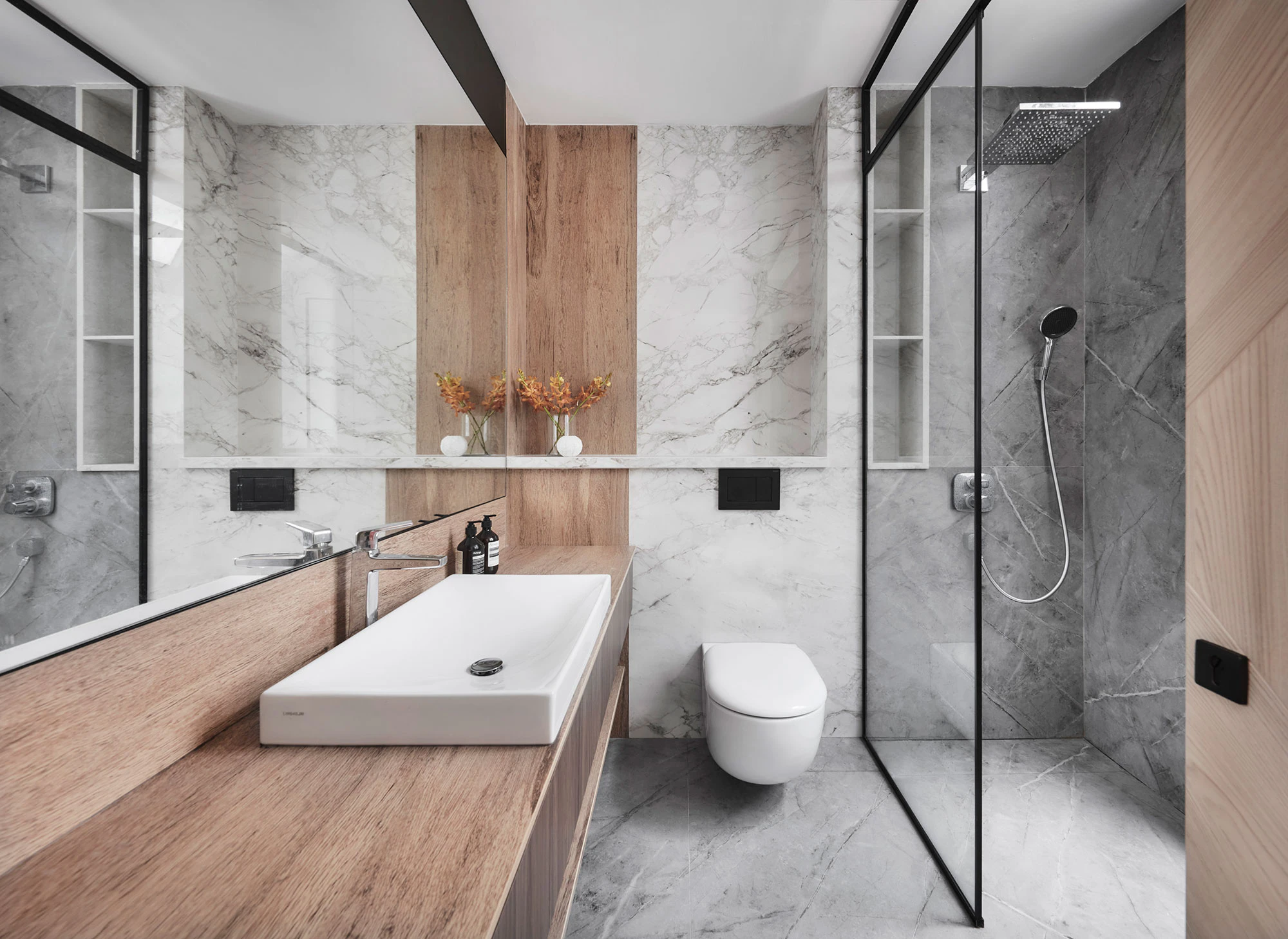 As for the other bathroom, it features Dekton Rem on the countertop and front and Dekton Kira on the floor and wall cladding. With an intricate design featuring brown and grey veining and hints of gold, Rem takes inspiration from one of the most elegant white marbles on the market, Calacatta. As for Kira, it features a background in earth tones crossed by delicate light grey veins reminiscent of the Gris Pulpis natural stone for its elegance and versatility.