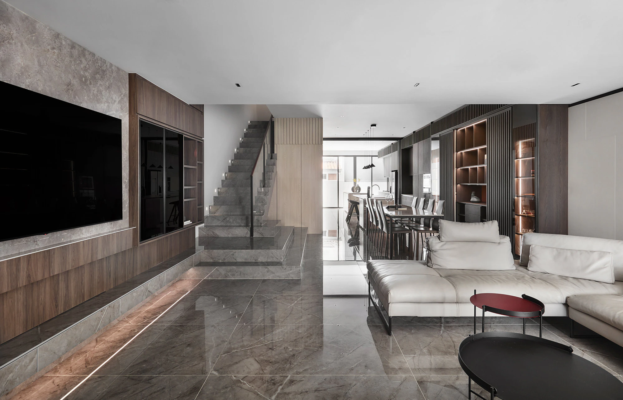 The stairs in the living area are made in Dekton Stonika Sogne, a colour with touches of natural stone and concrete on a veined background that dazzles thanks to its XGloss finish.