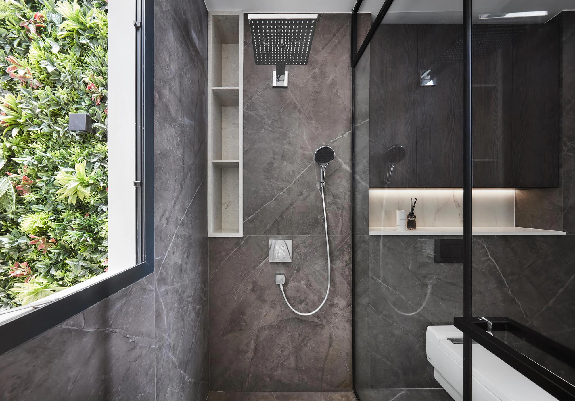 In this case, for the wall cladding in the first bathroom, the colour chosen was Dekton Stonika Bergen, a shade that strives for perfection in tone, structure and depth. The beauty of its greyish veins, with sculptural pattern on a whitish background with delicate filigree, makes it a trendy design full of character and elegance. Thanks to its XGloss finish, it offers a dazzling, almost mirror-like shine, making it the only surface on the market with such a fine thickness that achieves this.