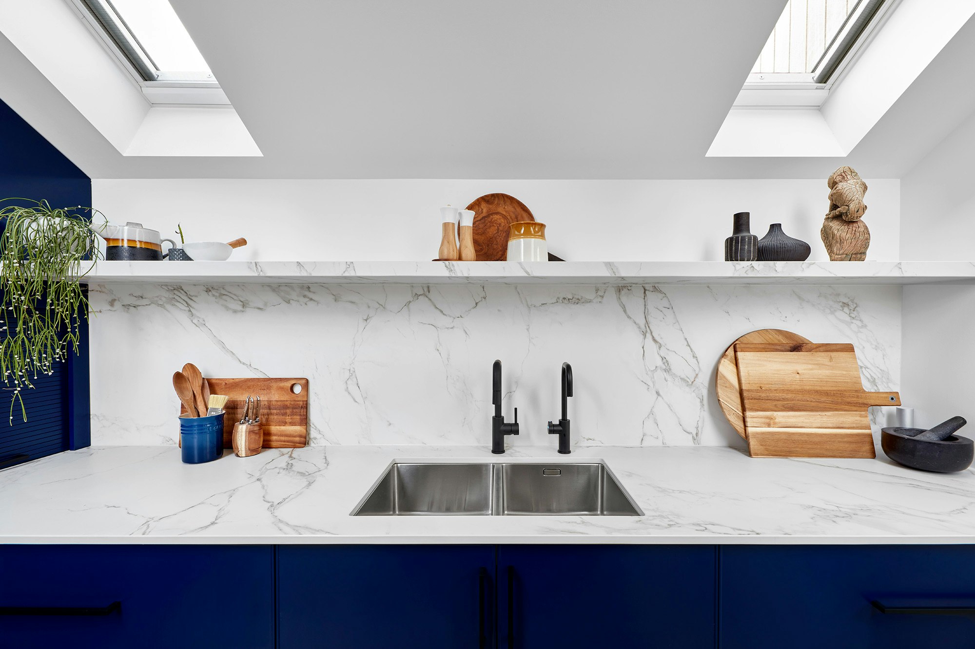 Kitchen worktops and fronts, floating shelf, fireplace, bench