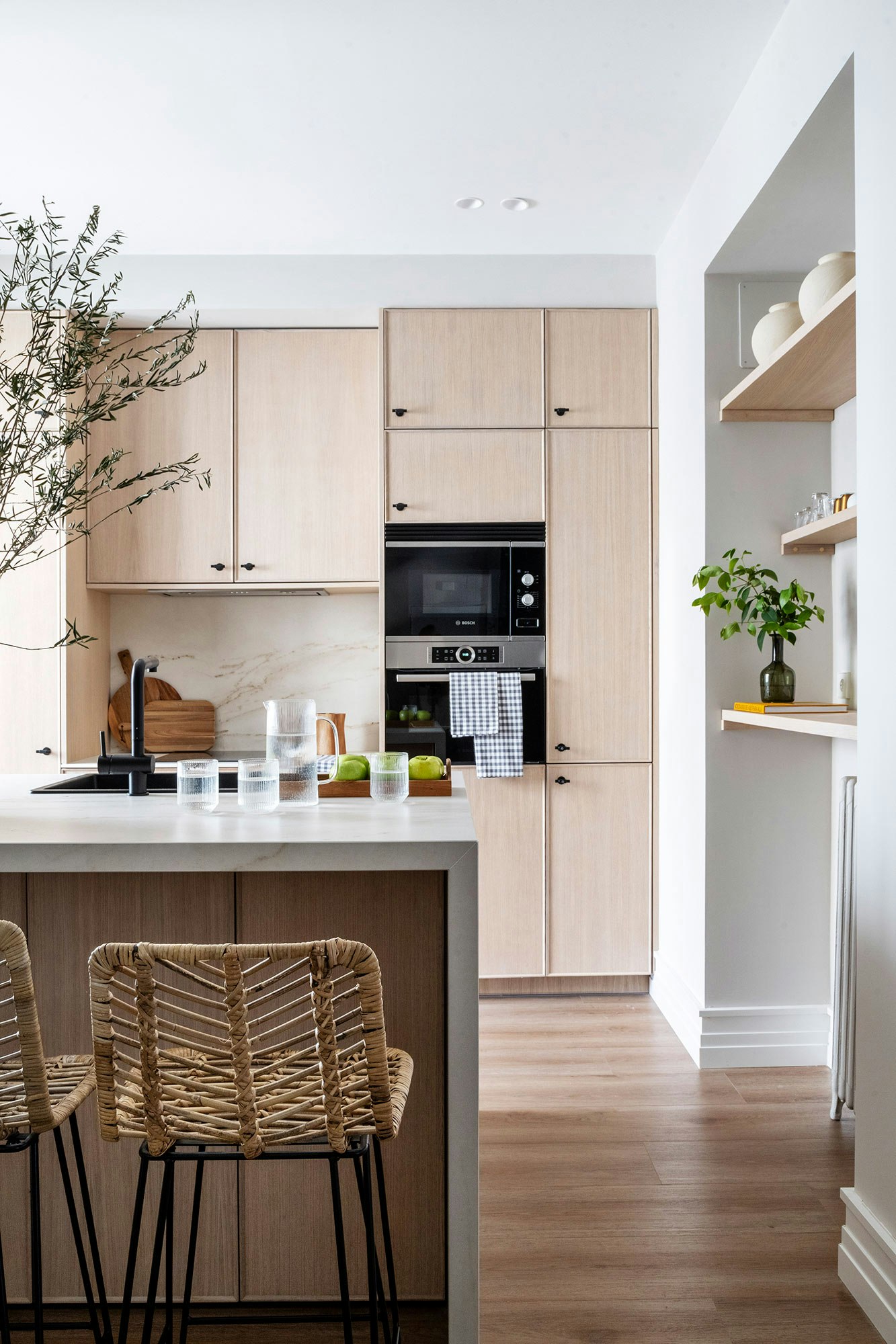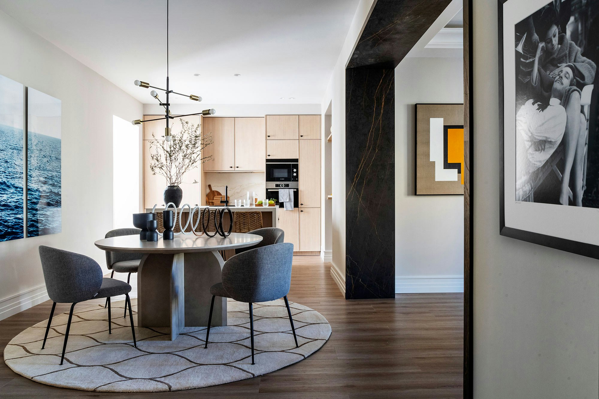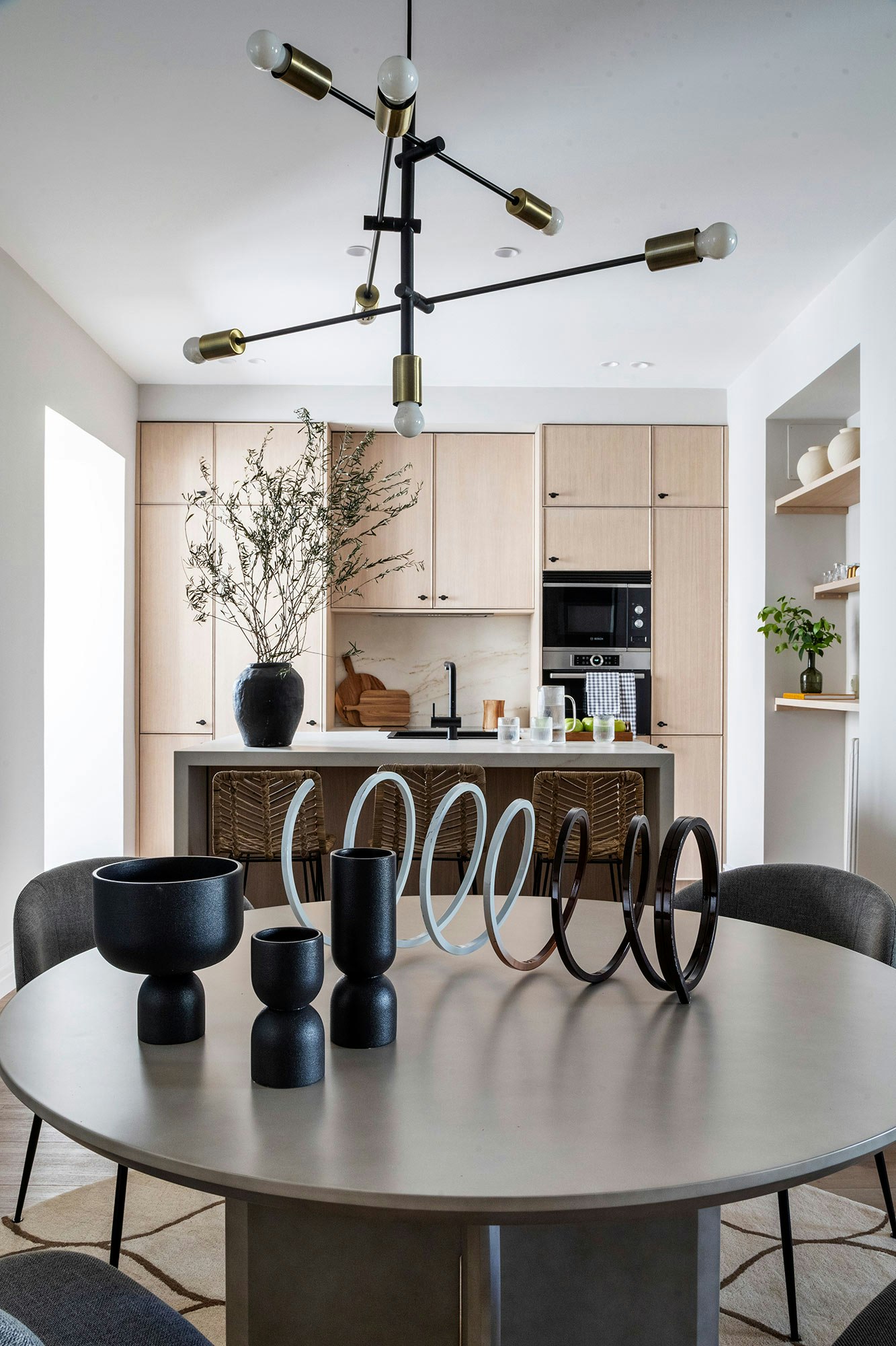 A striking feature of the renovation is the prominent use of Cosentino’s ultra-compact Dekton stone – an essential choice, according to Javier. “Dekton’s prominence in the apartment is total,” he says. The use of Dekton Laurent to separate the kitchen and dining area from the living room, and the Dekton Rem kitchen island, are clear examples of this choice. “You can cut on it, it withstands heat and it makes everything much easier for me,” comments Javier, highlighting the functionality and aesthetics of the material.