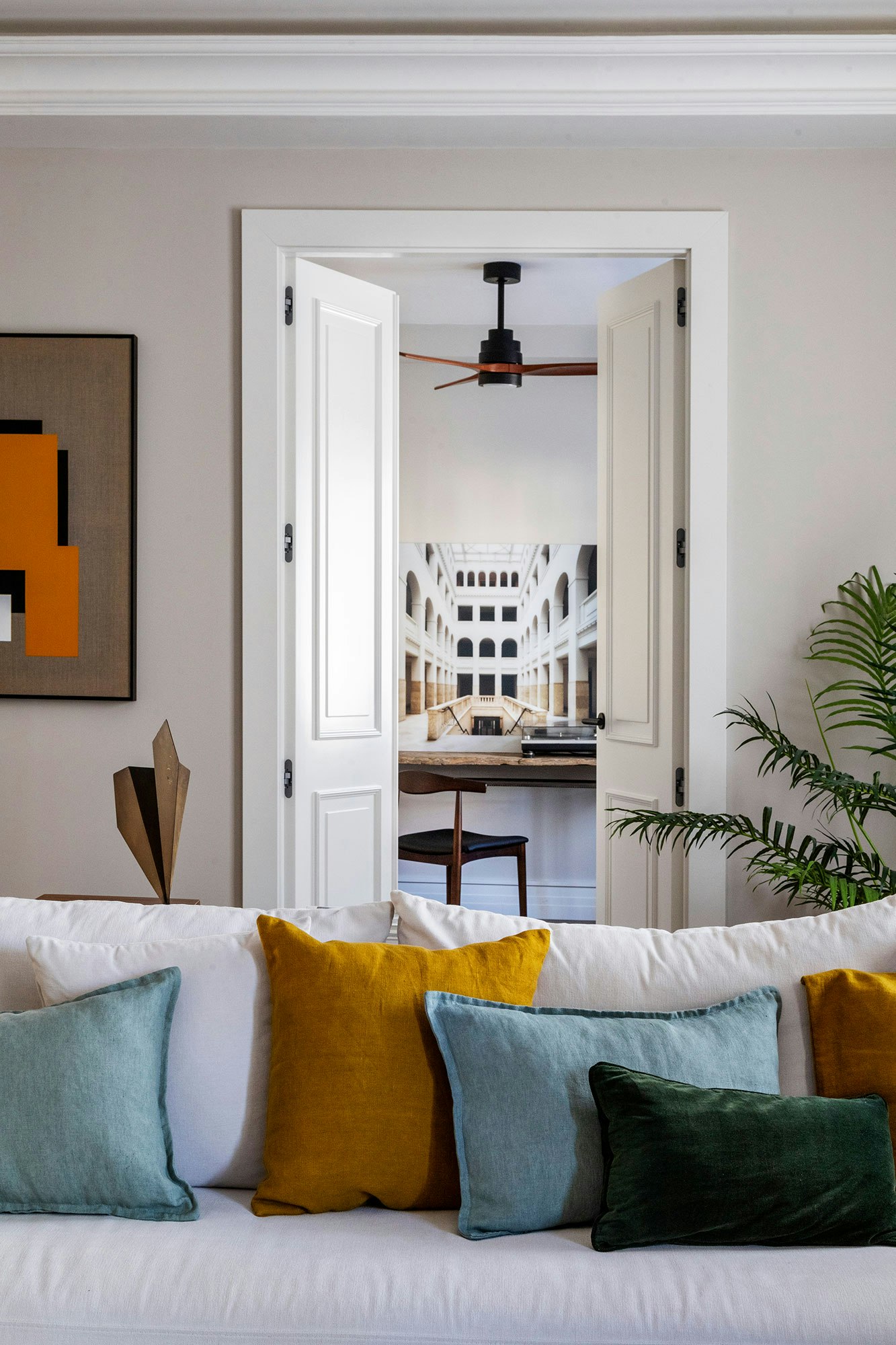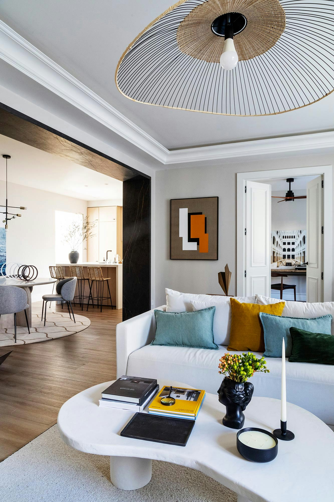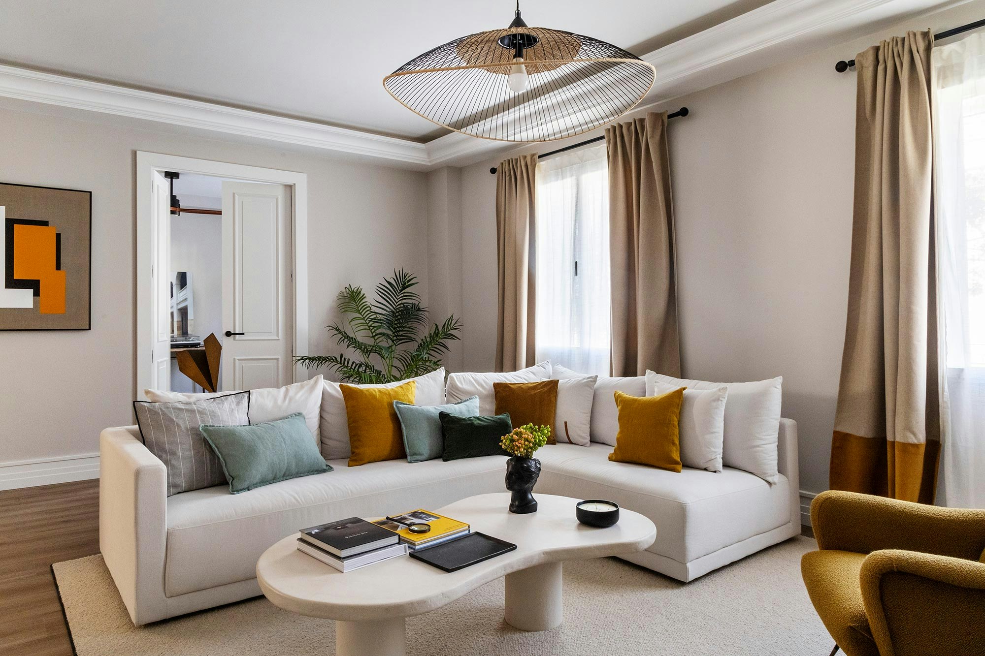 Located in a 1940s building, Javier de Miguel’s apartment has been meticulously designed to maximise open spaces, creating the ideal setting for socialising with friends and making the most of every square metre. As Javier explains, “the aim was to create very large communal areas where you can socialise and where you spend most of your time”. This philosophy permeates every corner of the dwelling, where a serene foundation of neutral tones is enhanced by splashes of colour introduced through carefully selected furniture, artwork and decorative elements.