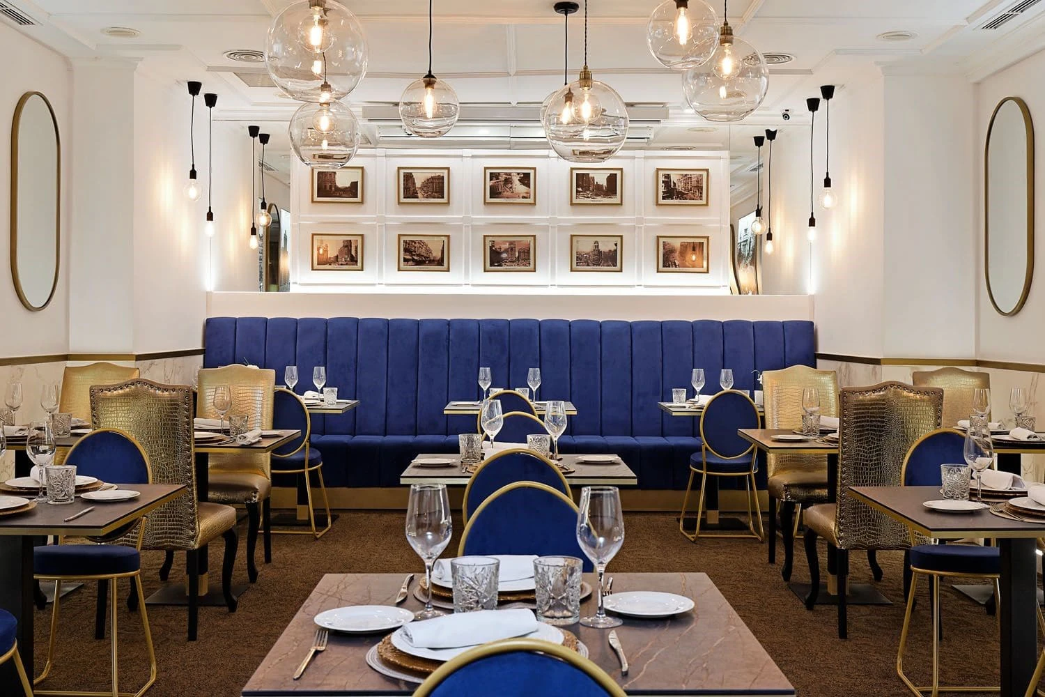 The finishes chosen by García Rubí for the refurbishment belong to Dekton’s Natural Collection and are inspired by classic marbles. The architect chose Dekton Dove, a beige and highly textured material, as a base, and then incorporated two veined surfaces, Dekton Entzo and Dekton Rem, for a very elegant result. As a counterpoint to this, the architect chose Dekton Laurent for the restaurant tables and bar. It is an almost black finish, with very subtle veins in earth tones.