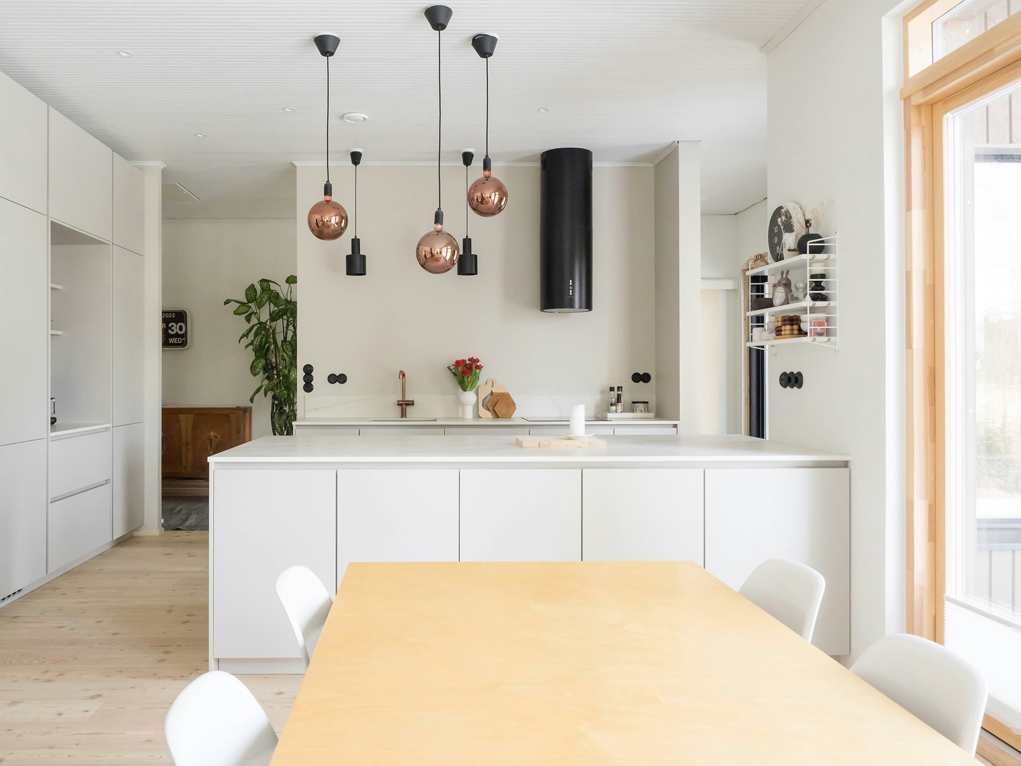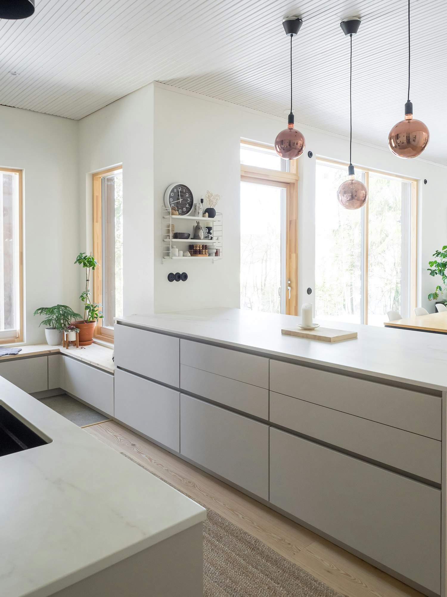 Piitulainen’s wish list for her home also included a peninsula with no extra functions and a large continuous surface, enabling it to be used as a practical serving table for parties. The peninsula worktop is used for virtually all everyday kitchen tasks from cooking to baking and arts and crafts. The worktop material runs from the worktop to a backsplash that catches most of the splatters near the sink.