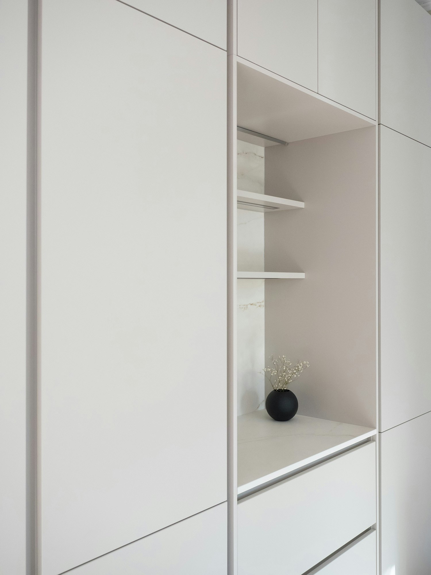 The cabinet includes a separate space, a so-called breakfast nook for a coffee maker. This space has Dekton on its back wall. This back wall was made of three separate parts, avoiding the need to drill holes for fixing the shelves. All the parts were cut from one larger piece, enabling the pattern to run continuously. As the thin back wall material is only 12 mm thick, support beams were added behind it to fill a gap between the cabinet frame and the wall.