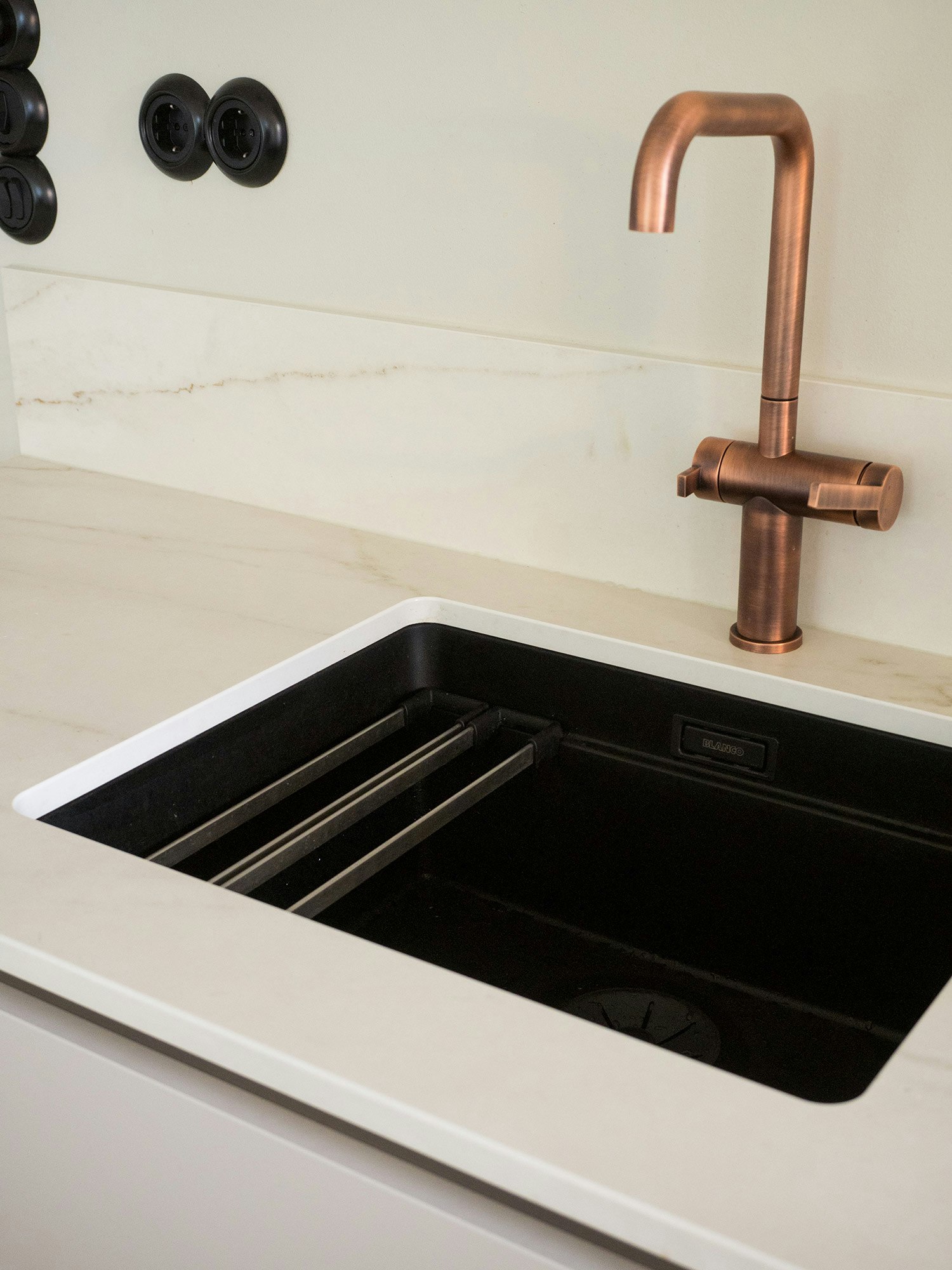 “The sink is installed under the worktop. Our old house had its kitchen sink installed over the worktop and it was a constant nuisance. The worktop requires constant wiping and the smooth edge of the sink is conveniently easy to sweep clean and dry. Lapetek’s matte black sink was initially sent to stone producer Ylämaan Graniitti so that it was already attached to the worktop prior to installation. The joint is very clean and finished,” Piitulainen observes.