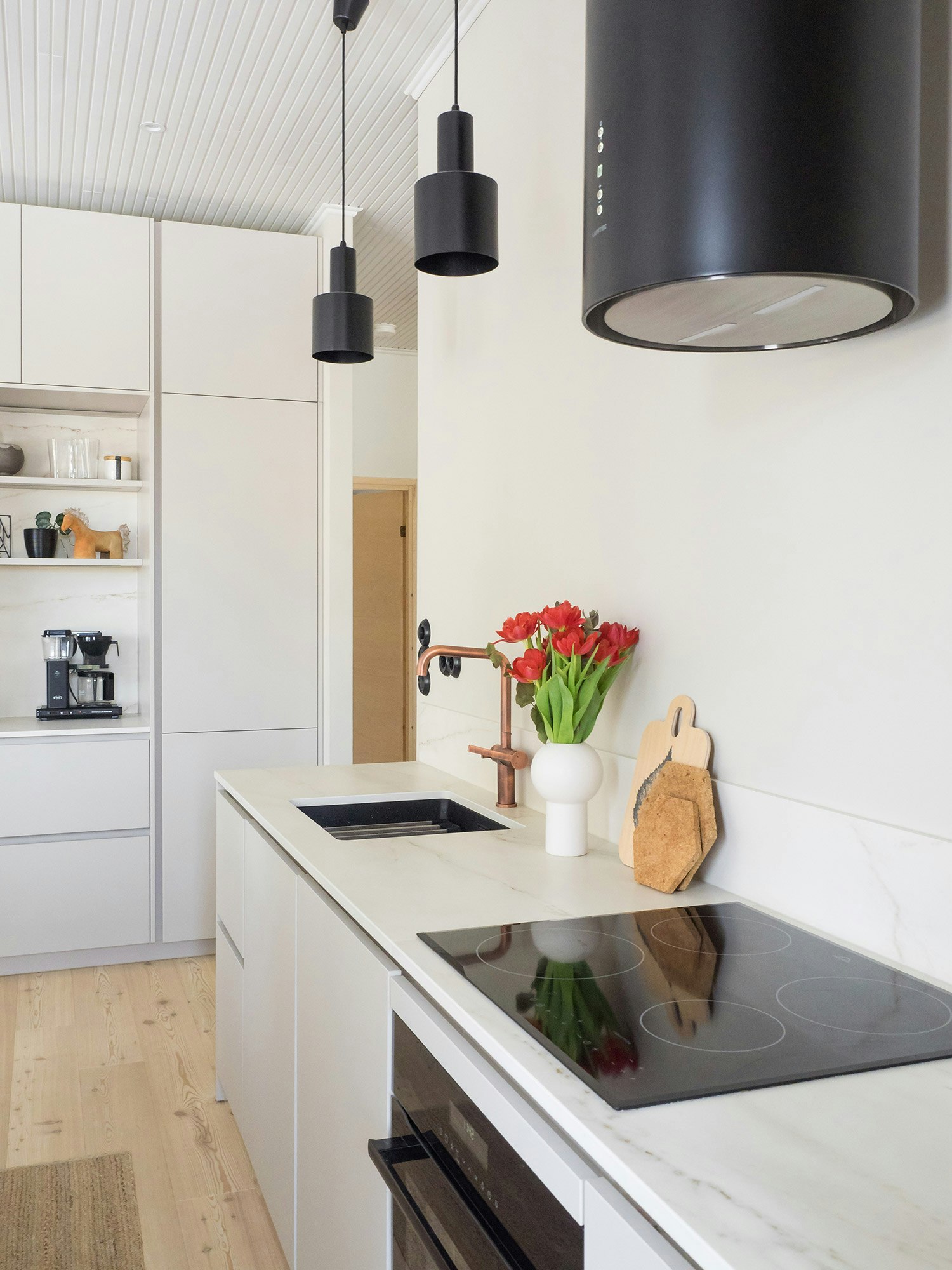 In this house, Piitulainen got the kitchen worktop that she had long desired. She was attracted by the material’s ease of maintenance, and it has proven to be a great choice. The matte finish feels so good to the touch that Piitulainen often brushes it as she passes. She chose a Dekton Rem kitchen countertop because of its soft colour and the material’s excellent properties. Rem goes well with the kitchen’s other surfaces and hues, such as the sandy Noblessa cabinet doors, copper Lapetek tap and Timberwise larch parquet floor. The combination of white, sand, black, copper and wood is calm and elegant.