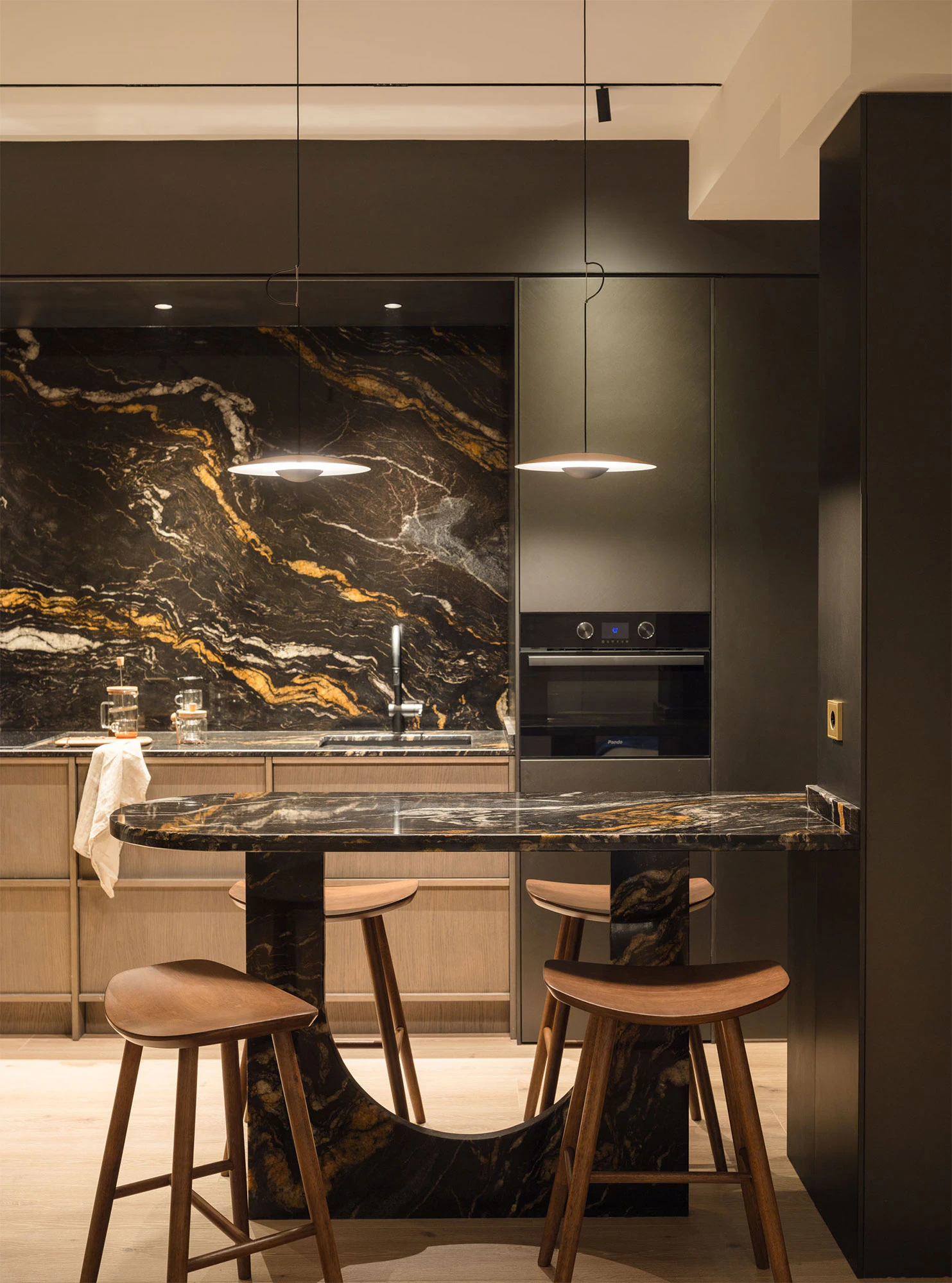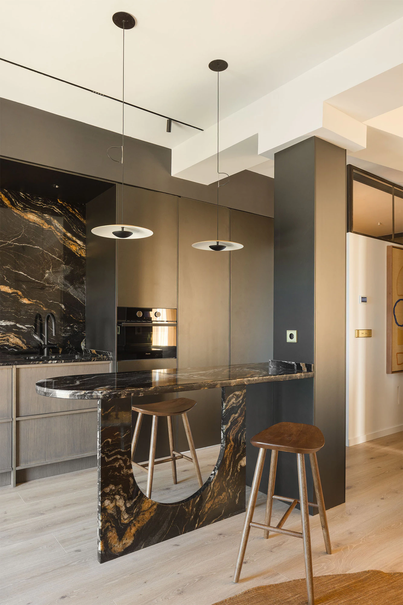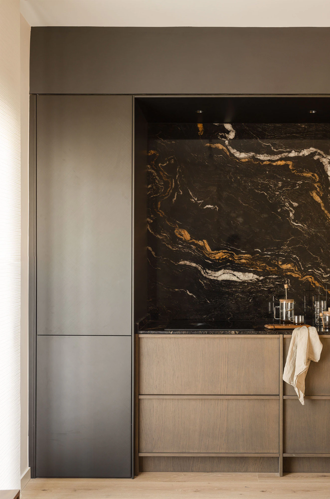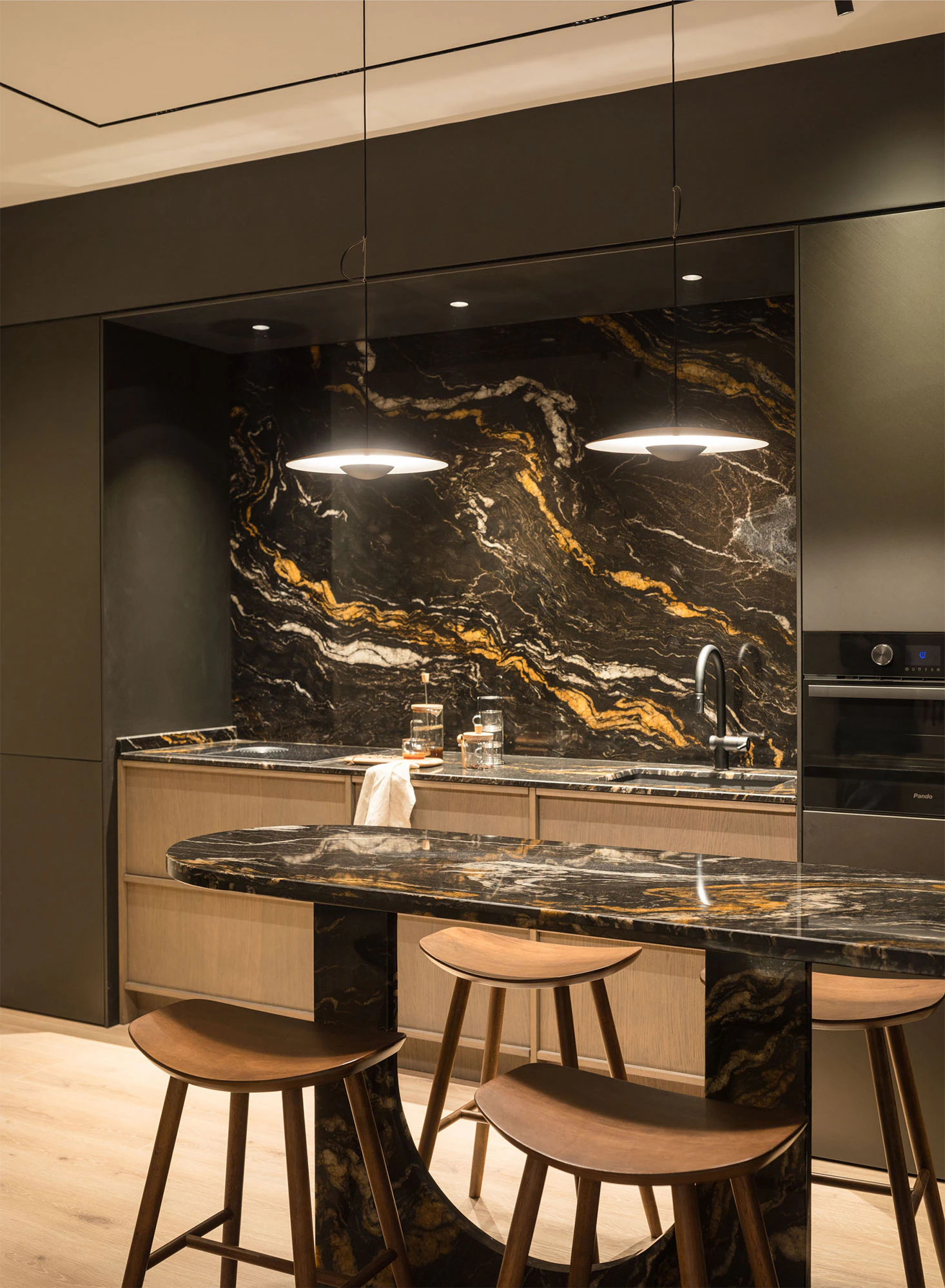 The use of Sensa Orinoco natural stone was essential to achieve this effect. This material was used for the worktop, the front wall cladding and the bar top, the latter integrated into a structural post that provides visual and functional continuity. “We chose Sensa because it is a natural material with a striking and unique design, in line with the minimalist but powerful approach of the project,” says Elias.