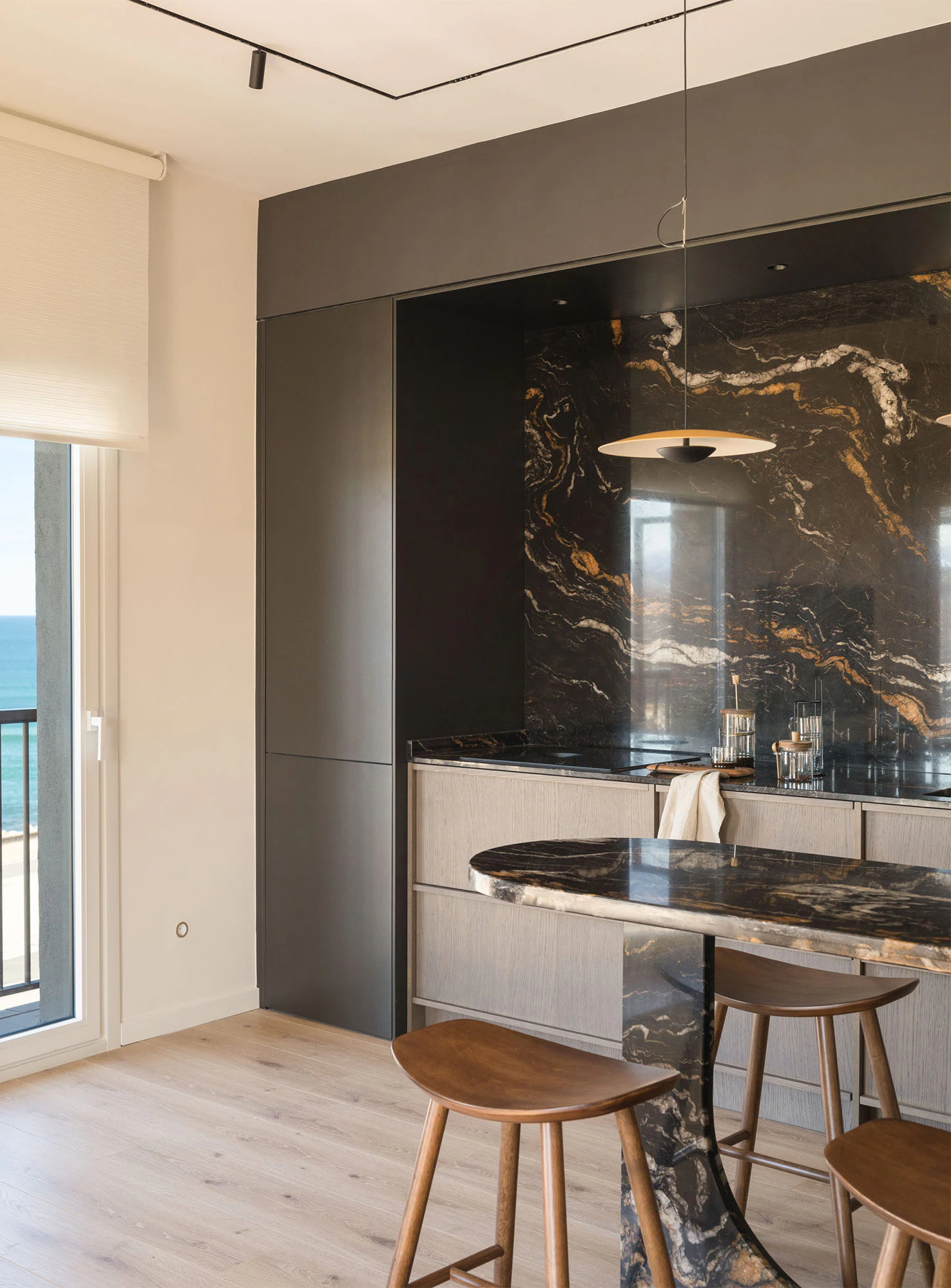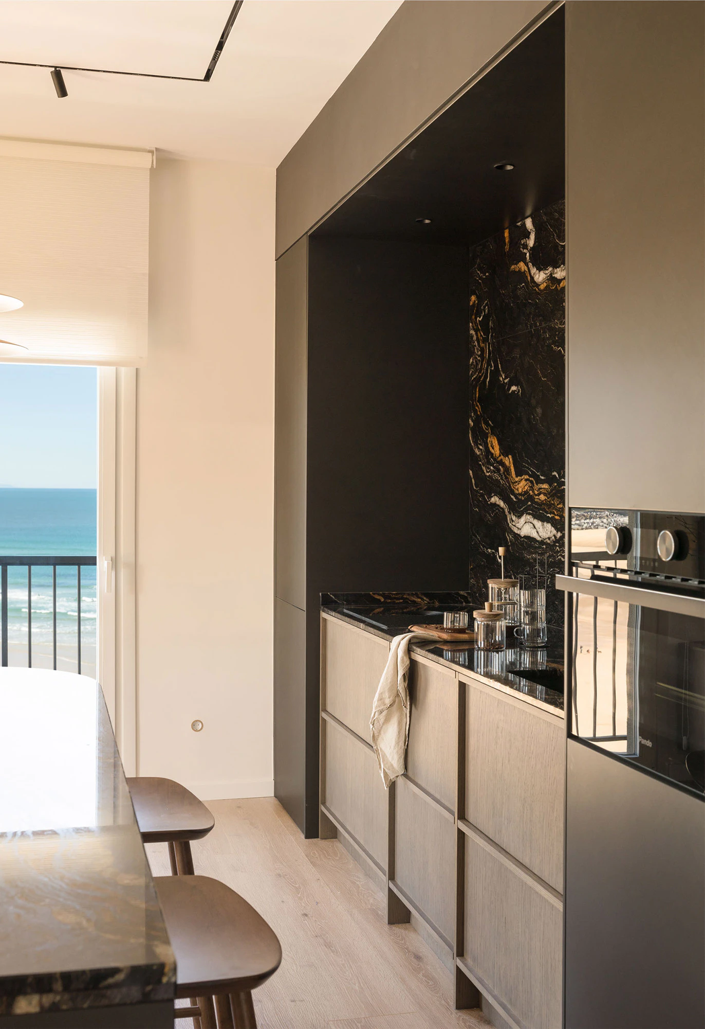 “It is a minimalist kitchen integrated into a small flat with spectacular views,” says Amaia Elias, founder of Amai Studio. “The customer wanted a functional, visually stunning space, as this was to be used as a second home for relaxation.” This premise guided the entire project, in which the kitchen not only fulfils a practical role, but also becomes a design centrepiece. “The kitchen was designed to take up little space, but be the star of the design and integrate perfectly with the living room,” she says.