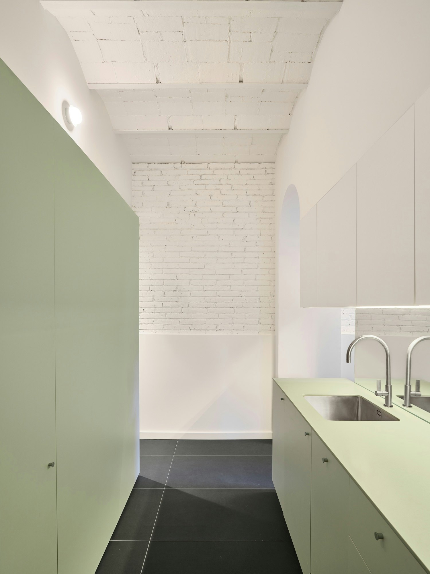 The materiality reinforces this new interpretation. A palette of green tones highlights the metal elements and interacts with the exterior vegetation, while the recovered ceramic vaults and neutral finishes create a serene and balanced atmosphere. White acts as a common thread, unifying the whole and accentuating the contrast between the existing and the new intervention.