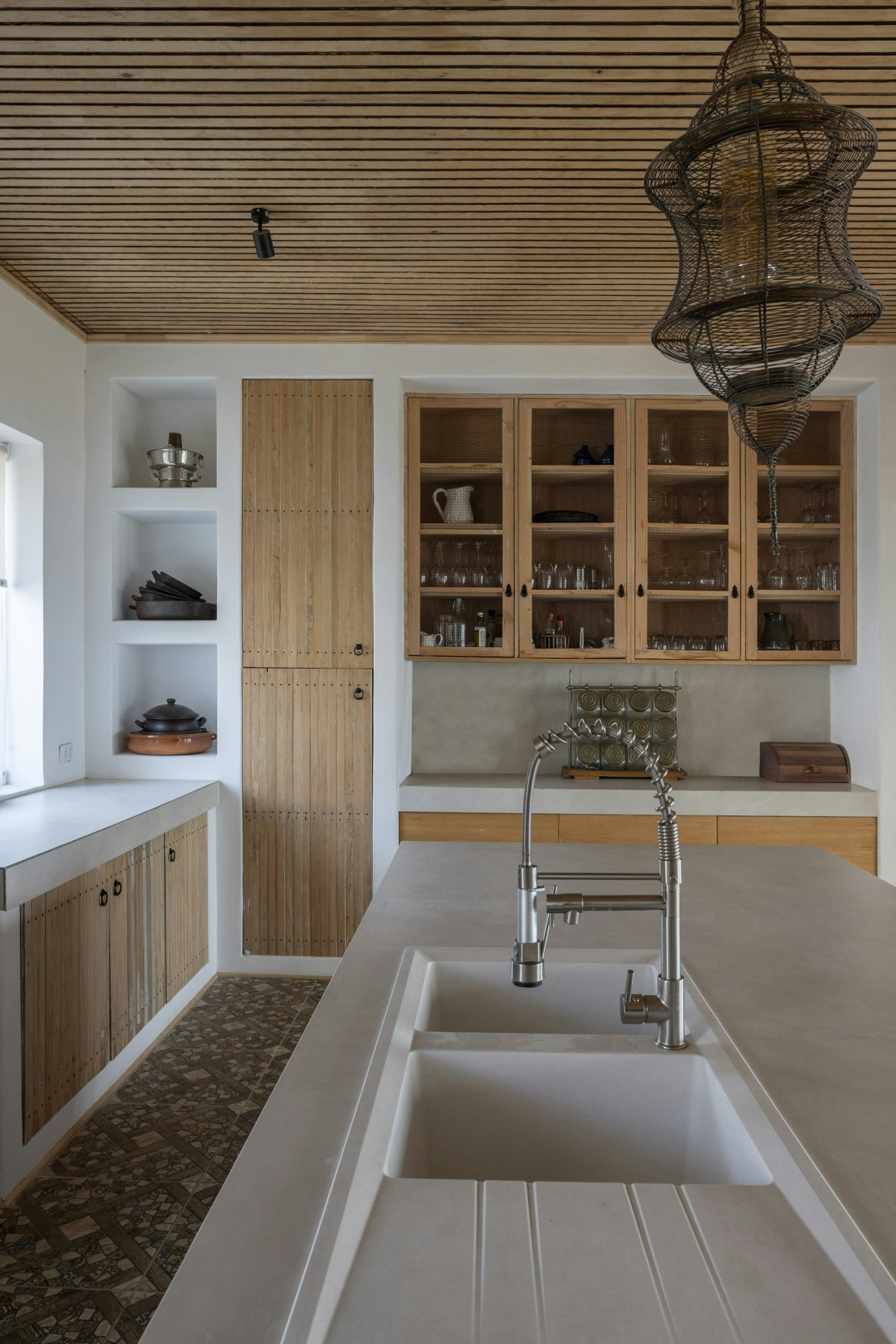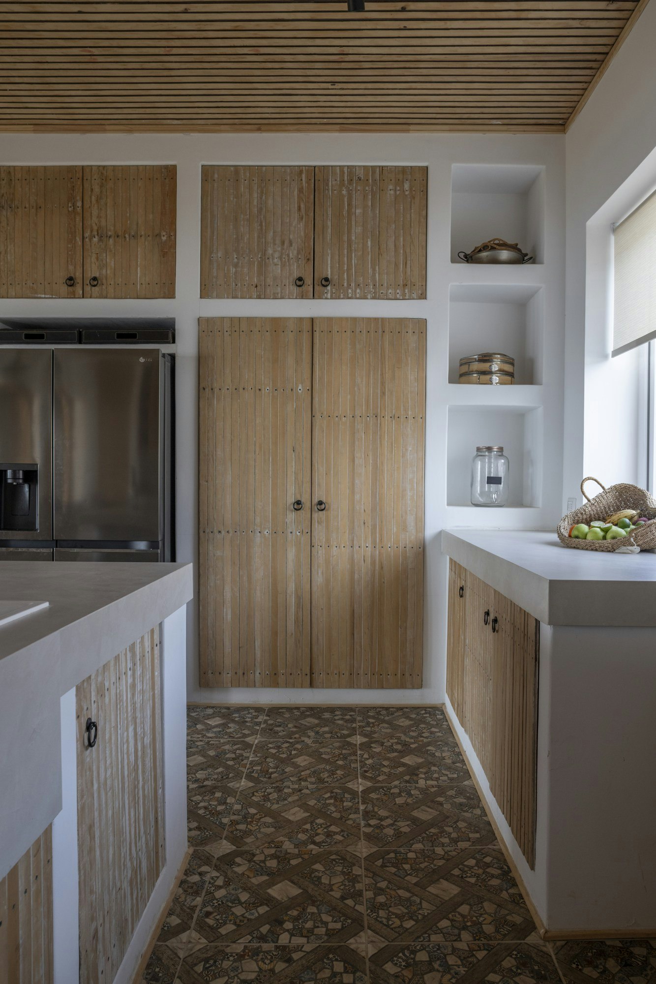 Among the most notable elements are the original ceiling clad with local wood, which adds warmth and authenticity, and the furniture doors made from the house's original shutters, carefully restored and reused. “This approach allowed the preservation of the place's memory, giving a new purpose to existing elements without altering the serene and timeless character of the home,” notes Aguirre Iduya.