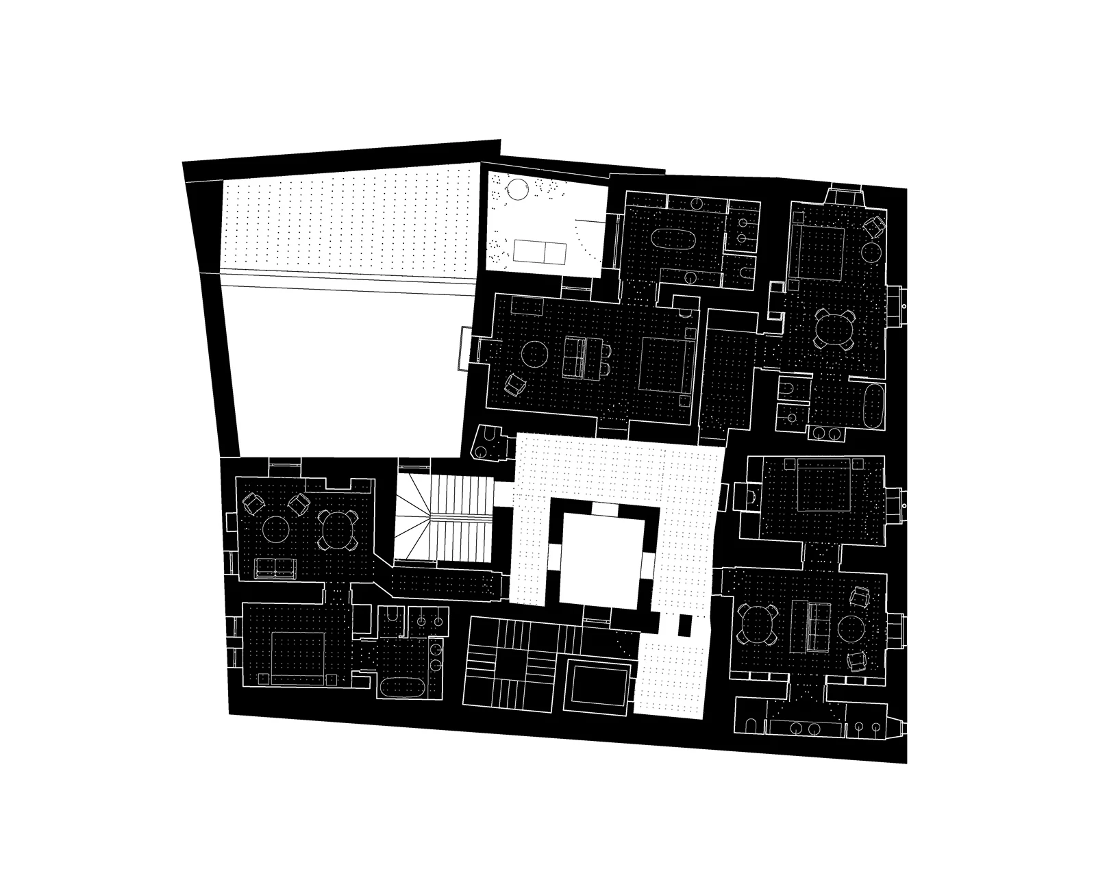 The renovation project respects the existing structure, and defines a diagonal sequence that goes from the entrance hallway to a rear courtyard and adapts the new architecture to the different forms of the stately building. The original spaces are lined with a second skin of wood, from the domes on the ground floor to the coffered ceilings in the upper levels, giving the solid mansion a warm tone. Finally, the topped tower regains its original height, and in this way recovers its prominent role in the city.