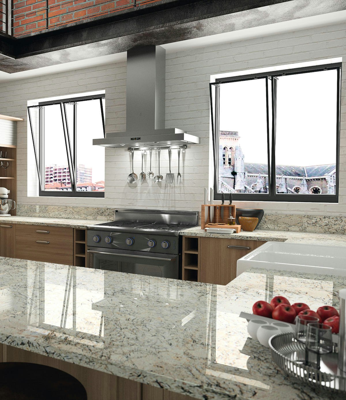 Therefore, all types of formats are made with this stone (depending on its properties), such as slabs or tiles. In addition, it is used in an endless number of commercial and custom-made pieces to create floors, wall cladding, kitchen or bathroom countertops, as well as claddinges behind the cooking area or sinks. Granite stands out as the main material in many contemporary kitchens and bathrooms, and its use is almost unlimited.