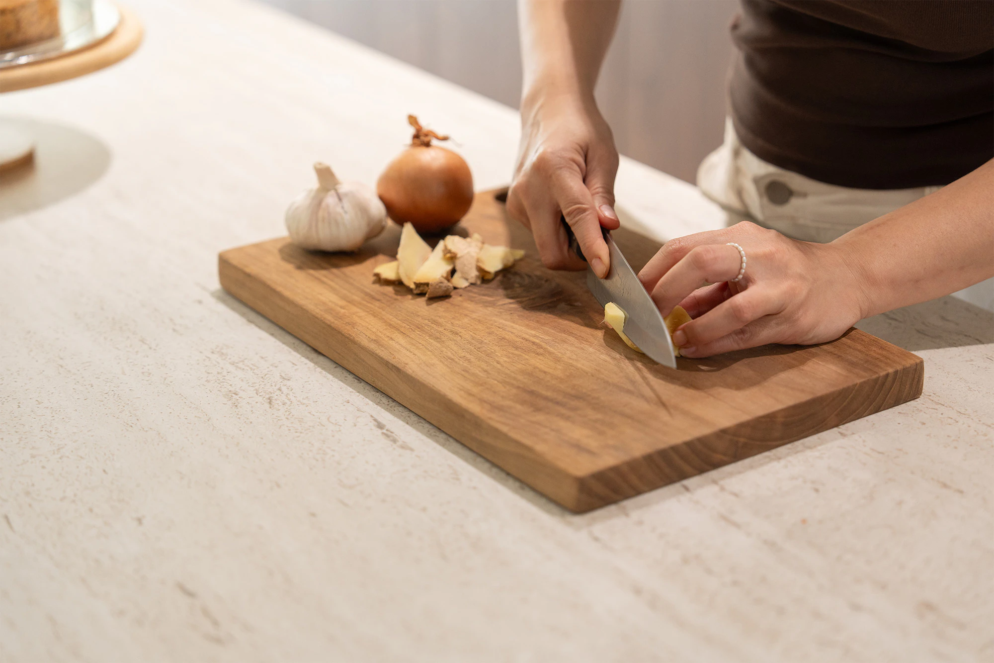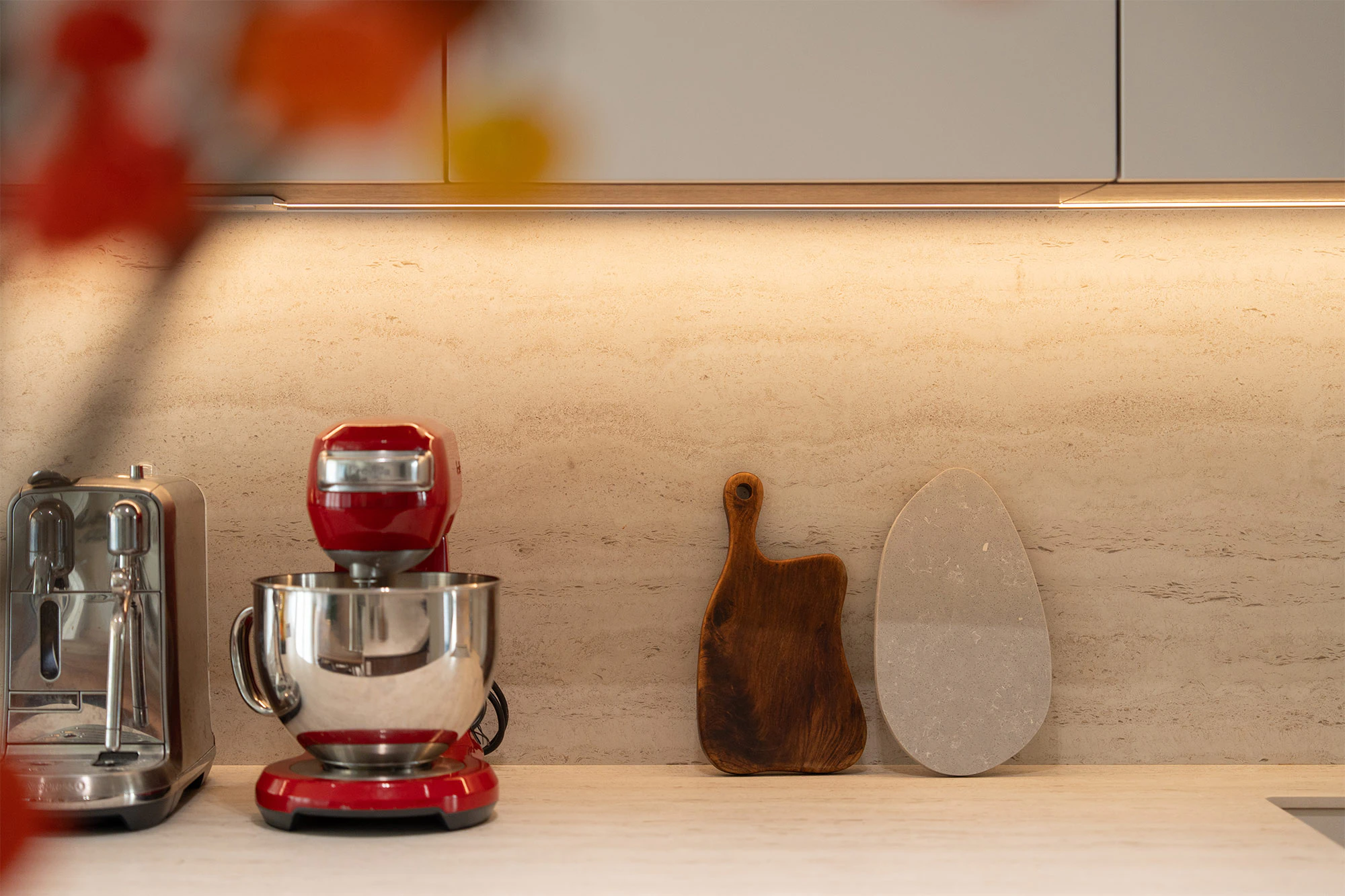 “I chose Dekton Marmorio for the kitchen because I love the look of travertine and have used it in several places in my house. However, travertine is a porous material, so I chose Dekton Marmorio because of its very similar appearance. I like that it has horizontal patterns that emphasise the linear shape of my kitchen,” says Red, demonstrating her attention to detail and the importance of every little decision.