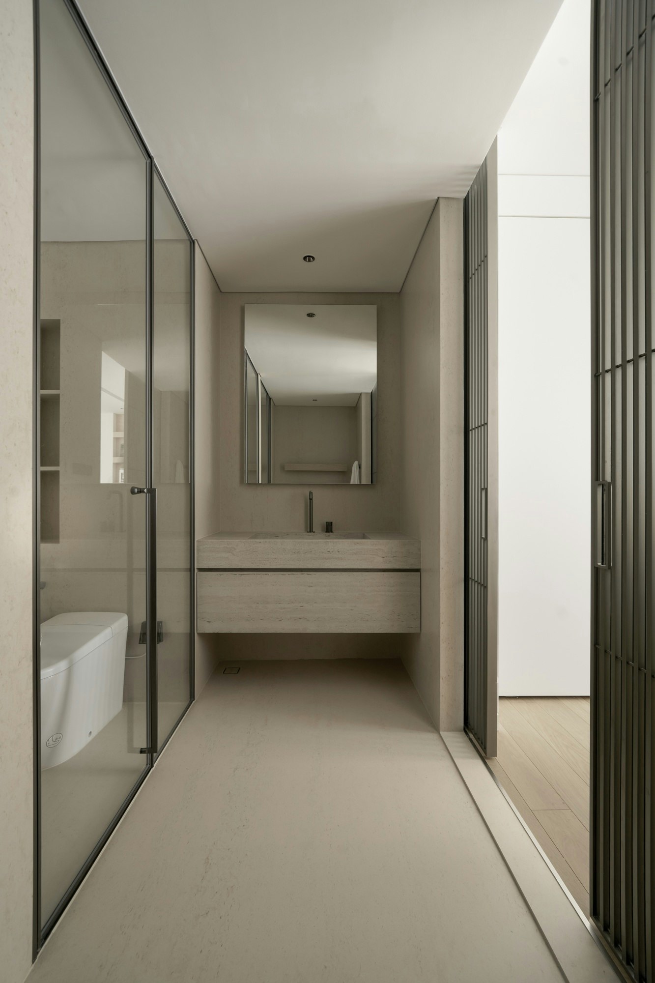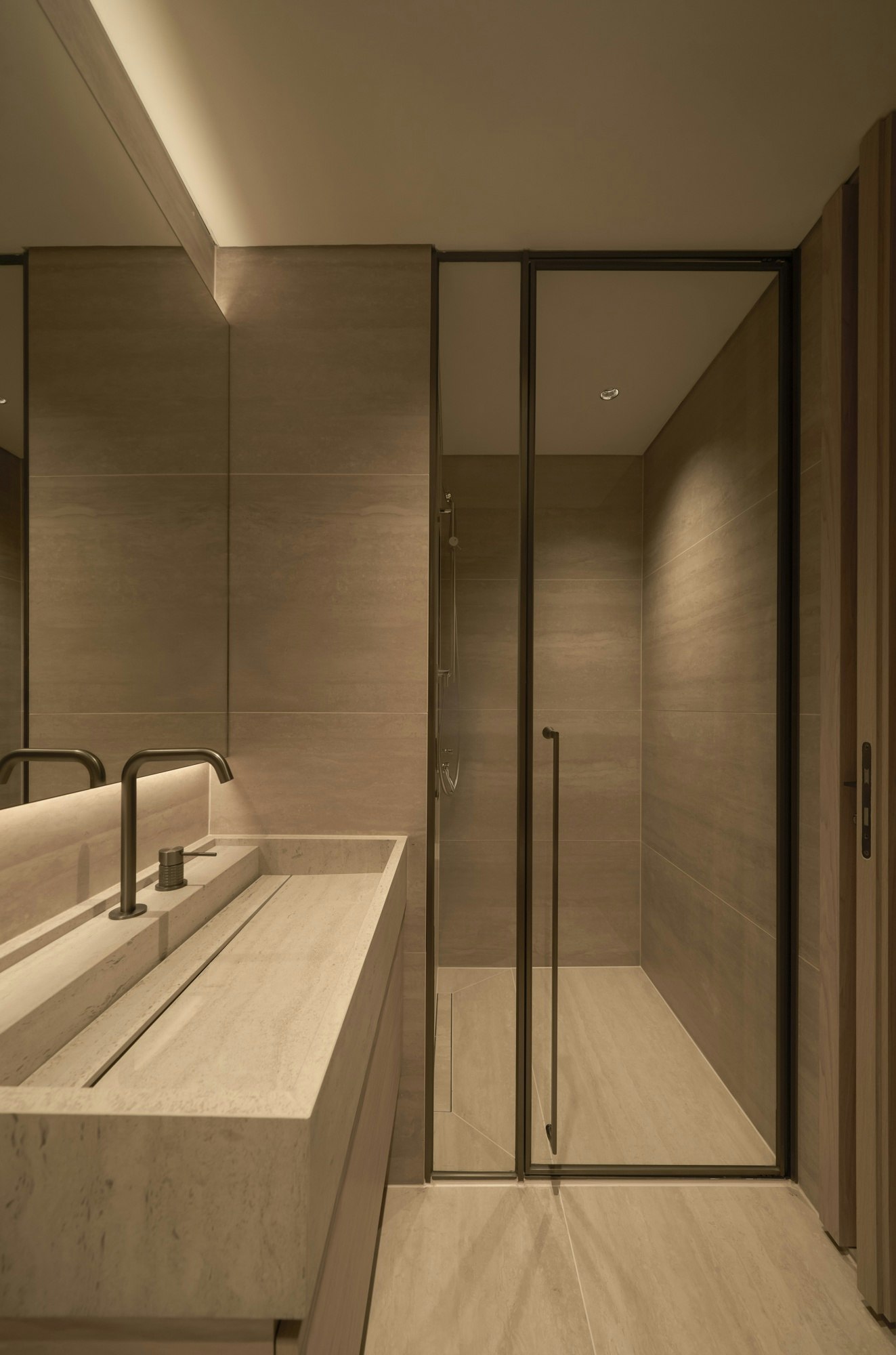 “Dekton, by Cosentino, offered precisely that: aesthetic harmony, high performance under pressure and freedom in shapes,” explain the architects. The team particularly valued the four-millimetre slabs, as they provided the flexibility needed to maintain design precision on surfaces as varied as vertical walls, floors or sinks. They also appreciated their large size, which offers a virtually seamless finish perfect for reducing visual clutter, as well as their tonal consistency, which helped them create a cohesive narrative across all rooms, an ‘invisible thread’ now connecting the different areas of the house.