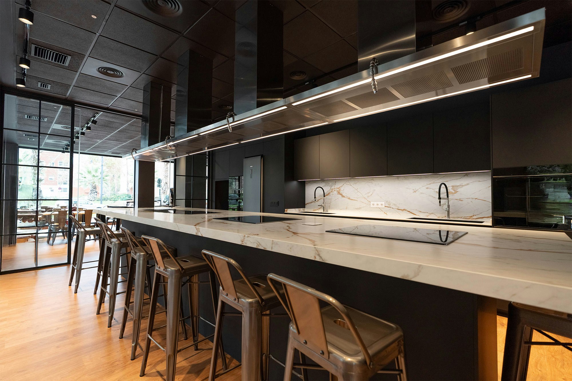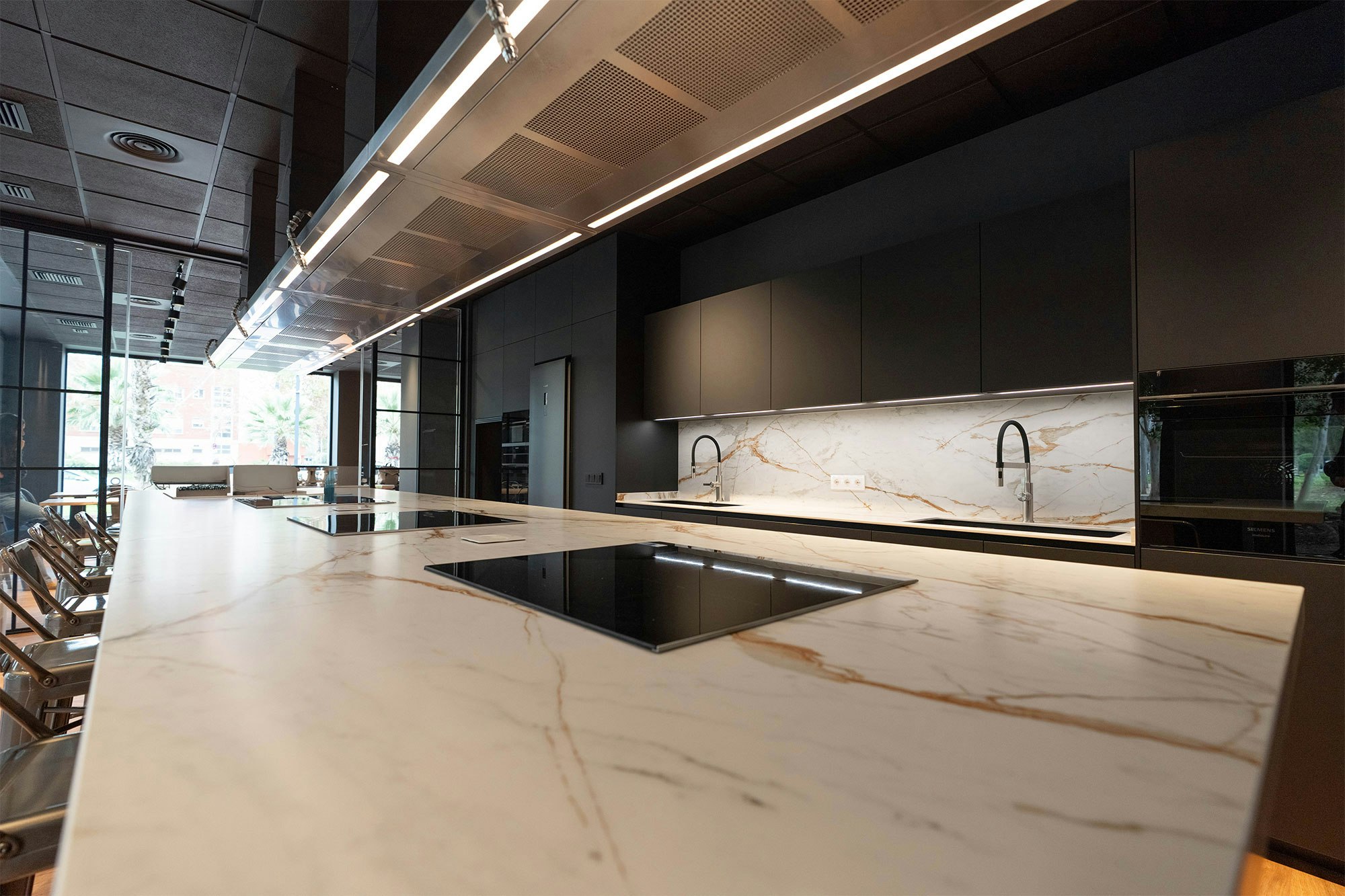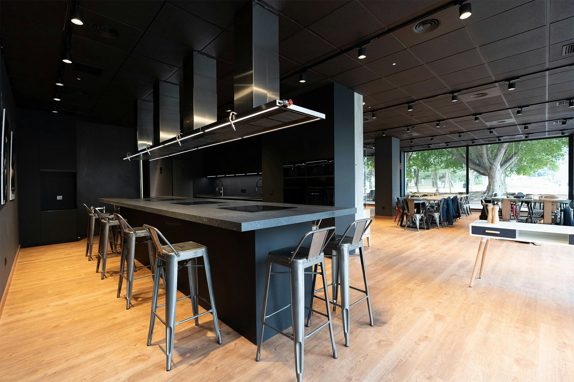 Thanks to its exceptional durability (Dekton is resistant to abrasions, scratches, impacts, high temperatures, and stains), students can cook directly on the worktop. Thus, even cutting on it or placing pots straight from the stove, Santos remains at ease, knowing the surface will stay intact.