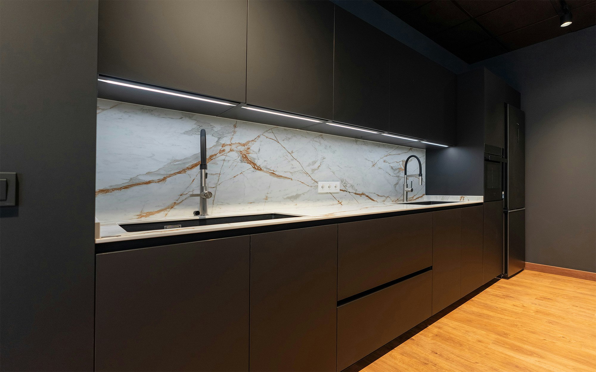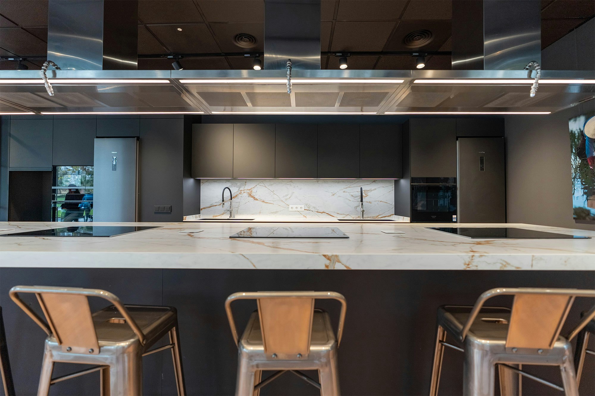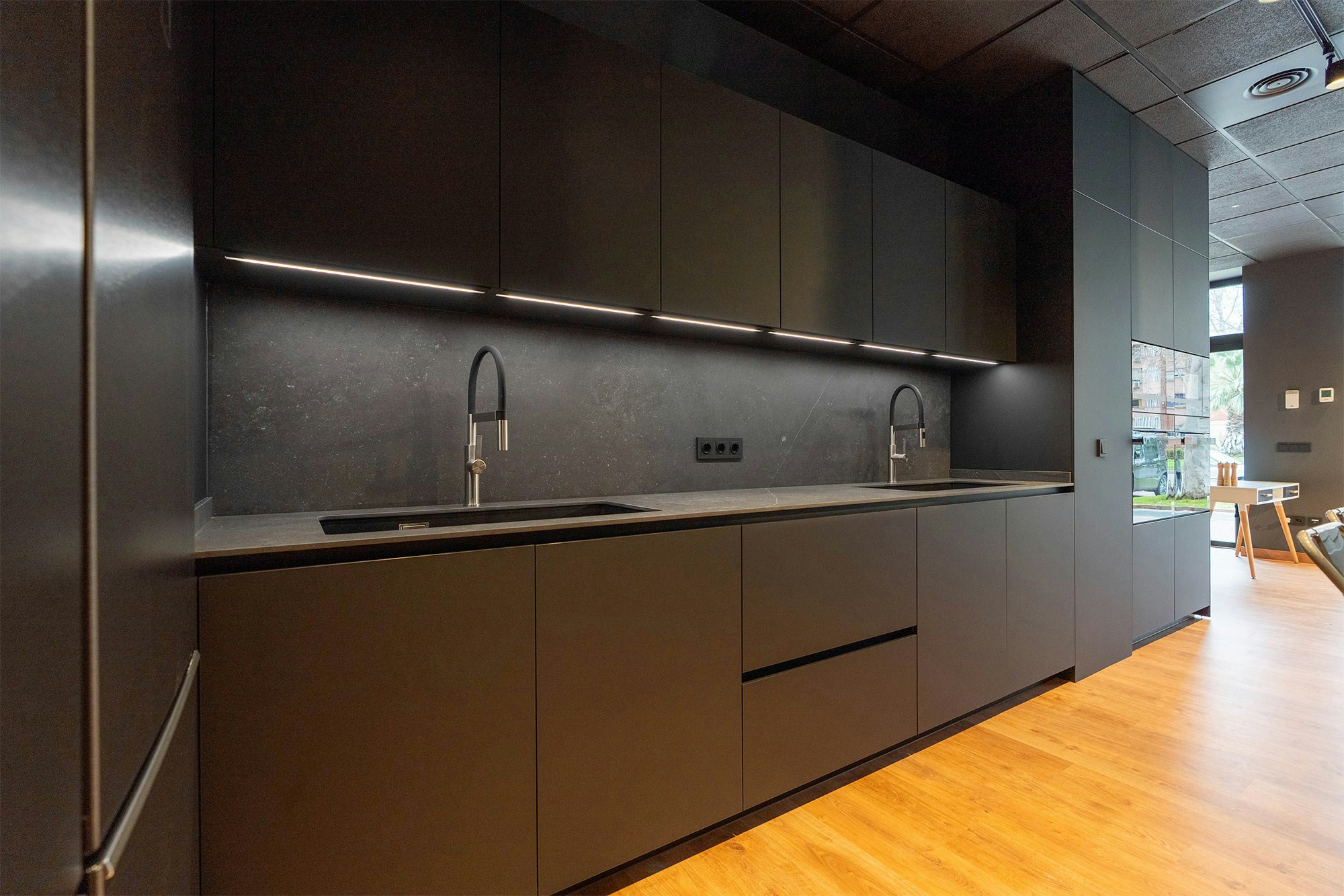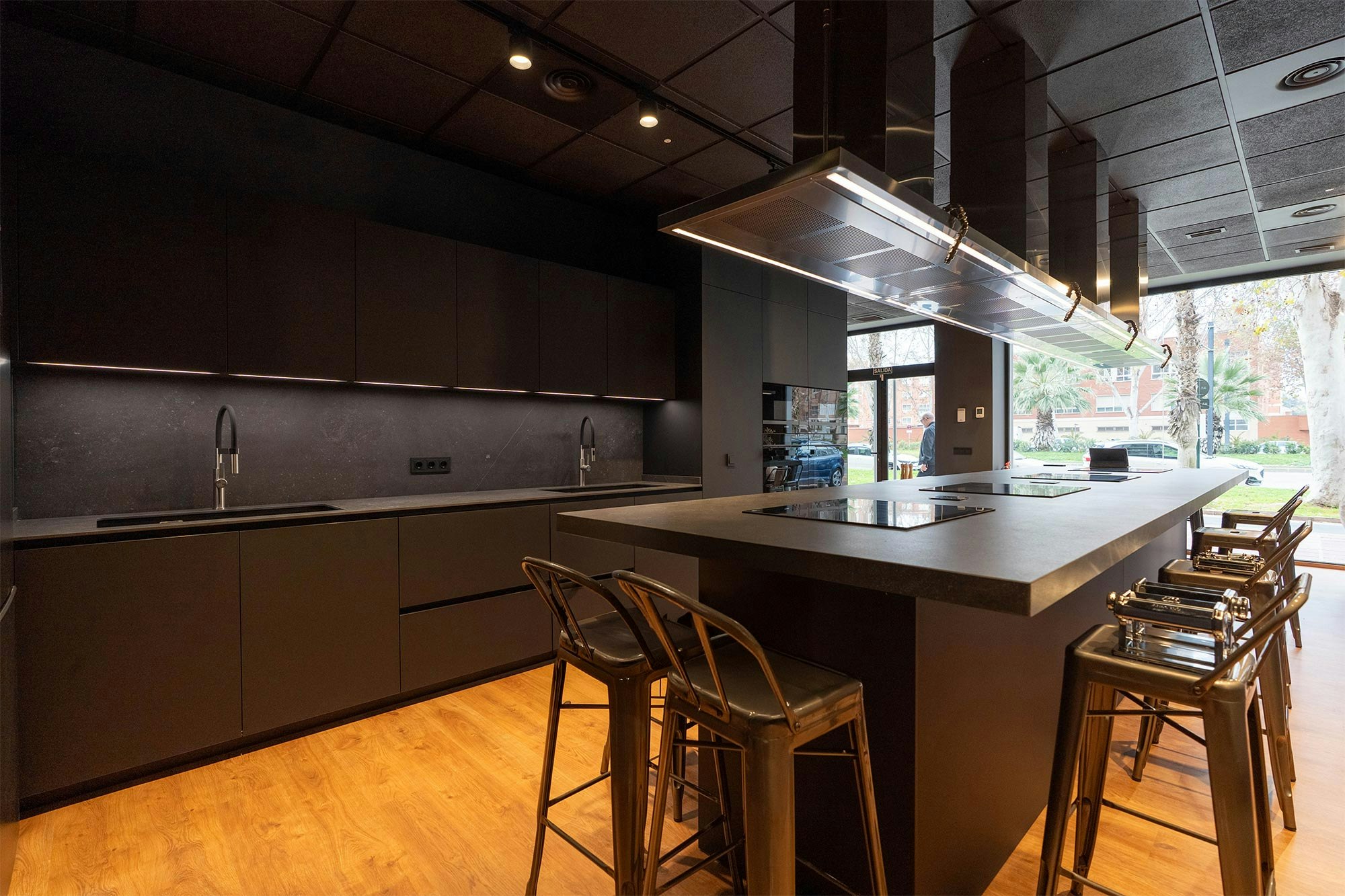 Thanks to its exceptional durability (Dekton is resistant to abrasions, scratches, impacts, high temperatures, and stains), students can cook directly on the worktop. Thus, even cutting on it or placing pots straight from the stove, Santos remains at ease, knowing the surface will stay intact.