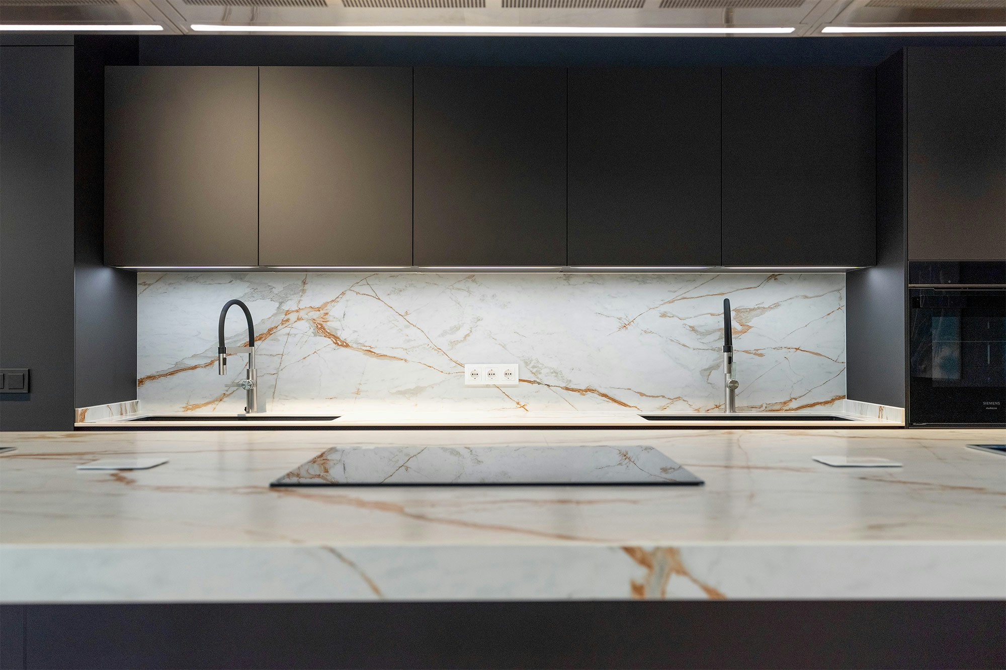 Island worktops, wall cladding, washbasins