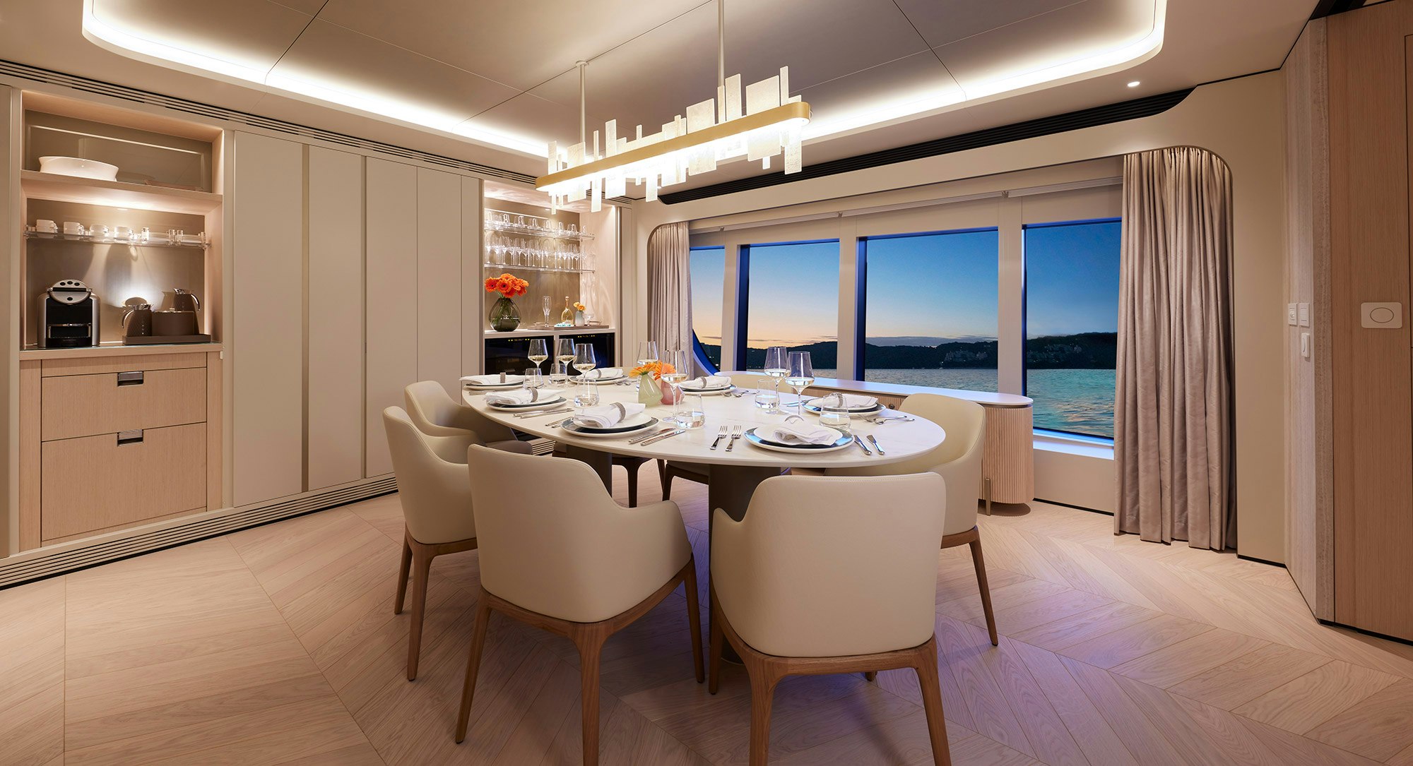 Dekton Rem, a white color with subtle veining, was selected, perfectly in line with the color scheme that mixed oak wood, champagne, and off-white tones. The use of Rem in different applications throughout the yacht helps create a sense of continuity and the calm, clean, and comfortable aesthetic the designer wanted to achieve.