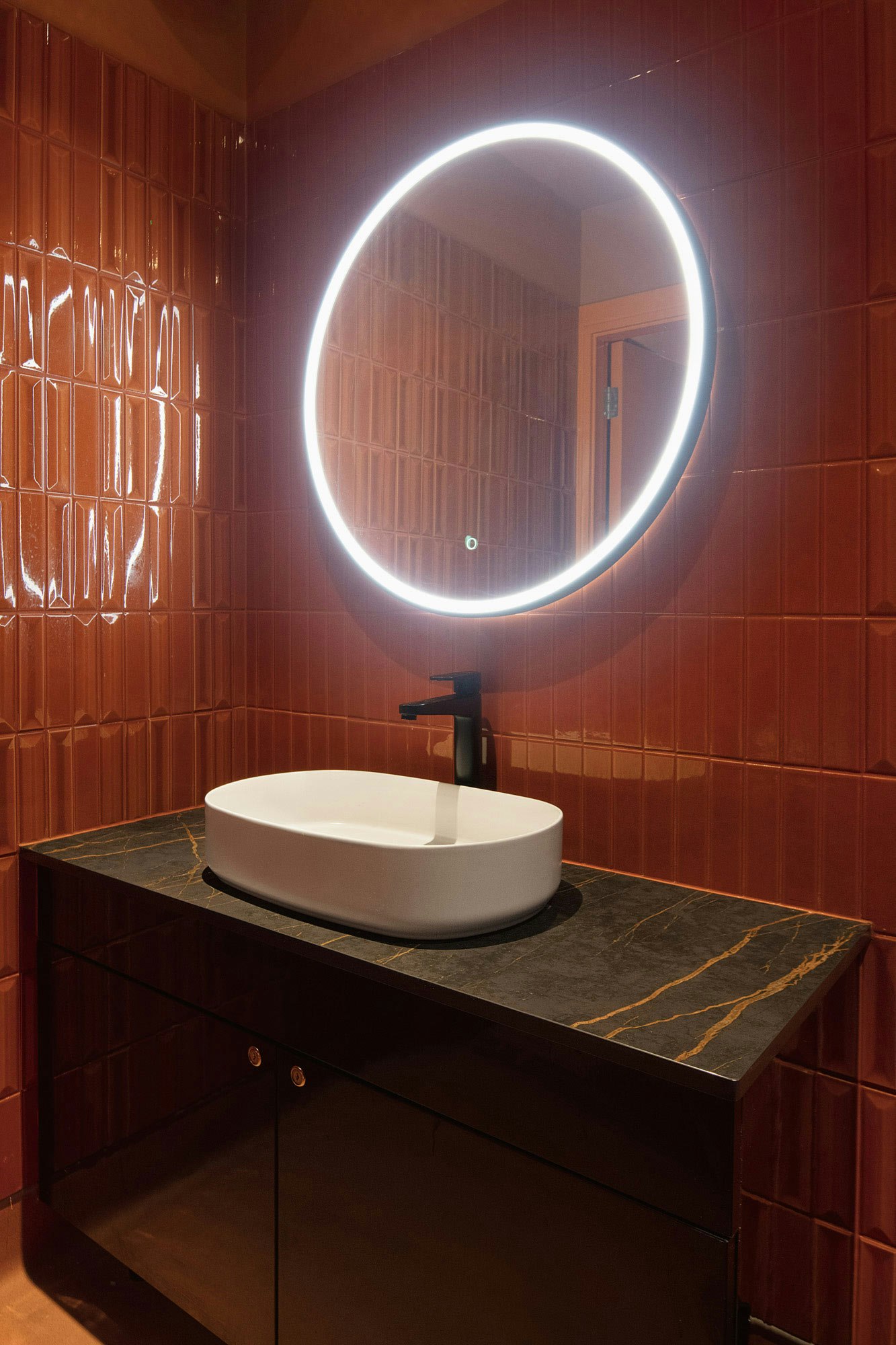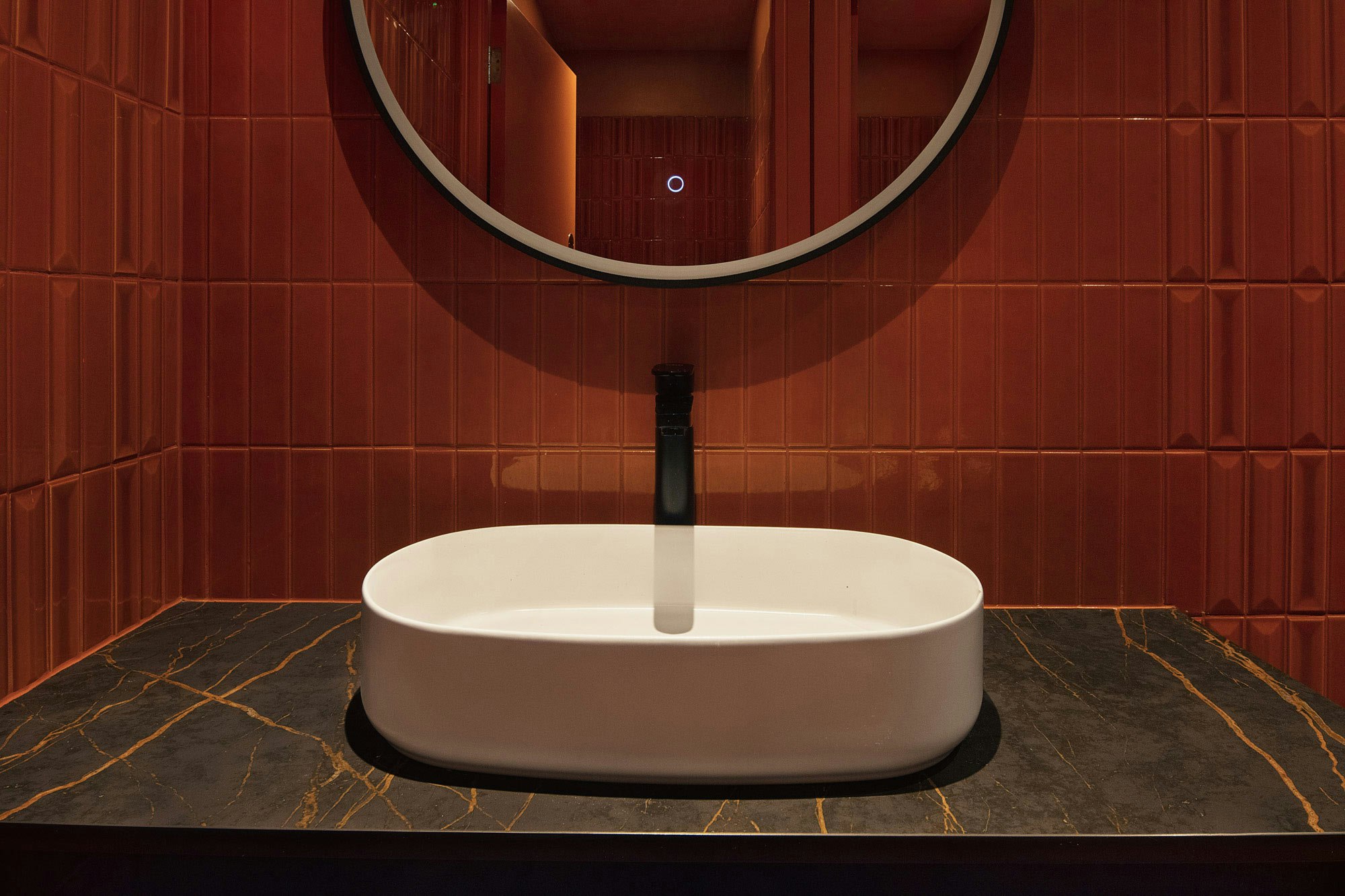 Cosentino is also present in the bathrooms, where the antibacterial properties of this stone and the look of Dekton Laurent work hand in hand. “The women’s toilet is quite an experience, the immersive orange colour and gives off that ‘wow’ factor. When I chose the orange tiles, the orange flooring and the paint, I knew combining it with Dekton Laurent with its cinnamon veins looked absolutely spectacular. We wanted it to have a motorised disco ball in the ladies' bathrooms and later Gaz decided to sync this to music. It is totally an unexpected addition and it is so much fun” says the designer.