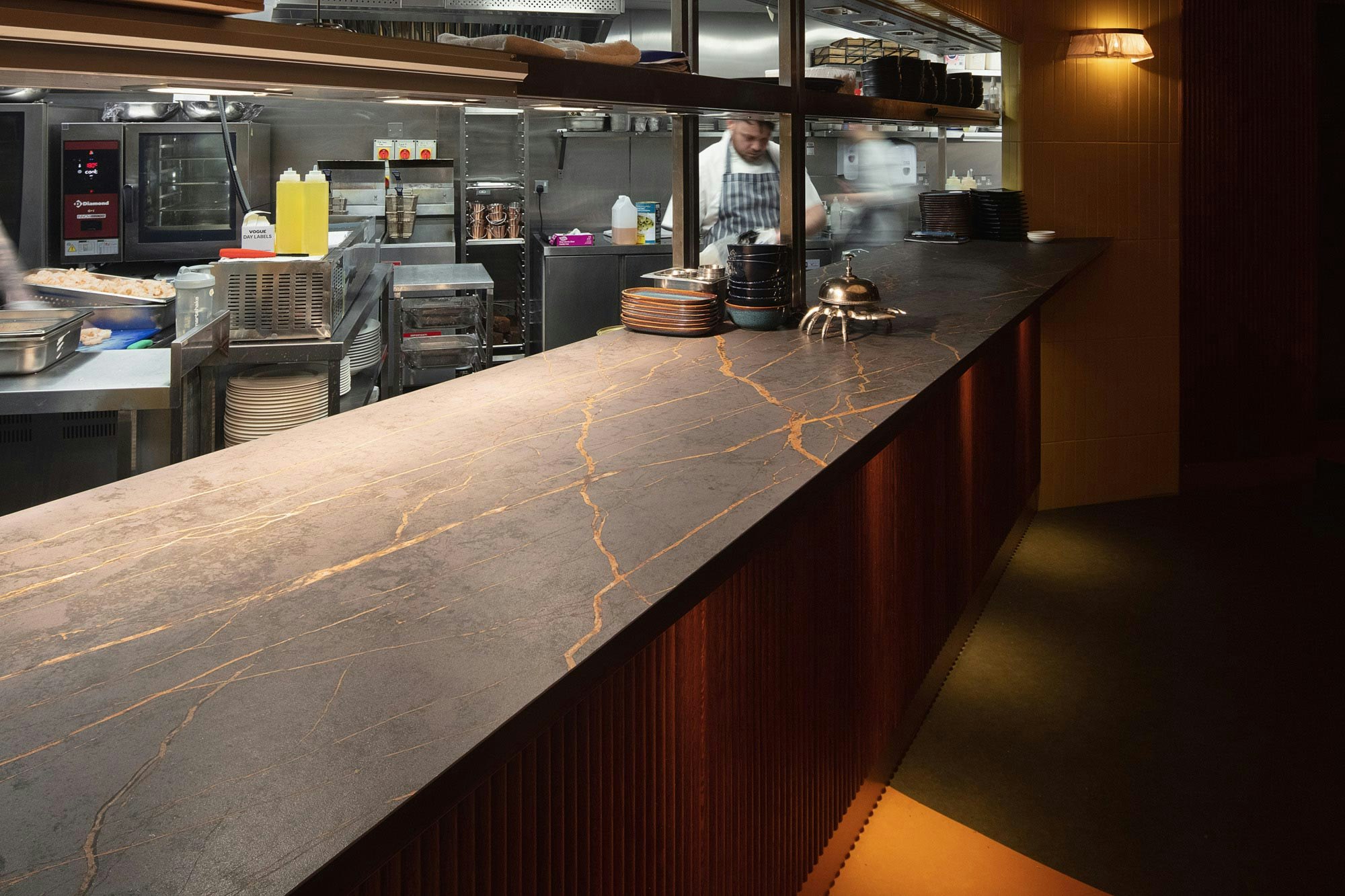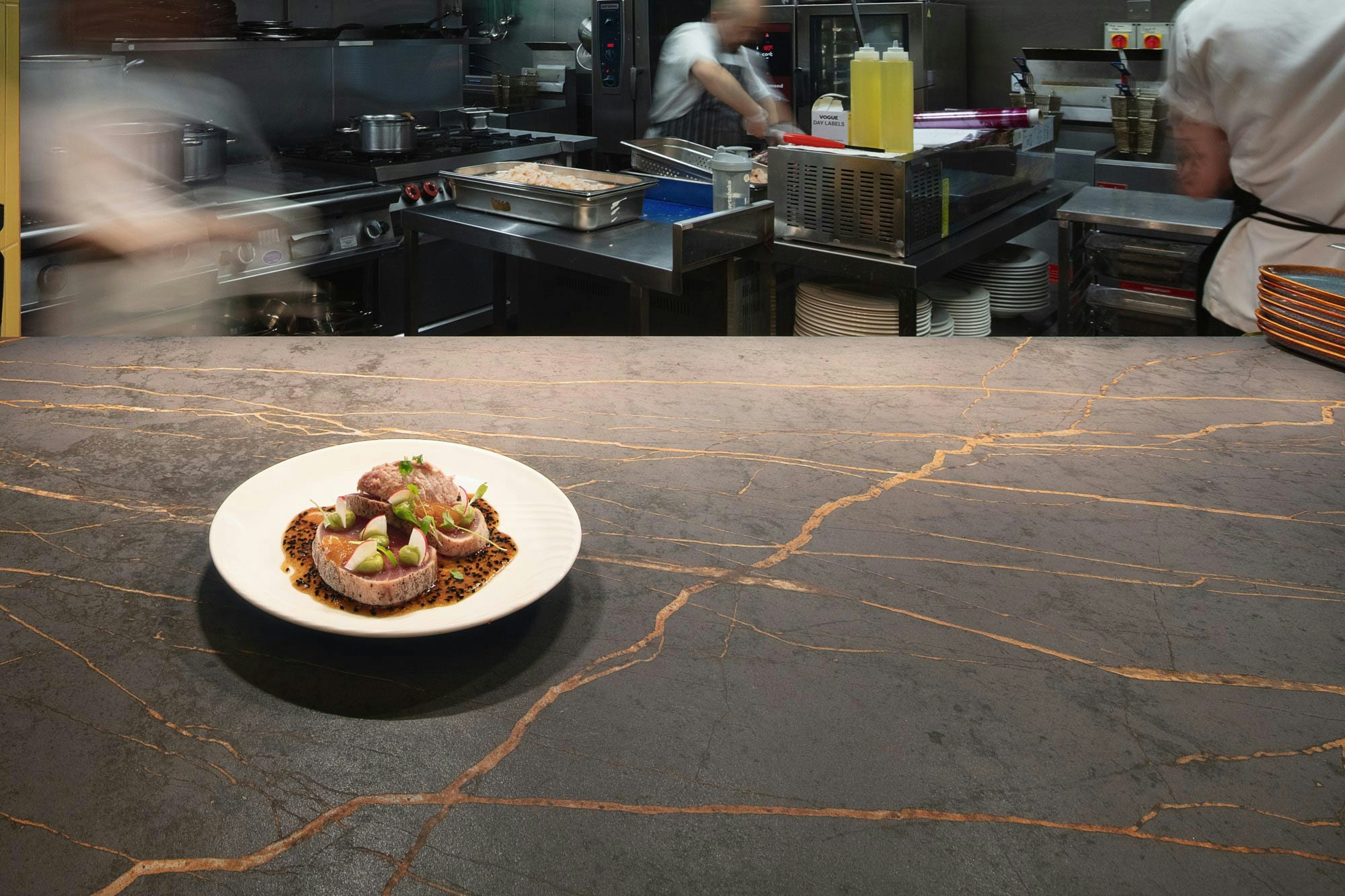 “I was attracted to both the colour and the texture of Dekton Laurent. I like the kind of velvety feel it has, and also the fact that it’s not too reflective, there are lots of reflective surfaces in the restaurant and I wanted a contrast with the tables. I also was influenced by Dekton’s antibacterial properties: Dekton is easy to clean, highly durable and, quite simply, beautiful.”