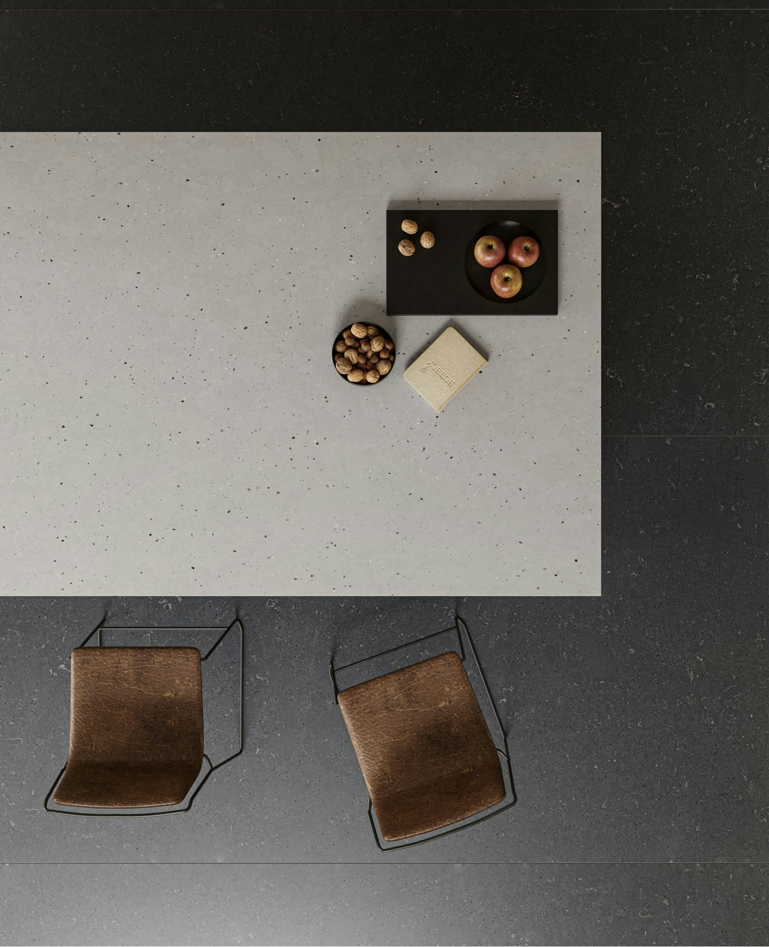 This new coppery brown color reminiscent of fine-grained sandstone brings texture in the perfect measure. Elegant and warm, it blends perfectly with the gray tones, leather and black accessories of this minimalist industrial kitchen.