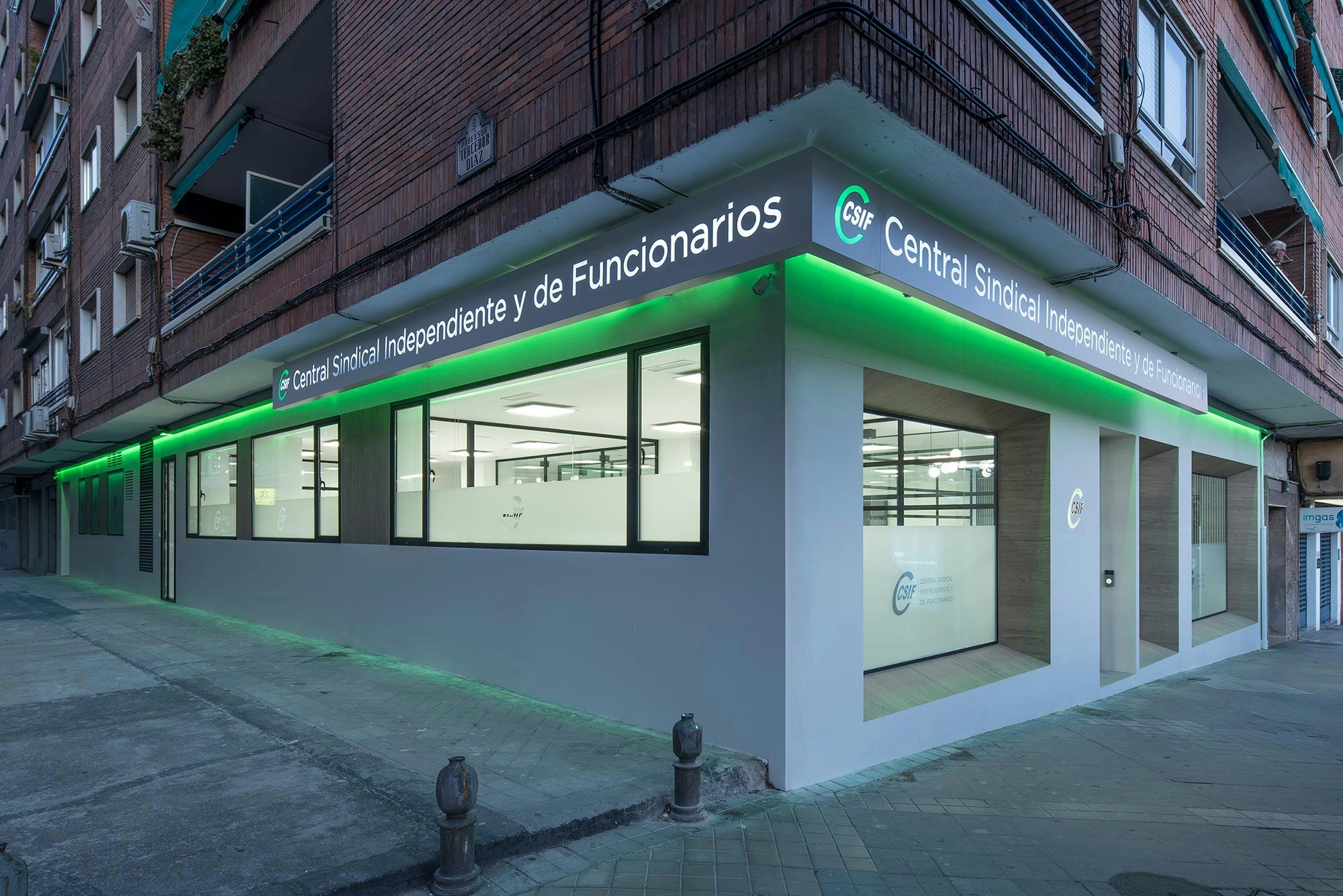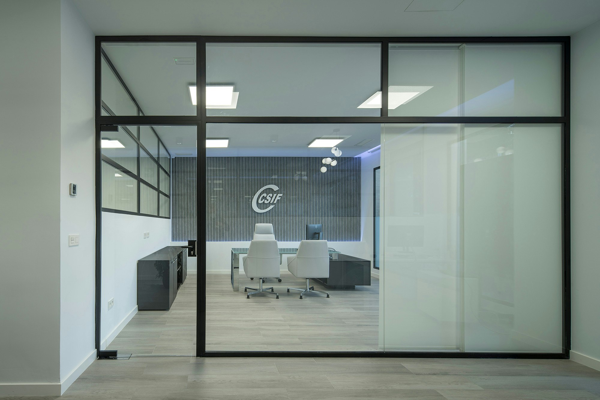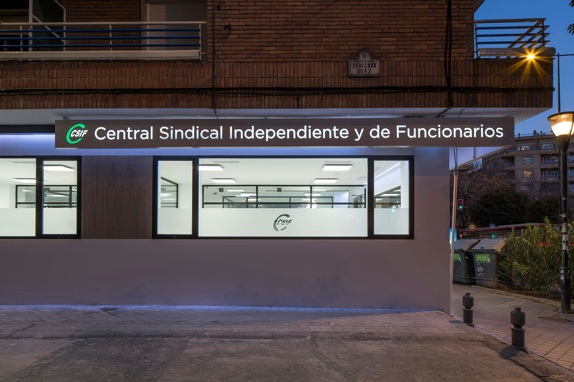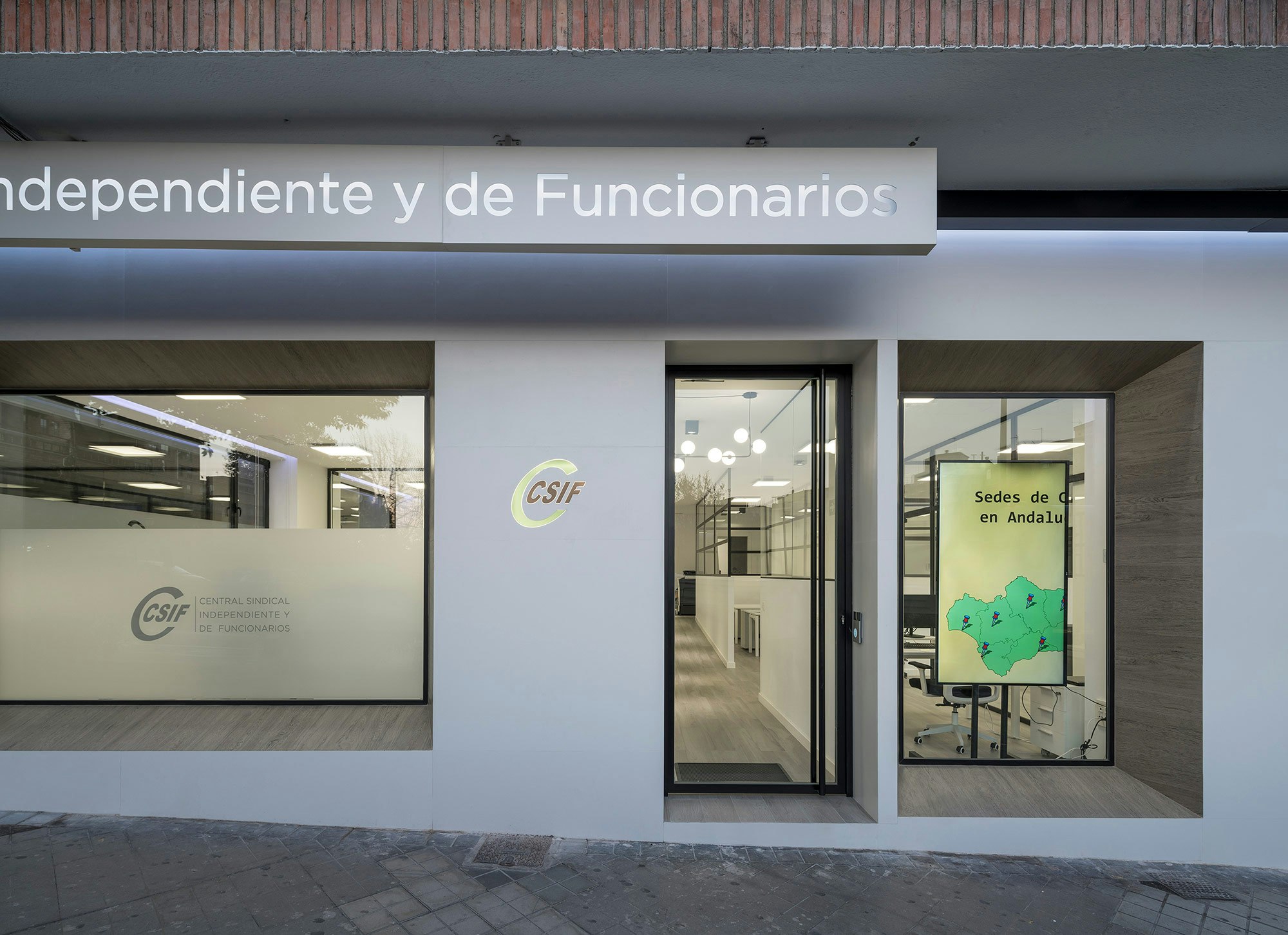 The modern offices and training rooms of the regional headquarters of CSIF (Independent and Civil Servants’ Trade Union Centre of Spain) in Granada covers almost 5,382 square feet on the ground floor of two adjoining buildings in the heart of the city centre. The flexible and versatile interiors have been designed as open-plan spaces, with plenty of glass walls and a white and ecru colour range that promote a relaxed and calm atmosphere, ideal for this workspace. A design that is seamlessly integrated with the exterior, where the architects Gallego Projects have developed a balanced façade, with large apertures allowing plenty of natural light to pass through and connecting the interior with the street.