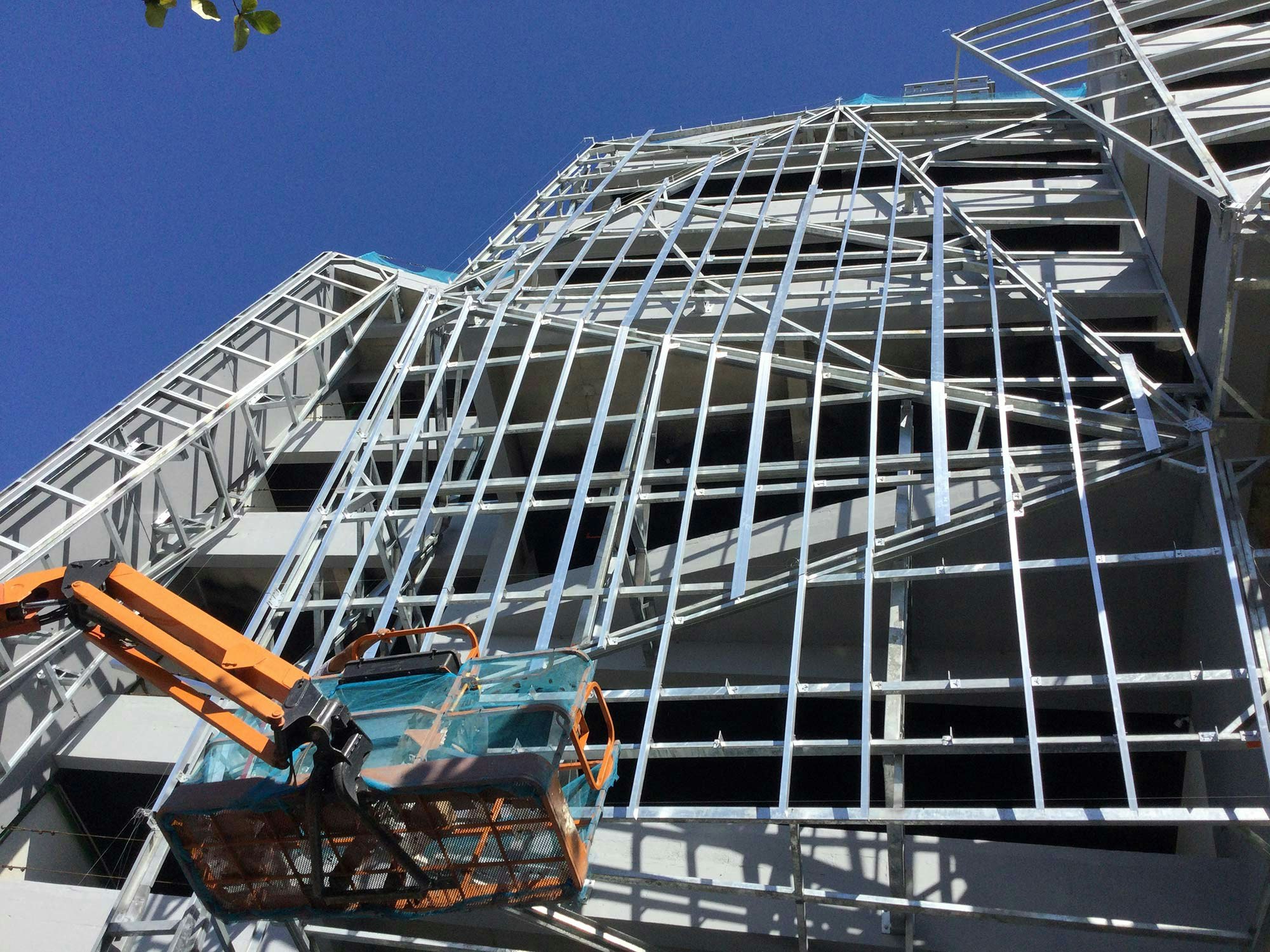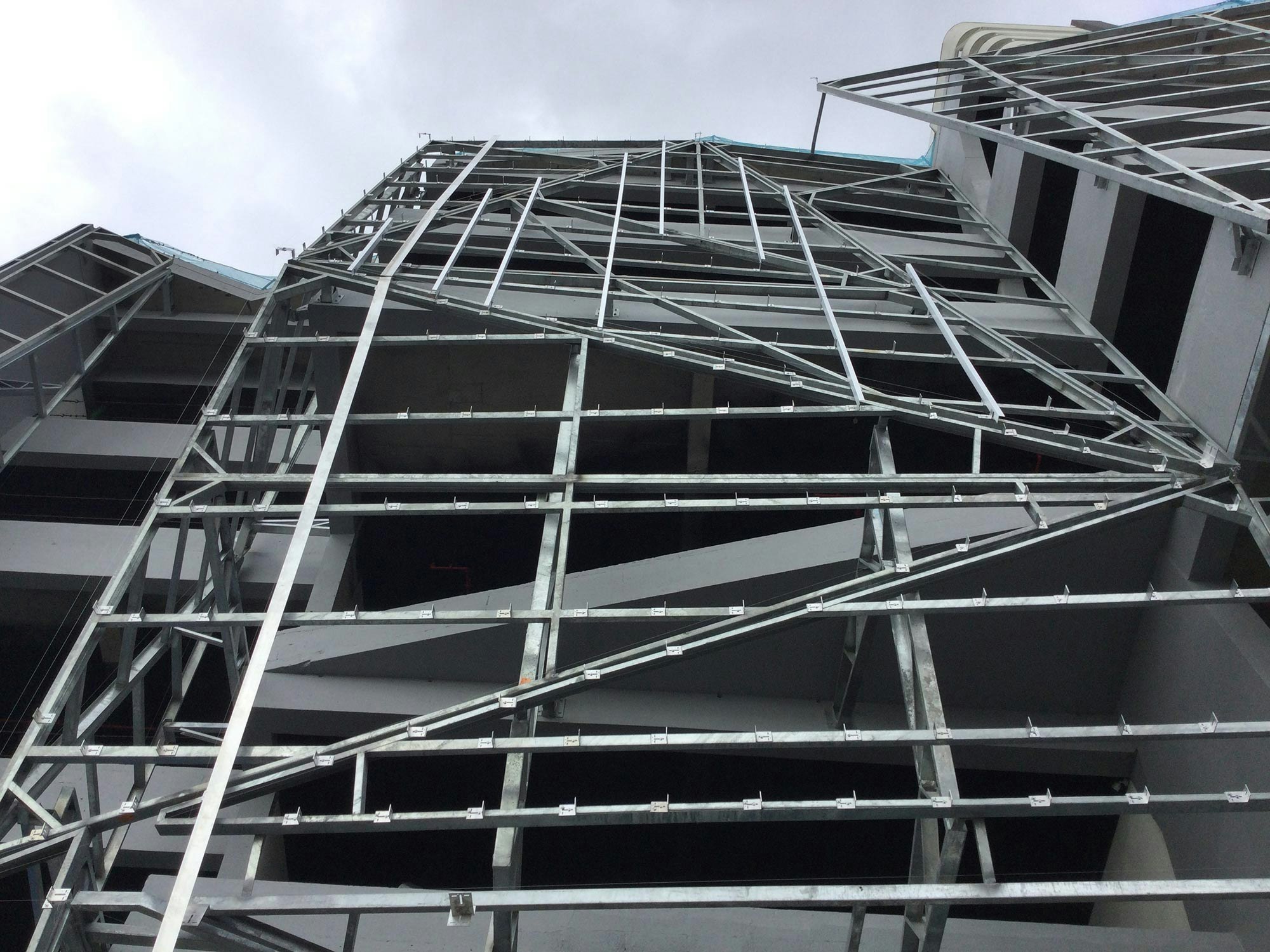 The façade is very interesting from a constructive point of view, highlighting both its cutting and volumetrics. To achieve the fascinating interplay of broken planes and angles, a chemical anchoring system (DKC) was used on a framework of metal profiles.