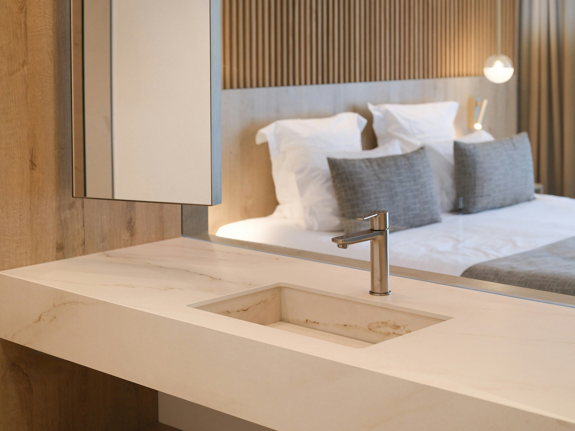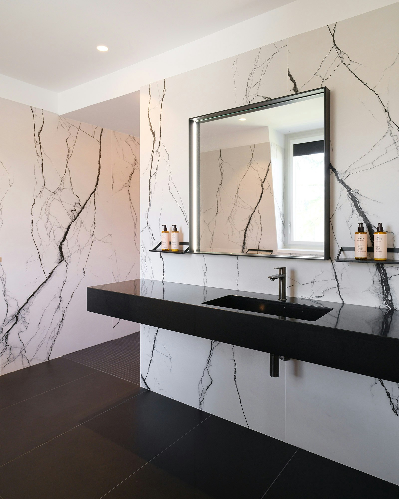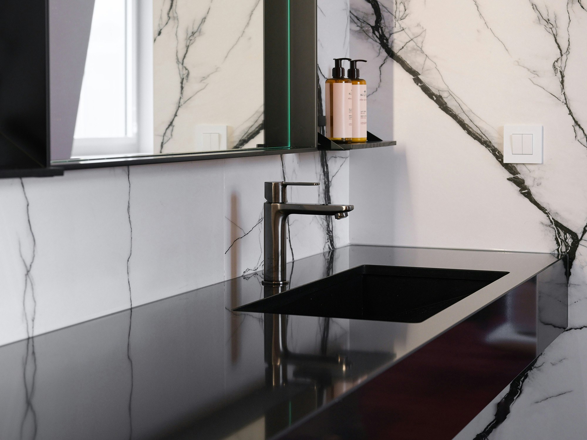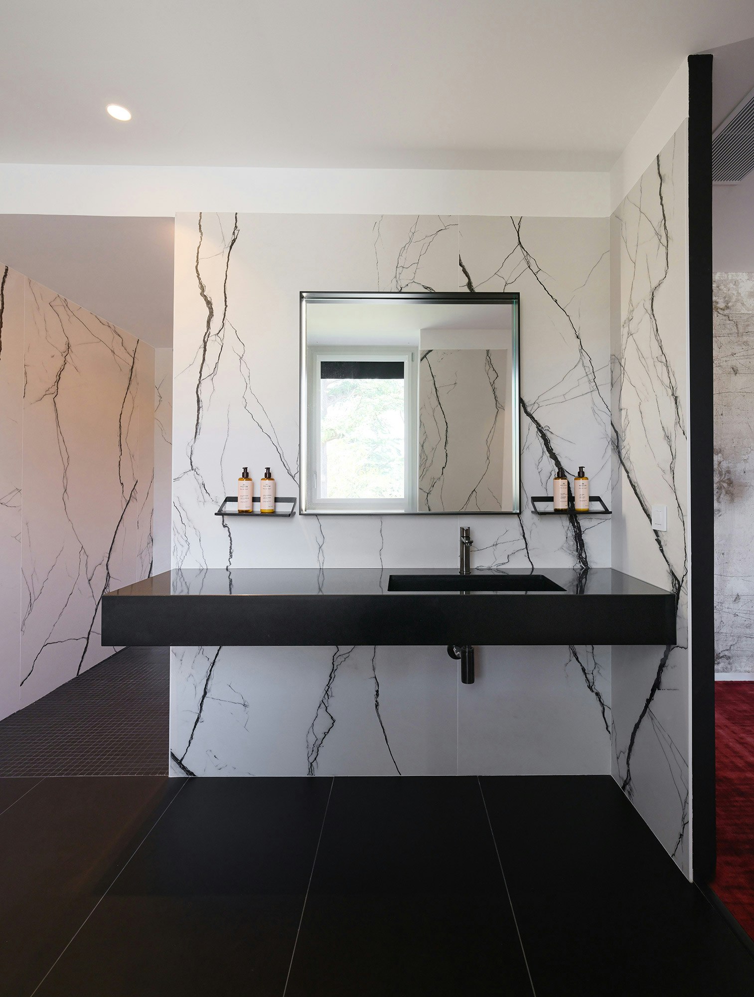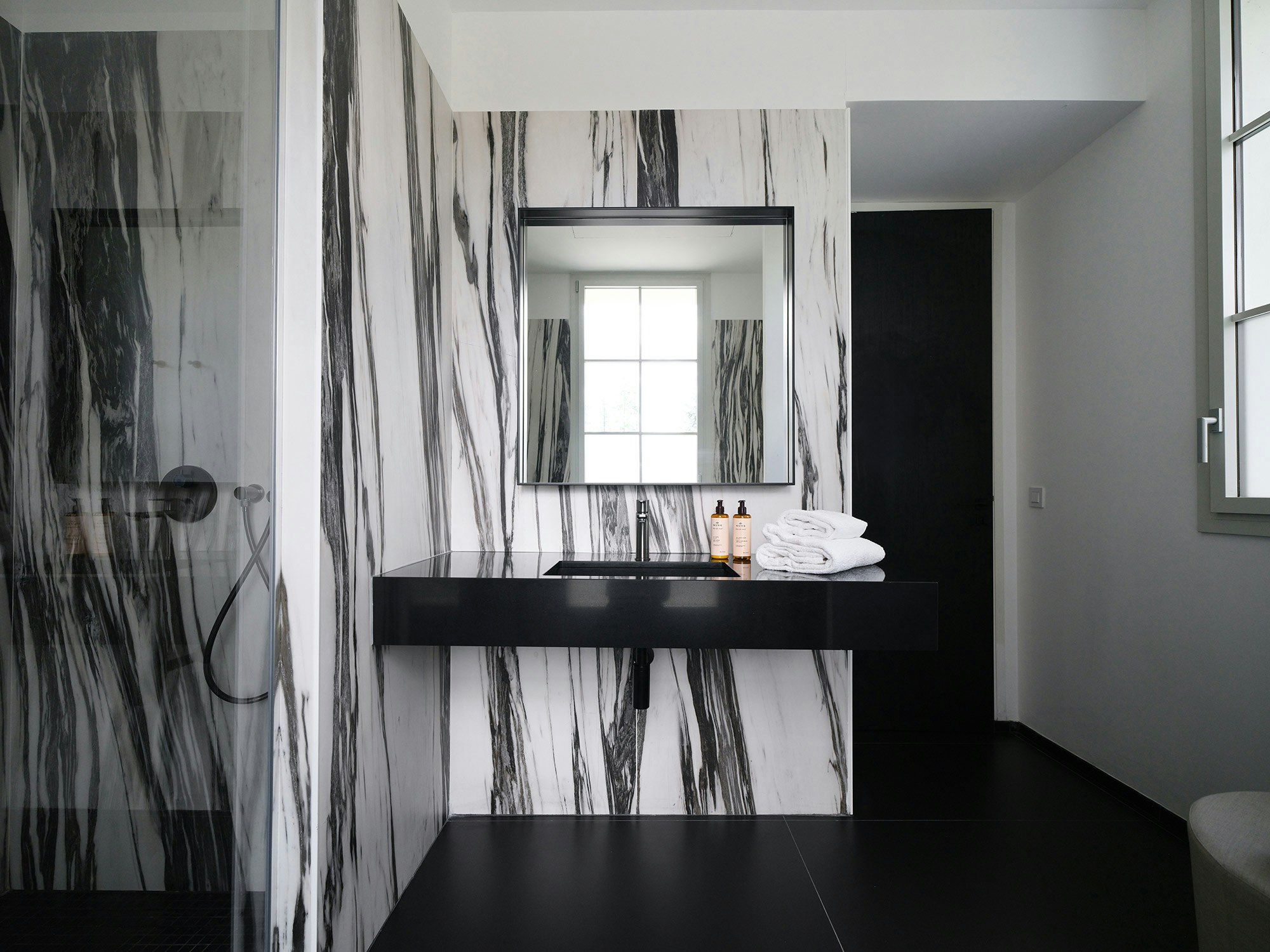 One of the distinctive features of La Villa Castellane lies in its 63 vanity tops, carefully designed by the Atelier Xy studio. To guarantee both practicality and aesthetics, the choice fell on Dekton color REM and Silestone Iconic Black. These materials are distinguished by their ease of maintenance, their non-porosity and their resistance, essential qualities to meet the requirements of a hotel environment while offering a designer and elegant touch.