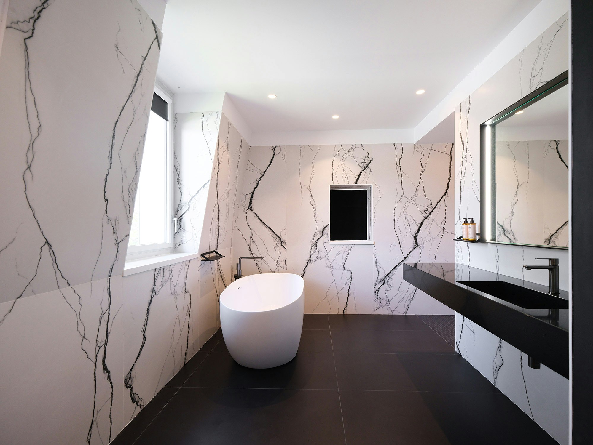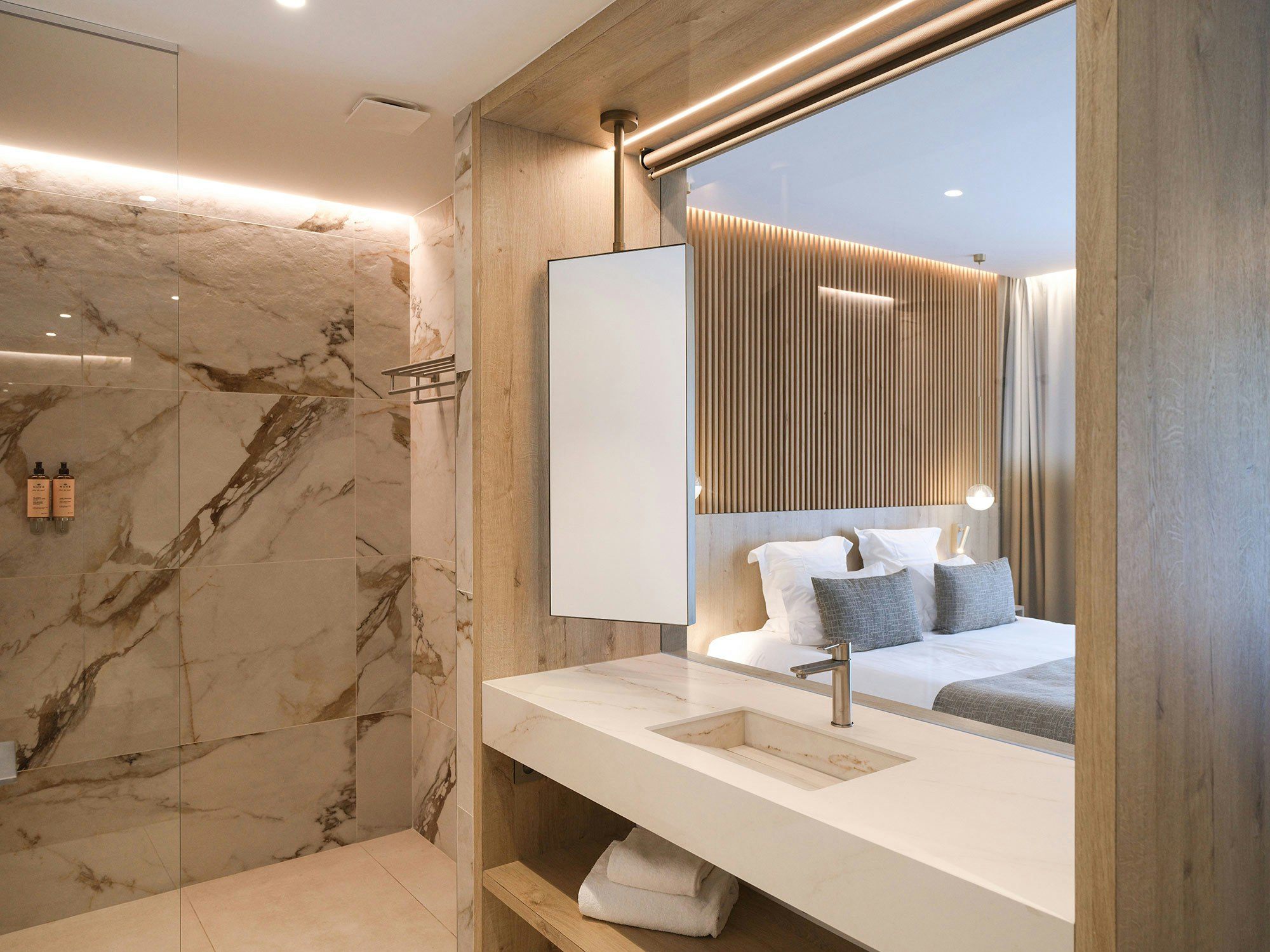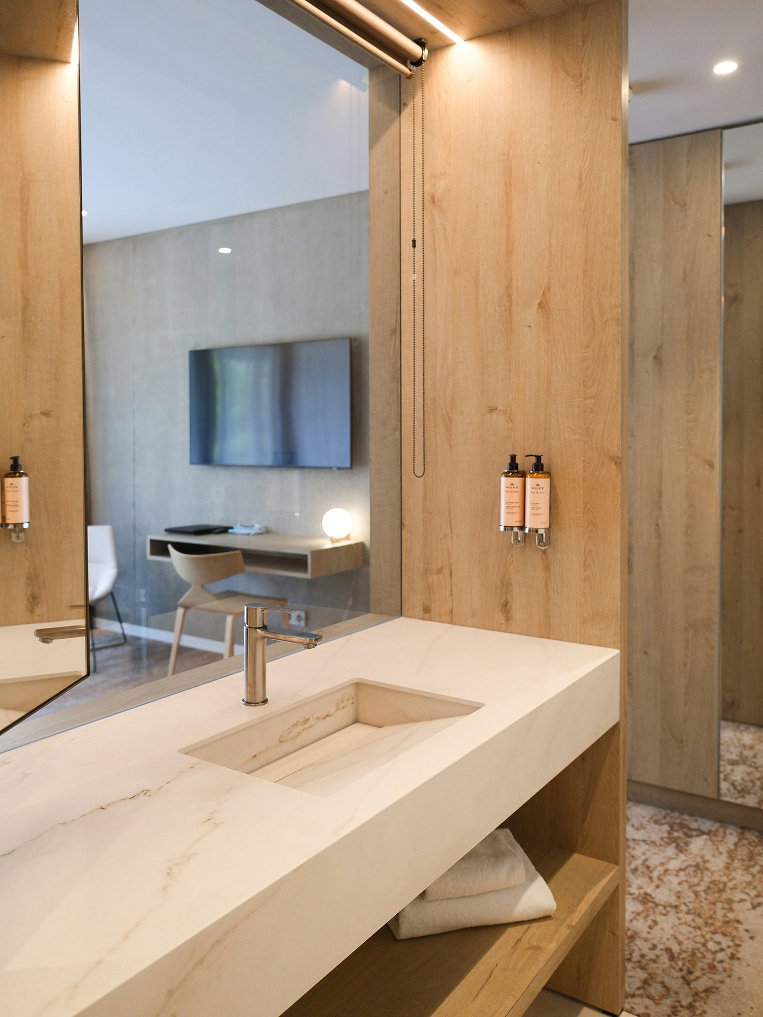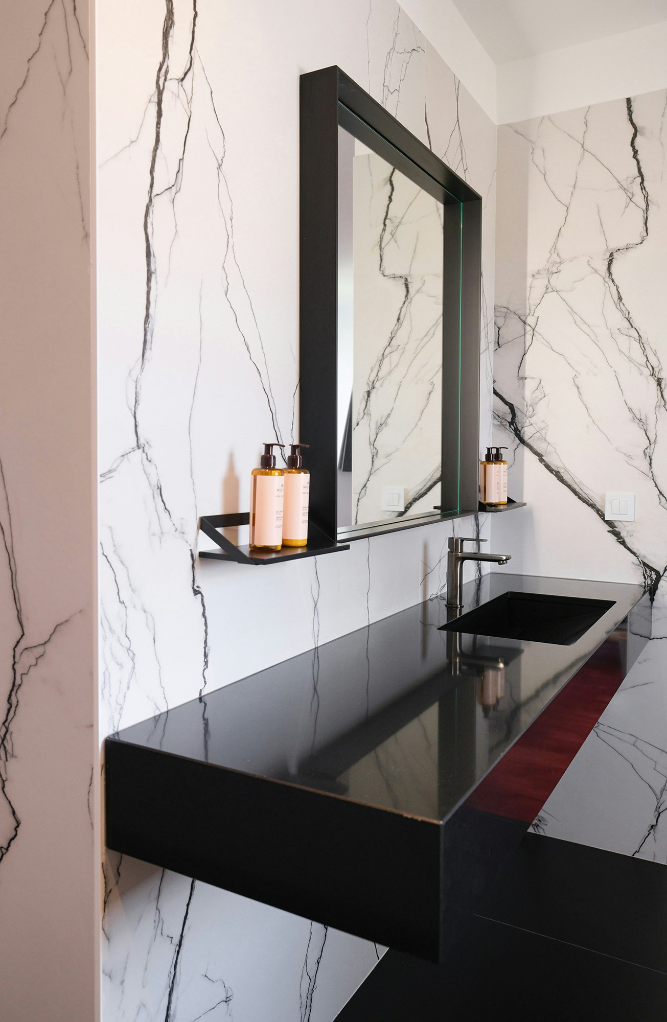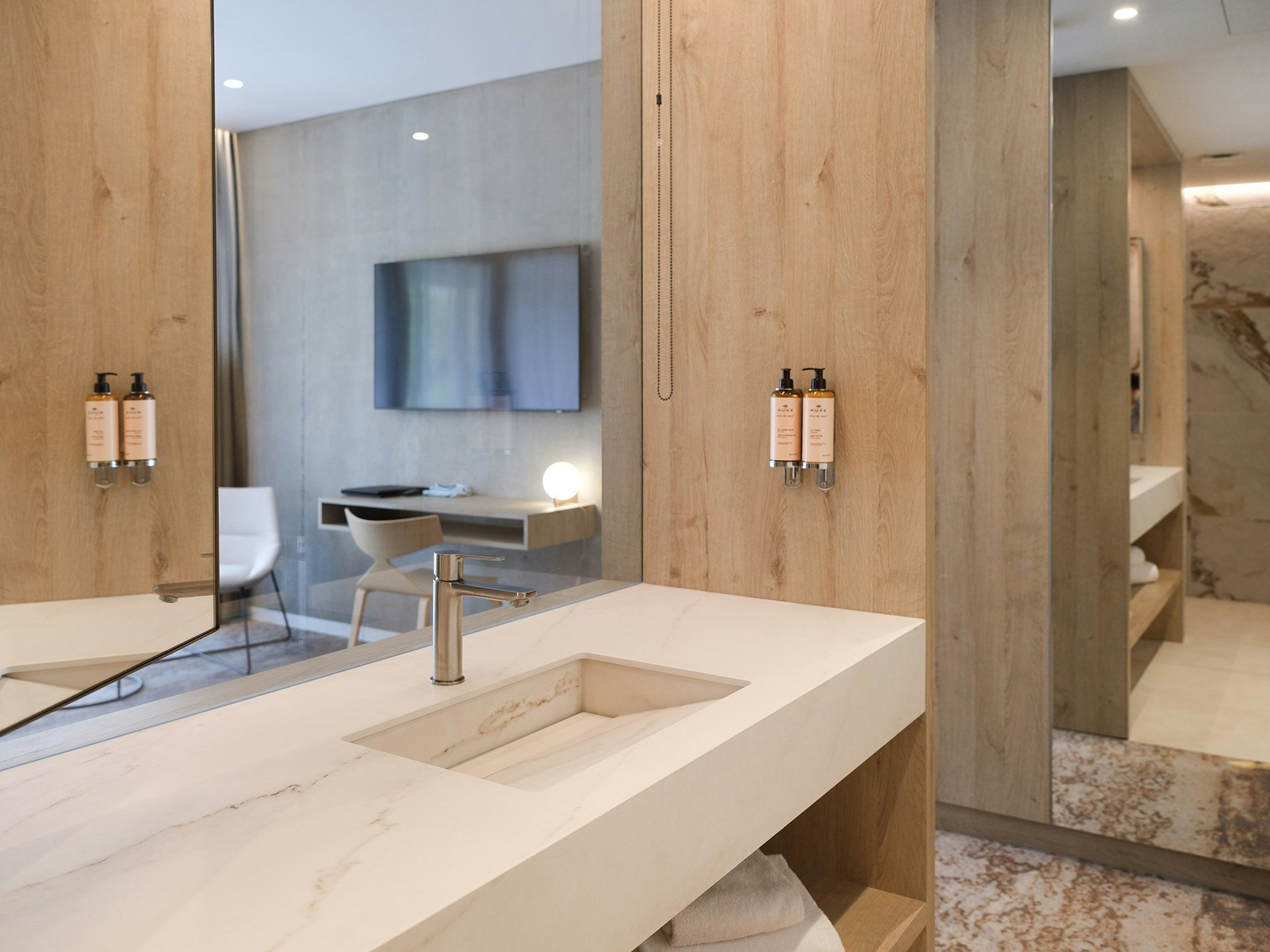 One of the distinctive features of La Villa Castellane lies in its 63 vanity tops, carefully designed by the Atelier Xy studio. To guarantee both practicality and aesthetics, the choice fell on Dekton color REM and Silestone Iconic Black. These materials are distinguished by their ease of maintenance, their non-porosity and their resistance, essential qualities to meet the requirements of a hotel environment while offering a designer and elegant touch.