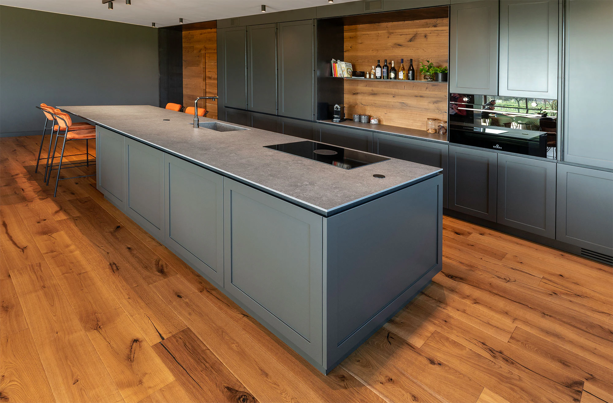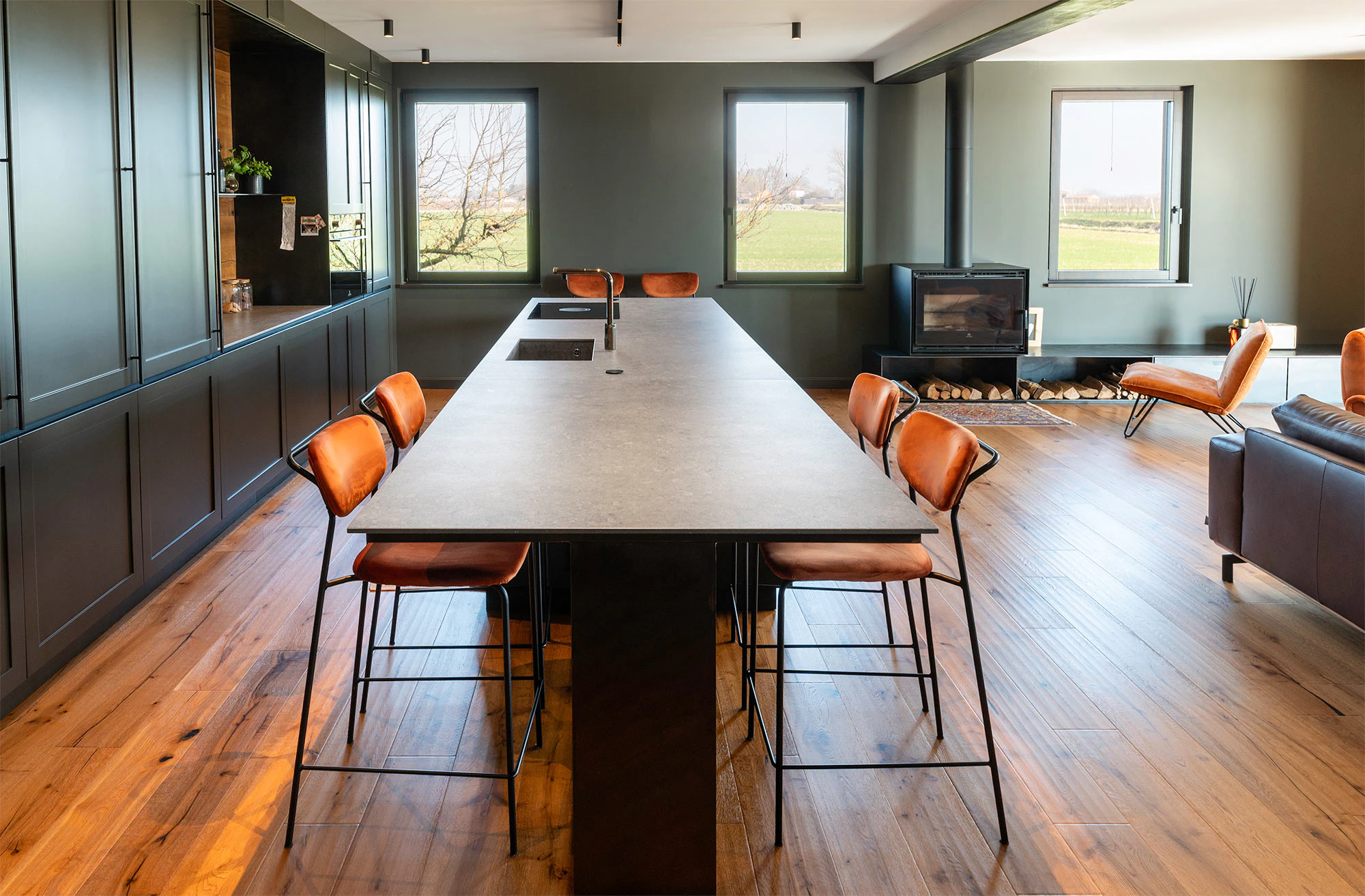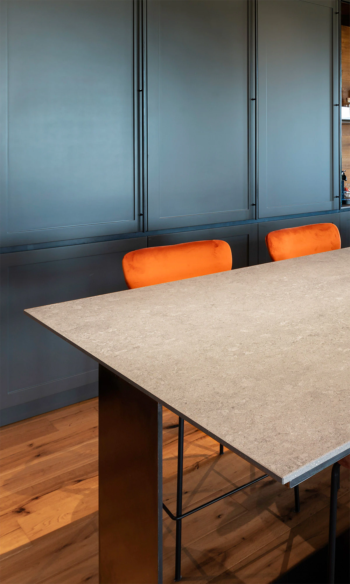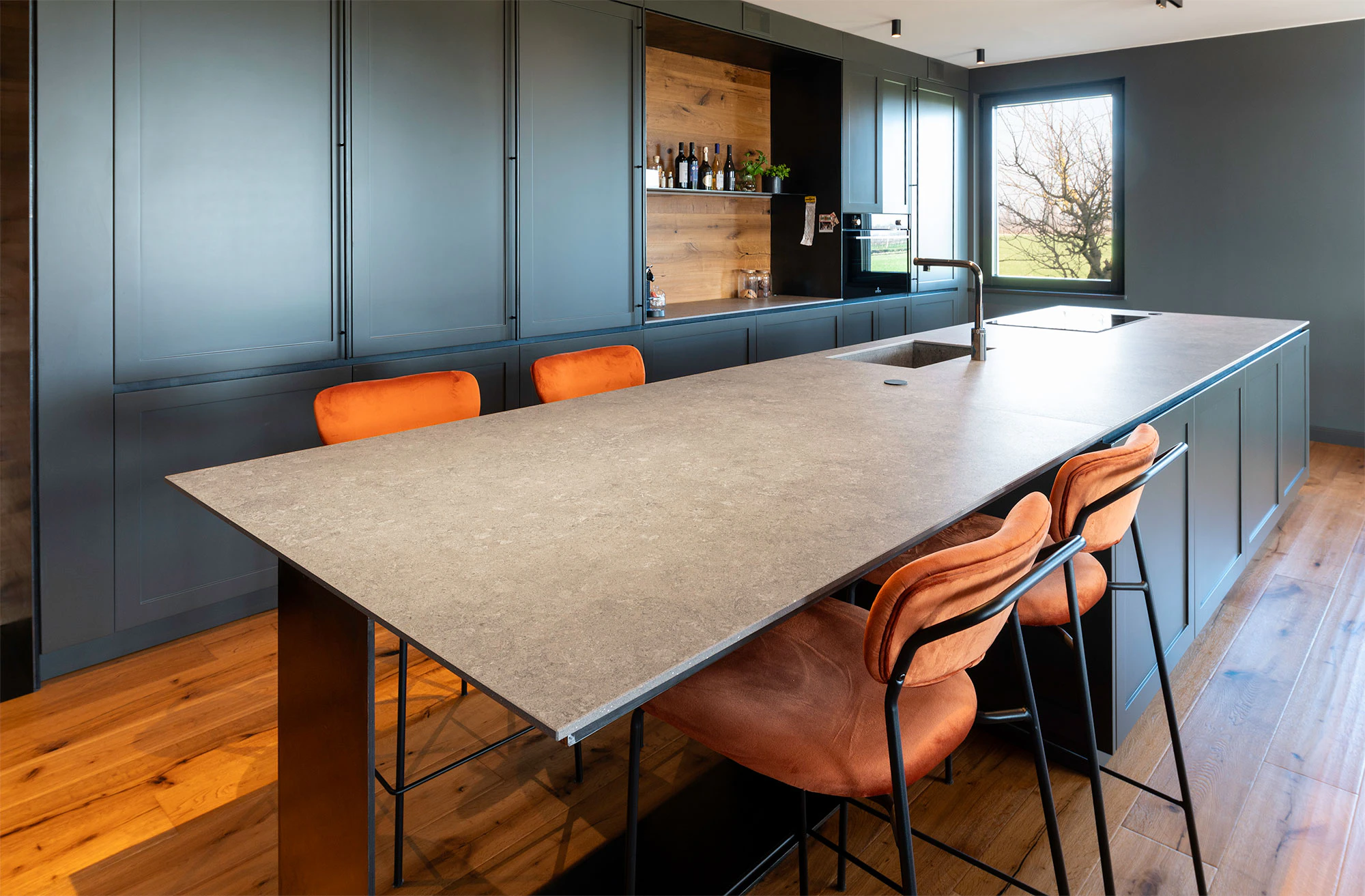 Dekton Grafite shines in the kitchen with its dark base, which intermingles blacks and grays and presents whitish and reddish areas in the form of a cloud over the large island and the countertop. This color, which reinterprets the texture of the dark, fine-grained limestone, blends perfectly with the blue of the kitchen and, in addition, offers advantages that even surpass those of the stones of the past, as it does not scratch, is not affected by abrasion and does not stain either, since its porosity is practically nil.