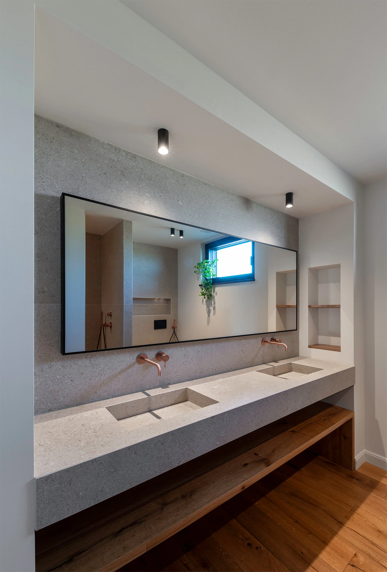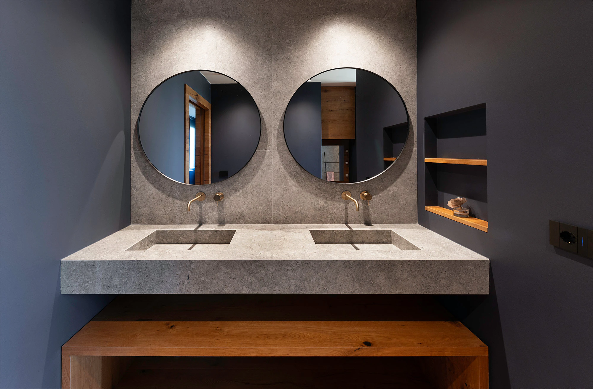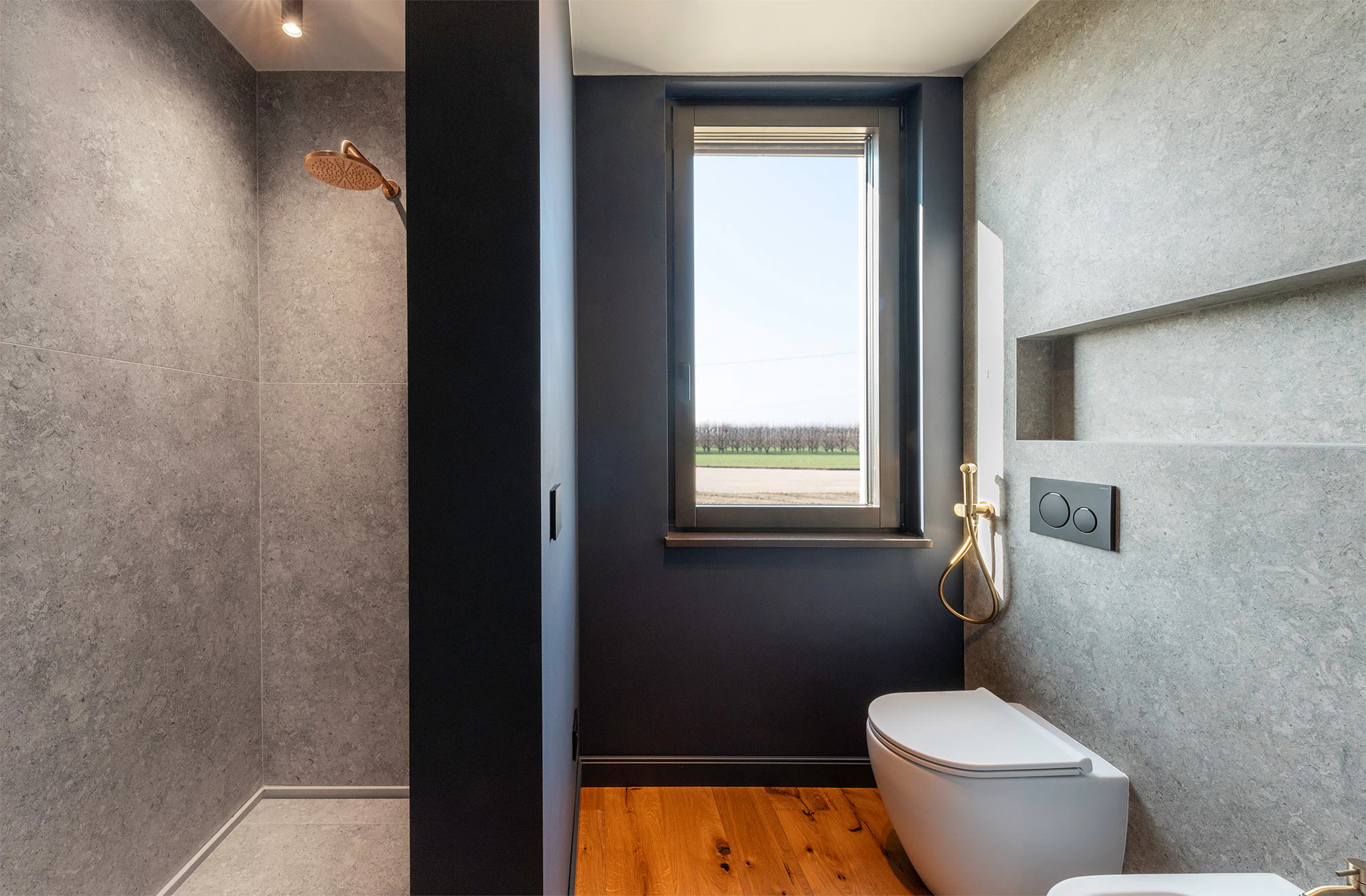 In the third of the house's bathrooms, the type of sink is replicated, though in Dekton Grigio. With a play of Grigio with warm accents, this color is inspired by the Grigio Alpi stone, a variety with macrofossils of the Vincenza stone popularized by the aforementioned Renaissance architect Andrea Palladio. In this case, like the previous one, the shower is also made of Dekton (Katrall model), and Dekton Grigio has also been used on the wall to create a total look without joints.