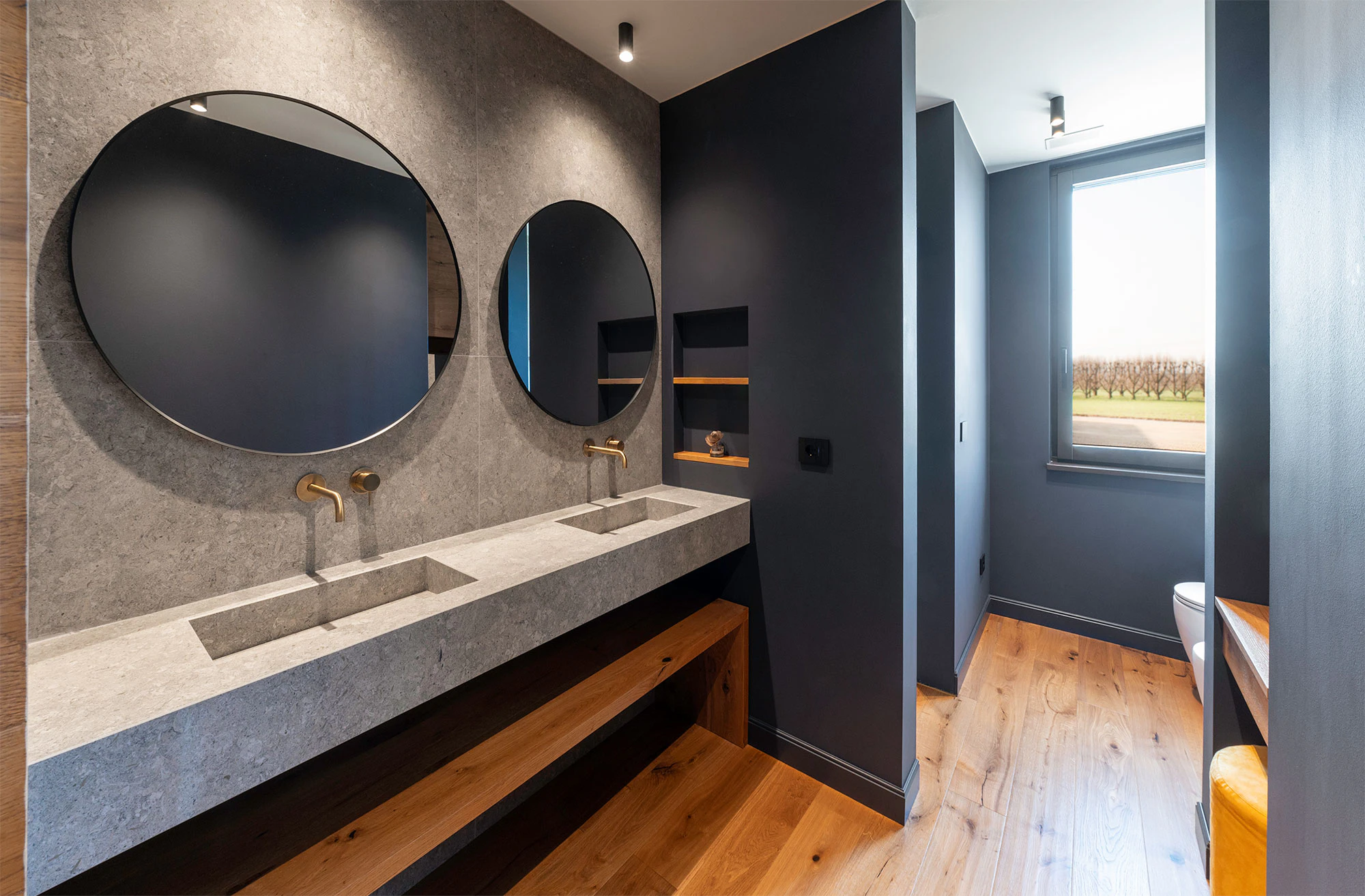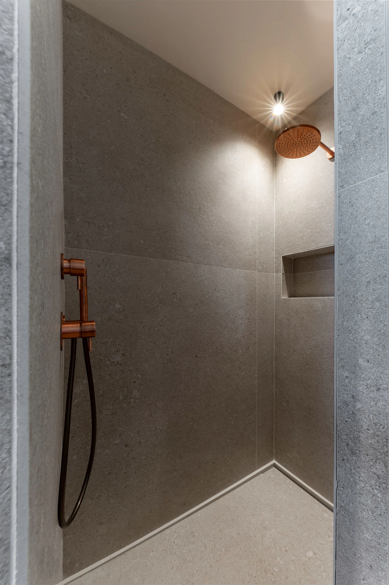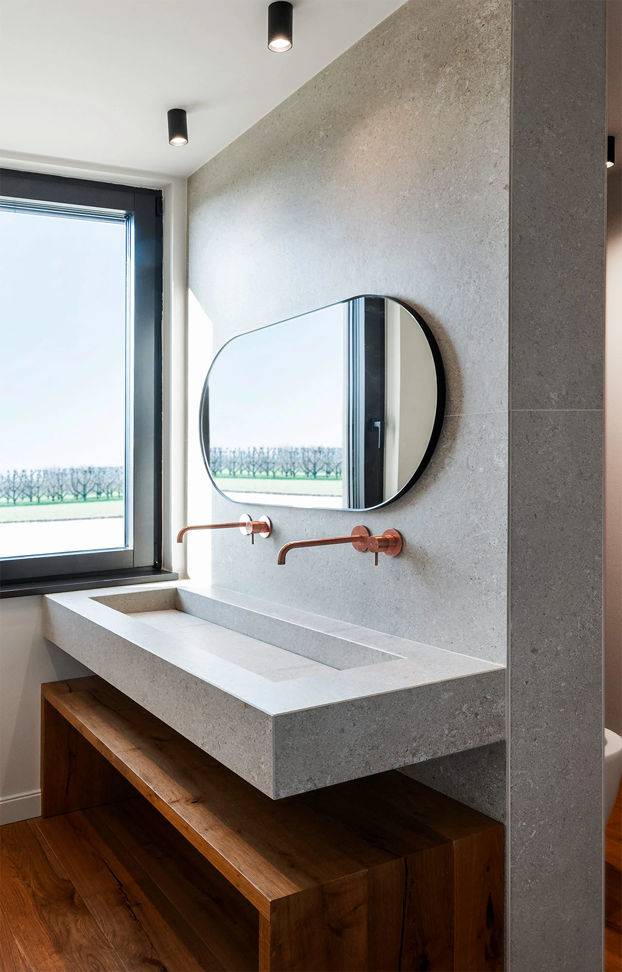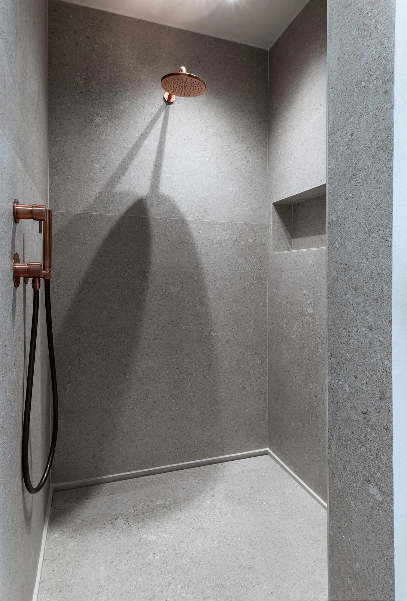 In the third of the house's bathrooms, the type of sink is replicated, though in Dekton Grigio. With a play of Grigio with warm accents, this color is inspired by the Grigio Alpi stone, a variety with macrofossils of the Vincenza stone popularized by the aforementioned Renaissance architect Andrea Palladio. In this case, like the previous one, the shower is also made of Dekton (Katrall model), and Dekton Grigio has also been used on the wall to create a total look without joints.
