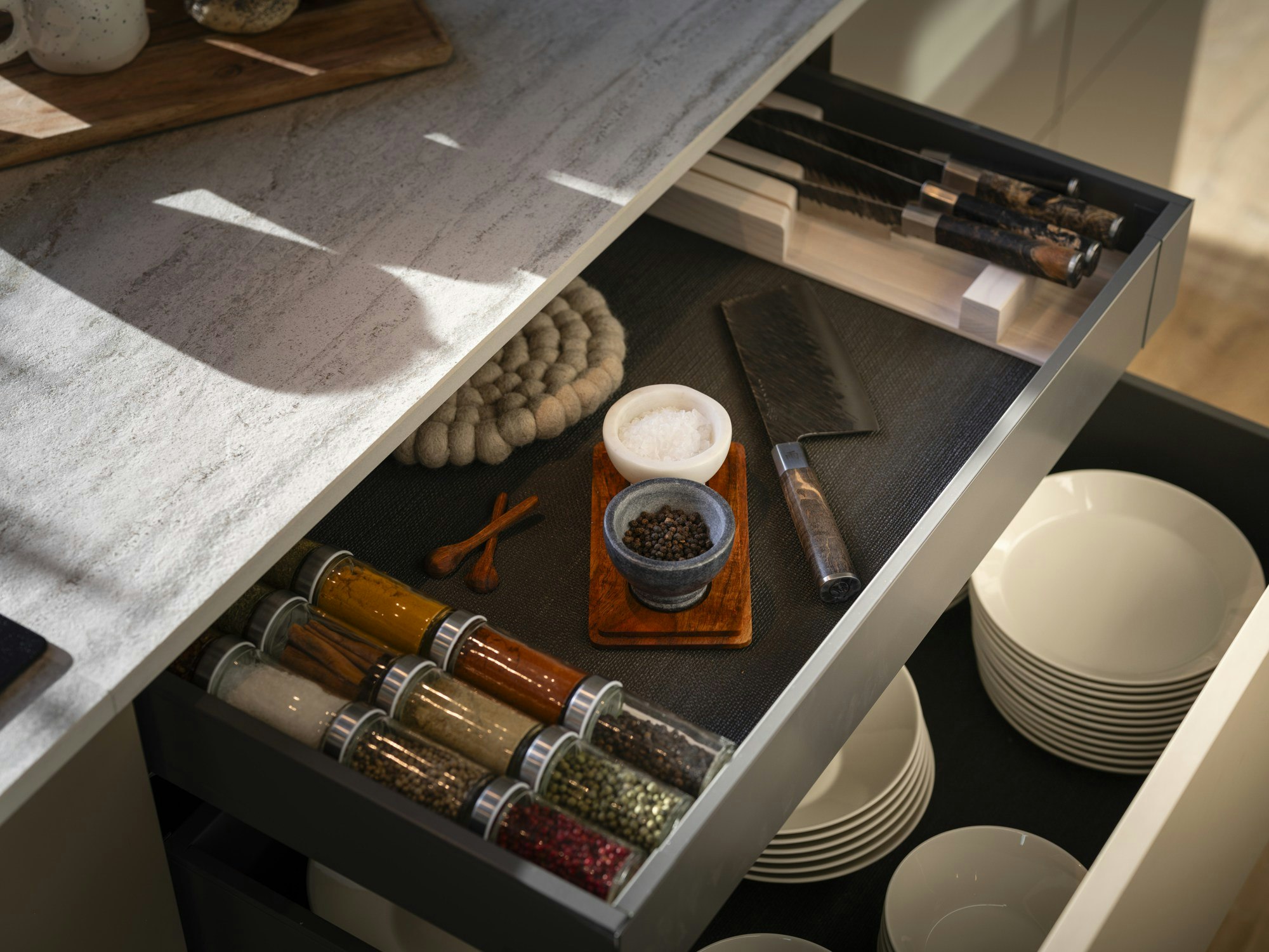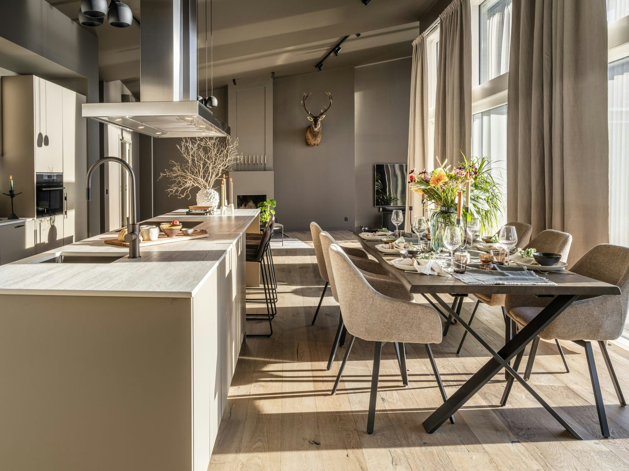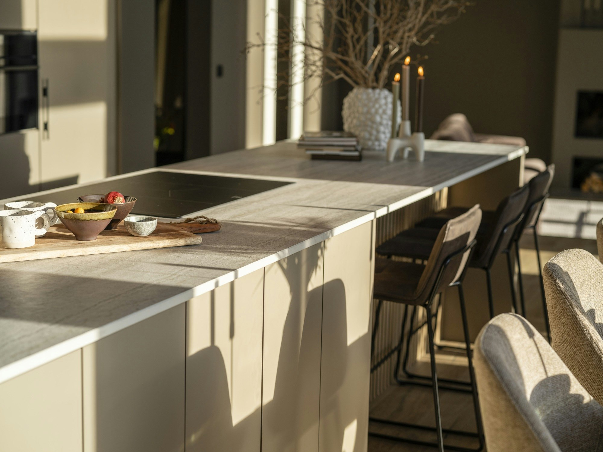 But there was a decisive aspect for Marko: he needed an extremely durable worktop, capable of withstanding direct heat, impacts, and stains, especially because the kitchen is closely linked to his hobbies. “One of Marko's interests is hunting and also cooking, so during preparation things can get very hot,” notes Ulrika. That’s why the choice of material was clear. “Dekton is an unbeatable material against scratches, stains, and heat,” says the designer. “Hot pots and pans can be placed directly on the worktop.”