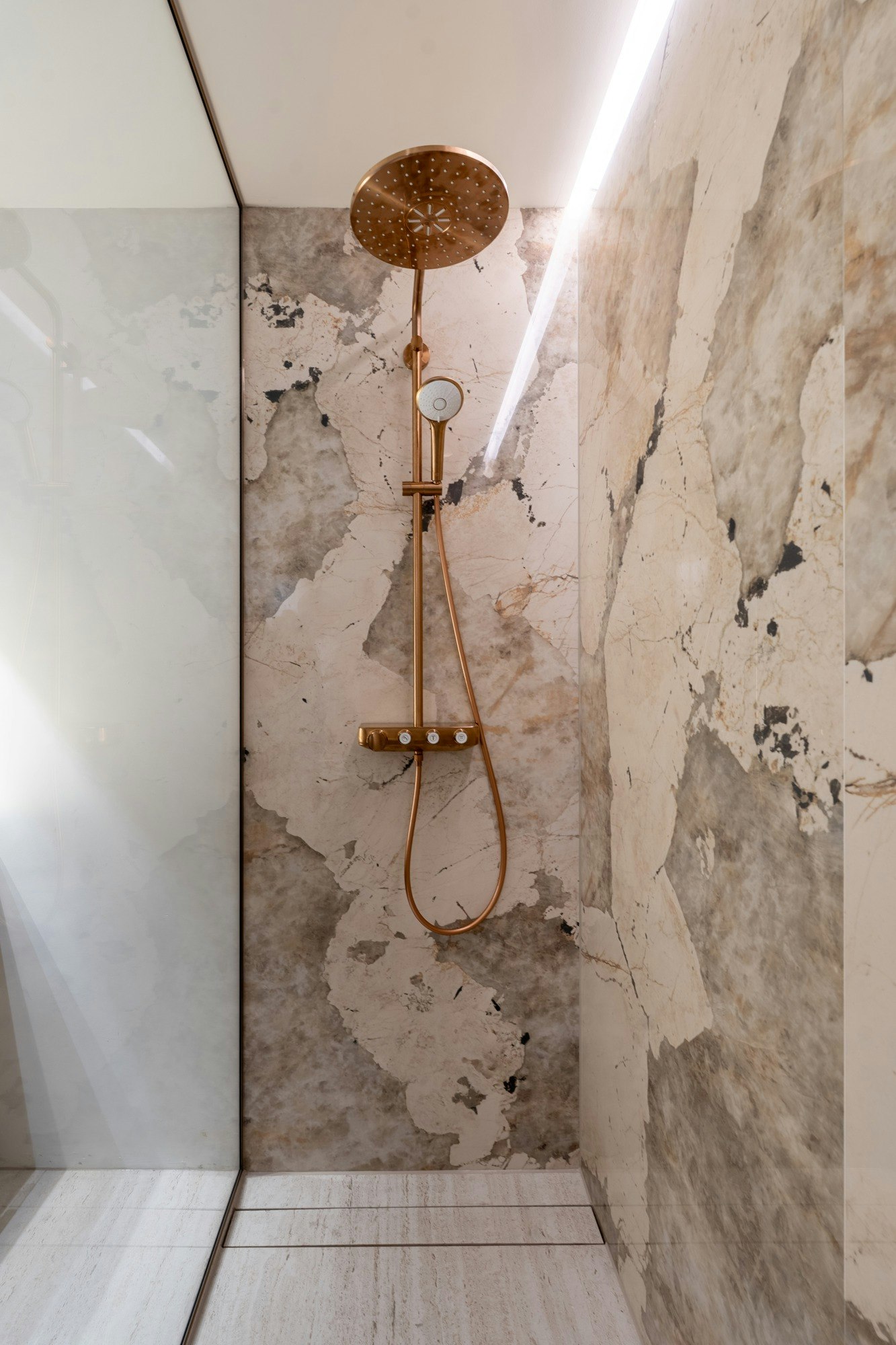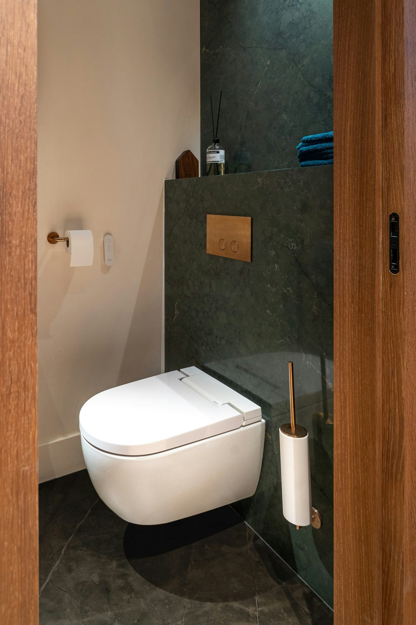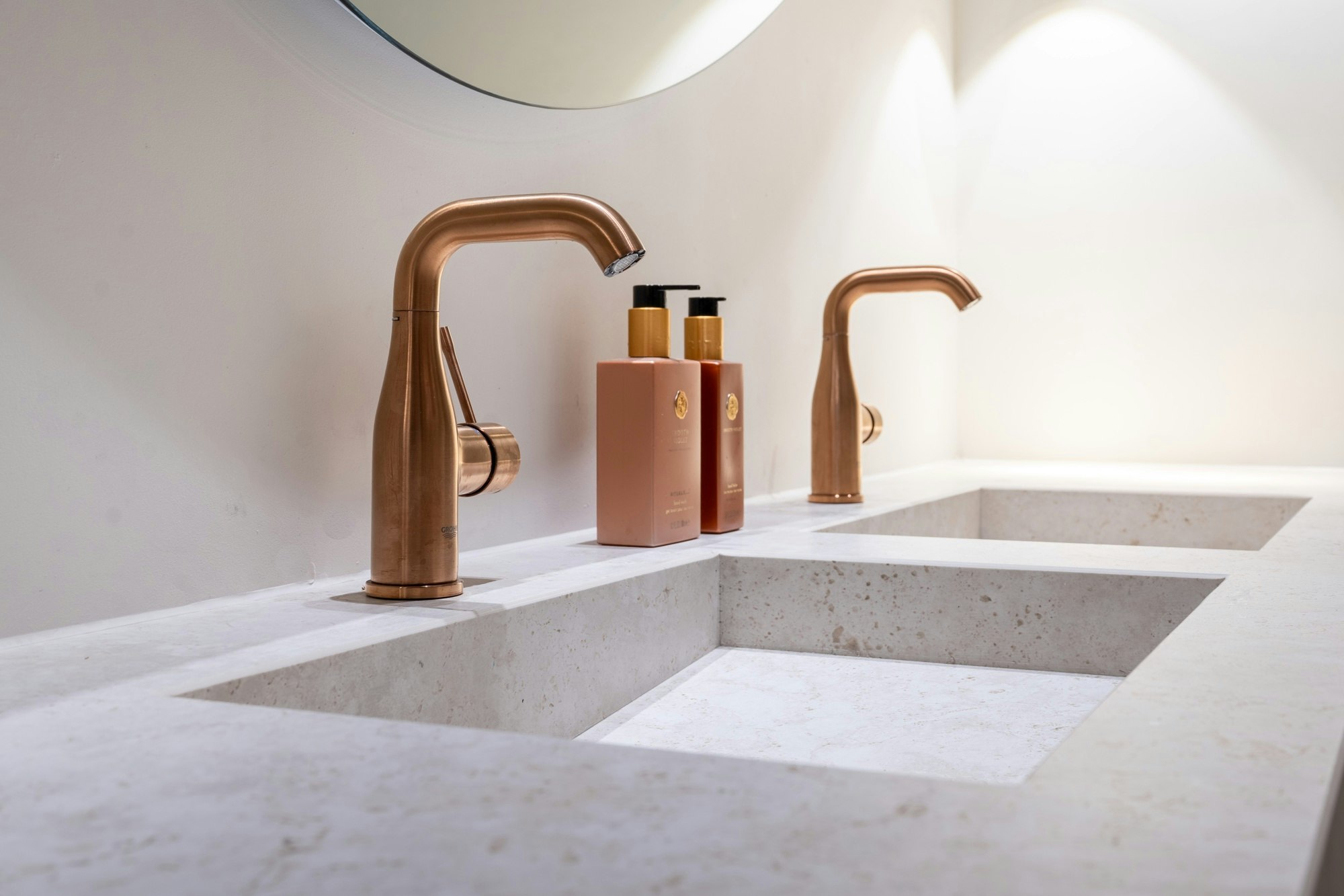 By applying Cosentino materials in multiple areas, unity is achieved throughout the interior. For example, in the restrooms, Dekton Laurent was chosen for the floor and Silestone Jardin Emerald for the walls, complemented by copper-colored details that highlight the golden veins in Dekton Laurent. In the bathroom, Dekton Sabbia and Dekton Khalo reappear.
