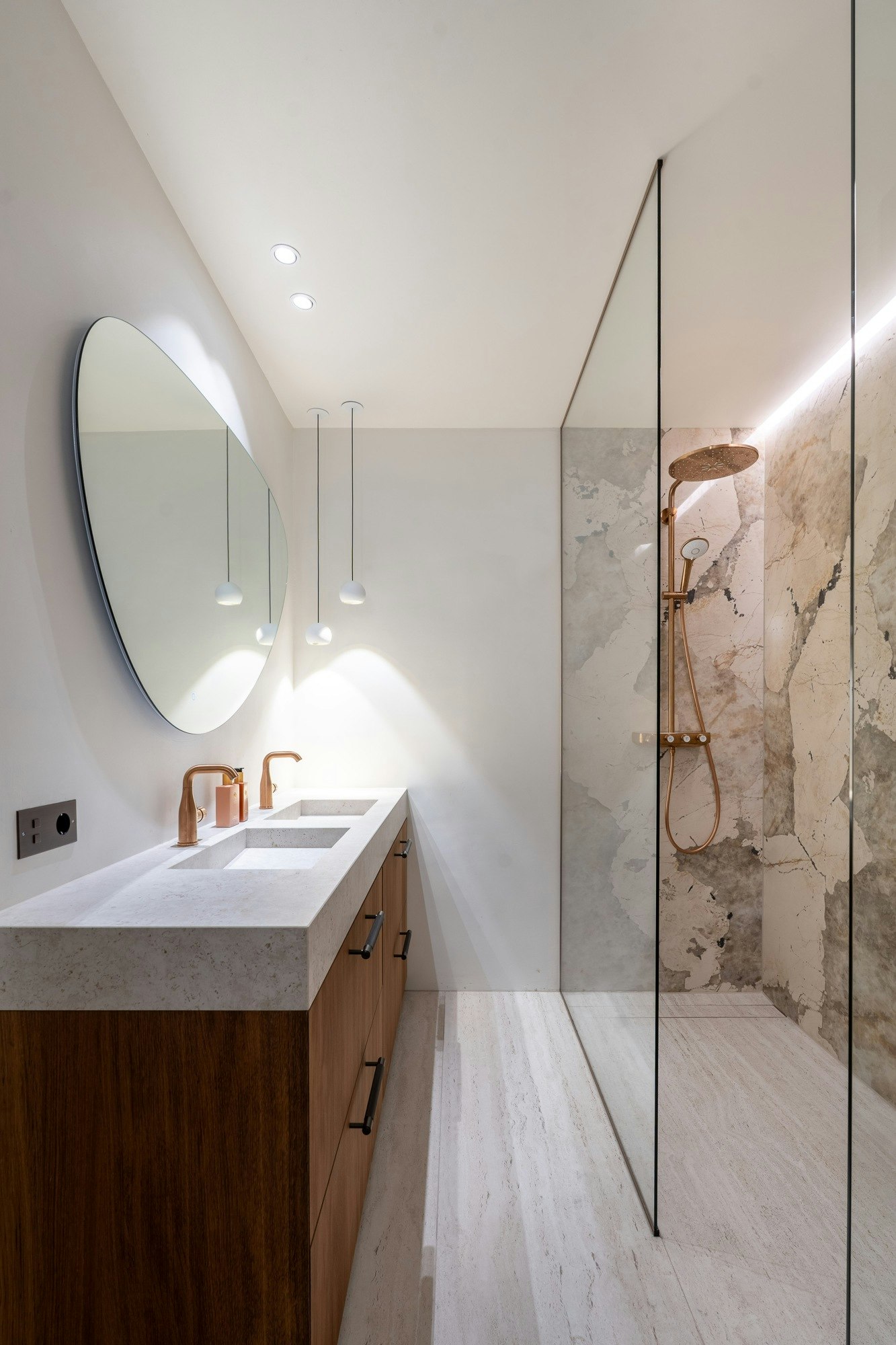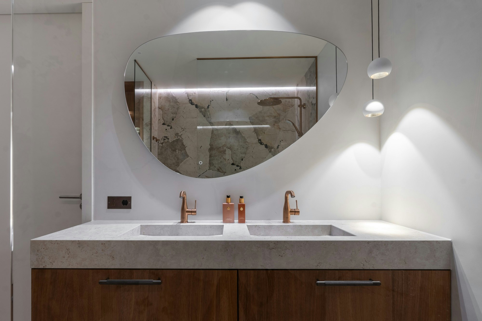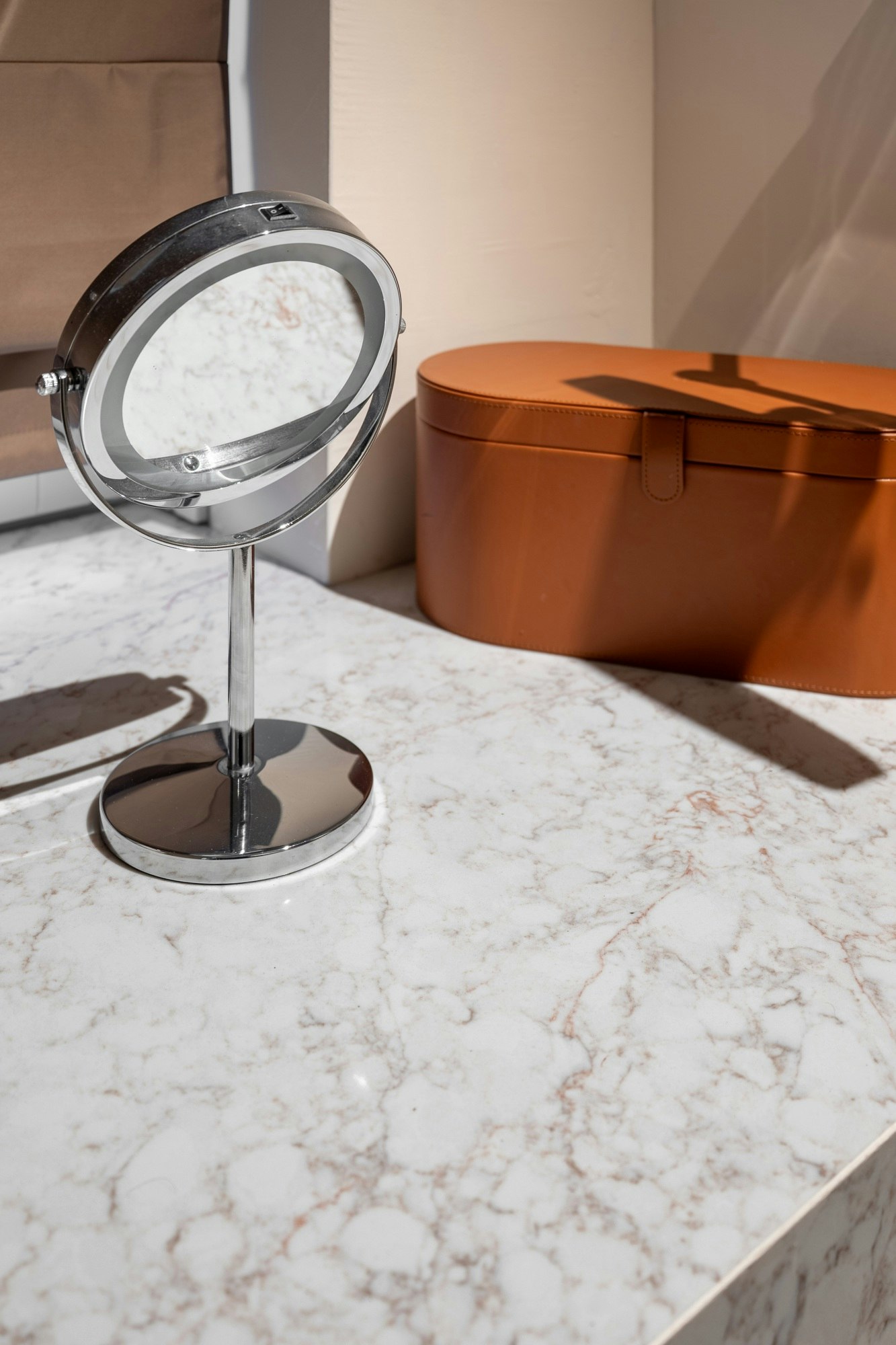 Silestone also appears in the bedroom, this time at the dressing table. Combined with custom cabinetry and a neutral color palette, the material adds a subtle touch of luxury to the space. For the dressing table, the color Silestone Rivière Rose was chosen, with copper veins adding a nearly pink glow to the room.