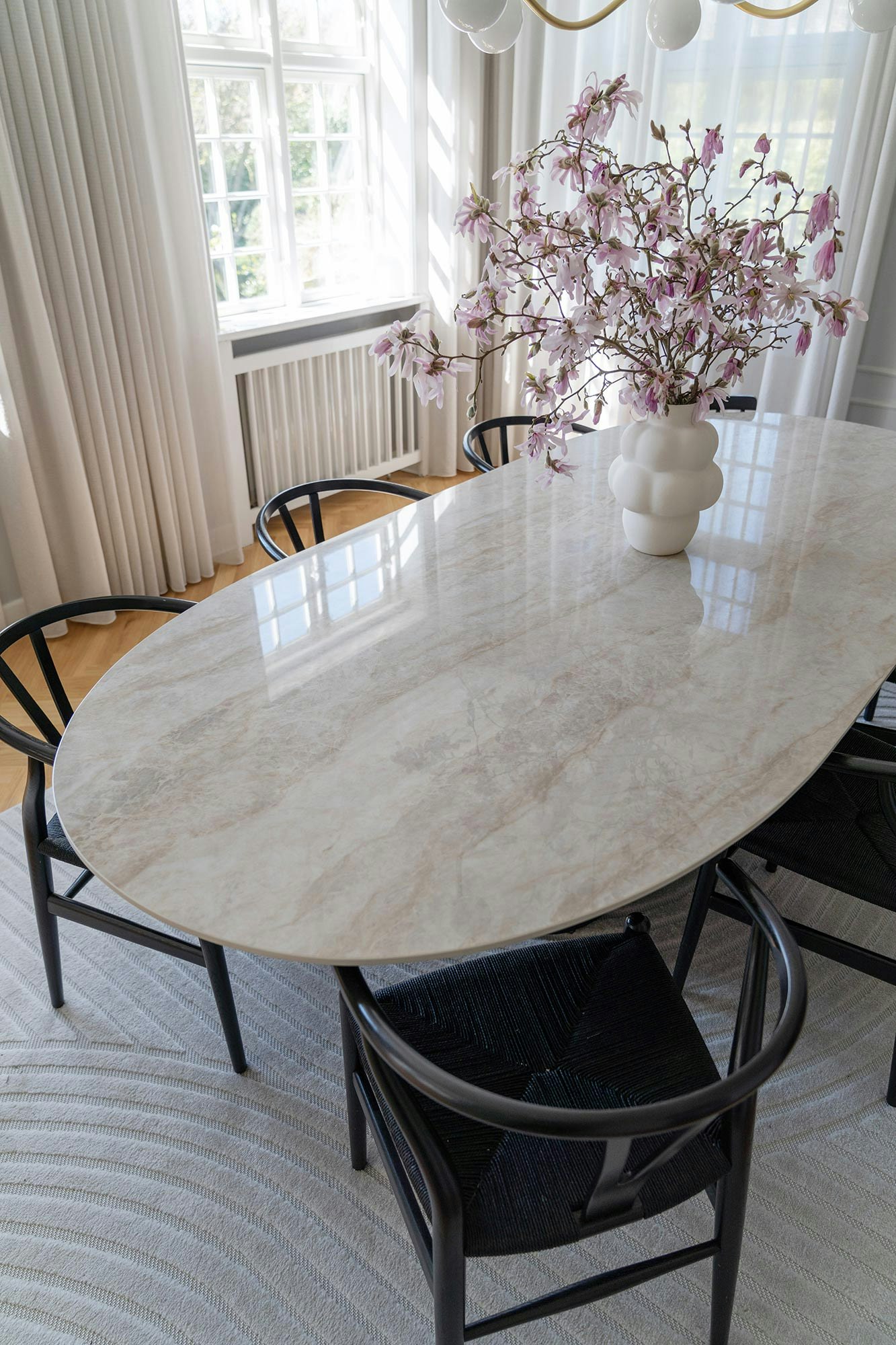 “With Dekton Arga as the tabletop, we didn't just update the dining table but the whole room - the change from black to the vivid, bright marble expression is a perfect match for both the curtains, the wall color and our iconic Y-chairs, which will always have a place at the table.”