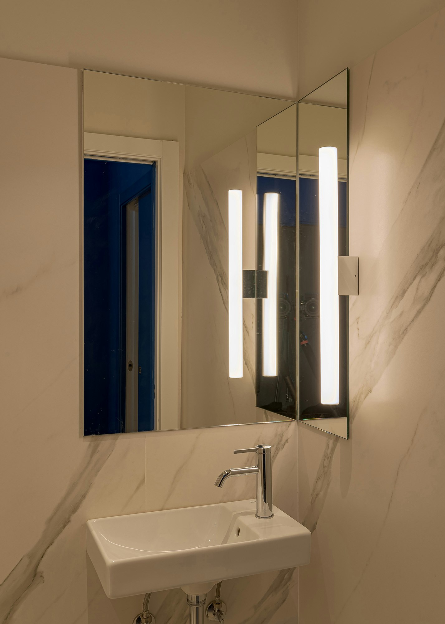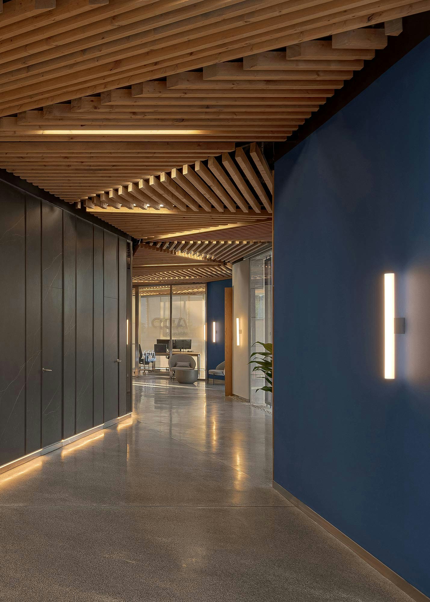 That core is no ordinary feature: it is clad in vertical strips of Dekton Kelya, arranged in a rhythmic pattern that exudes character. “We used it for vertical cladding to give it prominence and convey sobriety and elegance,” they comment. Dekton interacts with other materials like wood, stainless steel, and ACP's corporate blue, reinforcing the modern and professional atmosphere of the space. The same applies to the bathrooms, where the same material has been used but in the colour Dekton Opera, inspired by the elegant Italian Carrara marble.