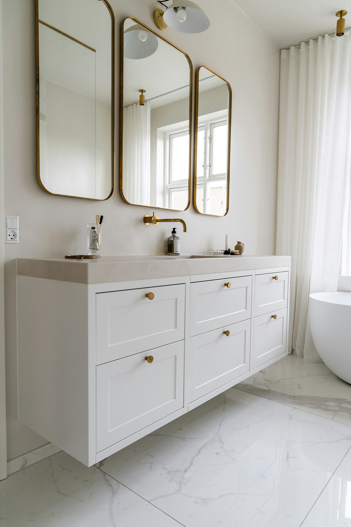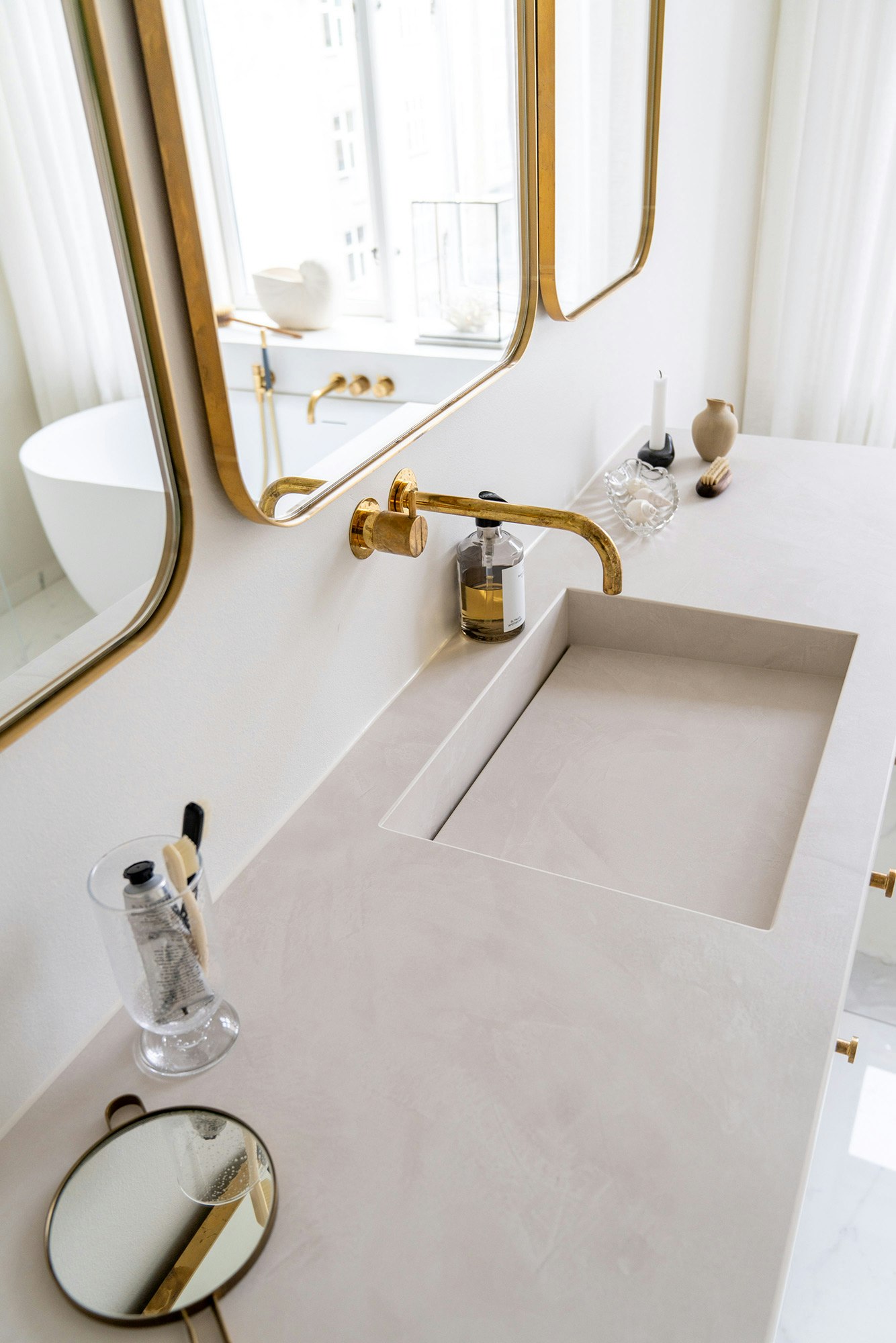 So it was all about applying this knowledge and these values in her own home. The bathroom, where Dekton was used, features neutral shades of white, marble flooring, bespoke drawers, a freestanding bathtub, lightweight curtains and gold details from the mirror frames to the taps and wall lights. For all these reasons, the choice of Dekton Albarium made perfect sense.