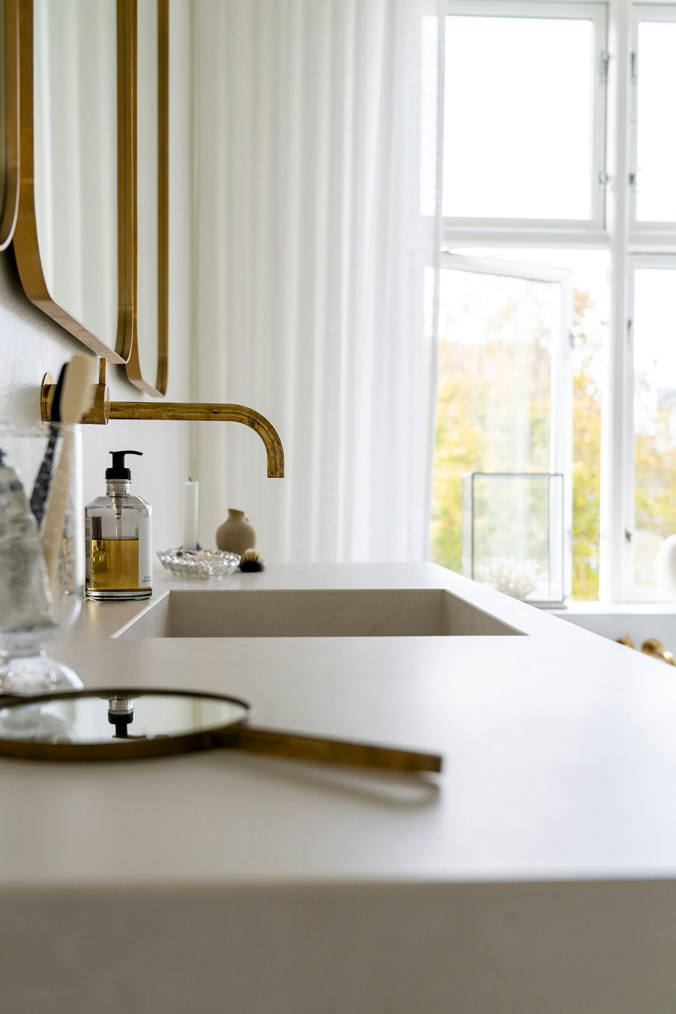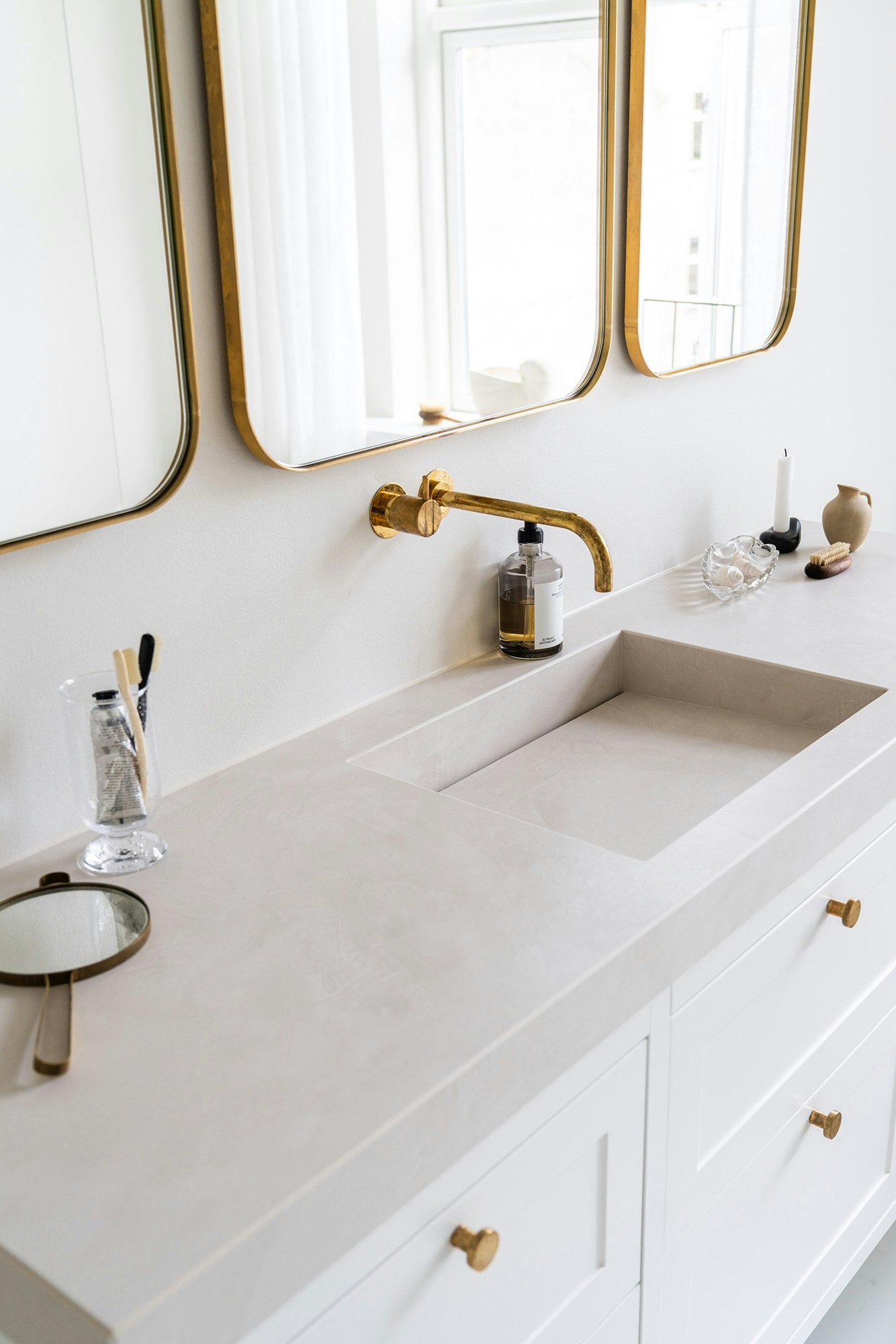 Interior, styling and marketing designer Carla Sofie Molge decided to renovate her home in Aalborg, Denmark, “with a particular passion for materials, structures and colours”, as she puts it. For the bathroom, her aim was to find a neutral base that would be easy to clean and maintain, and she realised that what she was looking for was “a customised Dekton solution that would blend in with the existing furniture.”