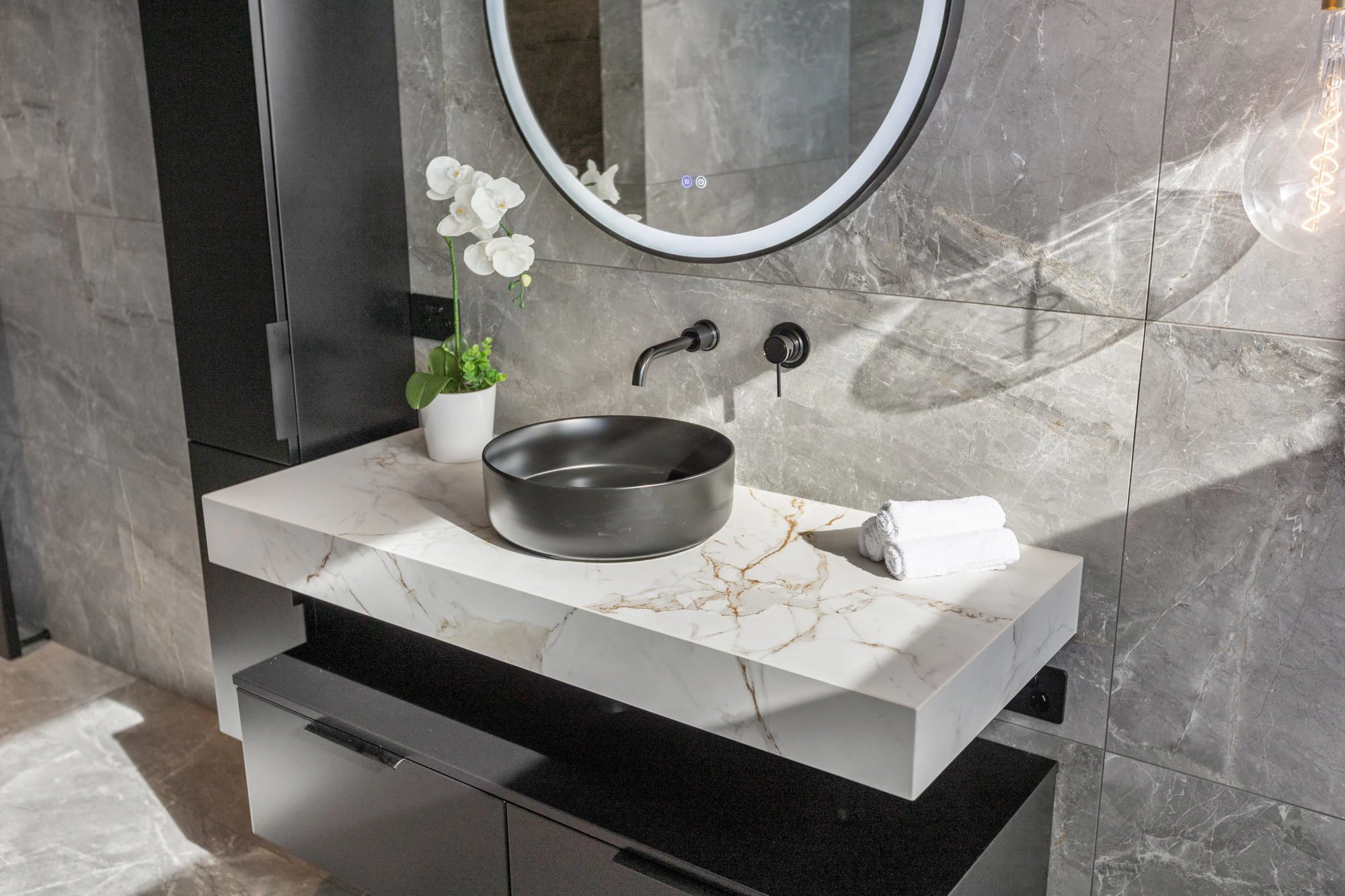 The variety of thicknesses was also crucial. “In the media room, we needed the material to match the thickness of the wooden slats while also being heat-resistant; whereas for the splashbacks and basins, it needed to be lighter and more durable.”