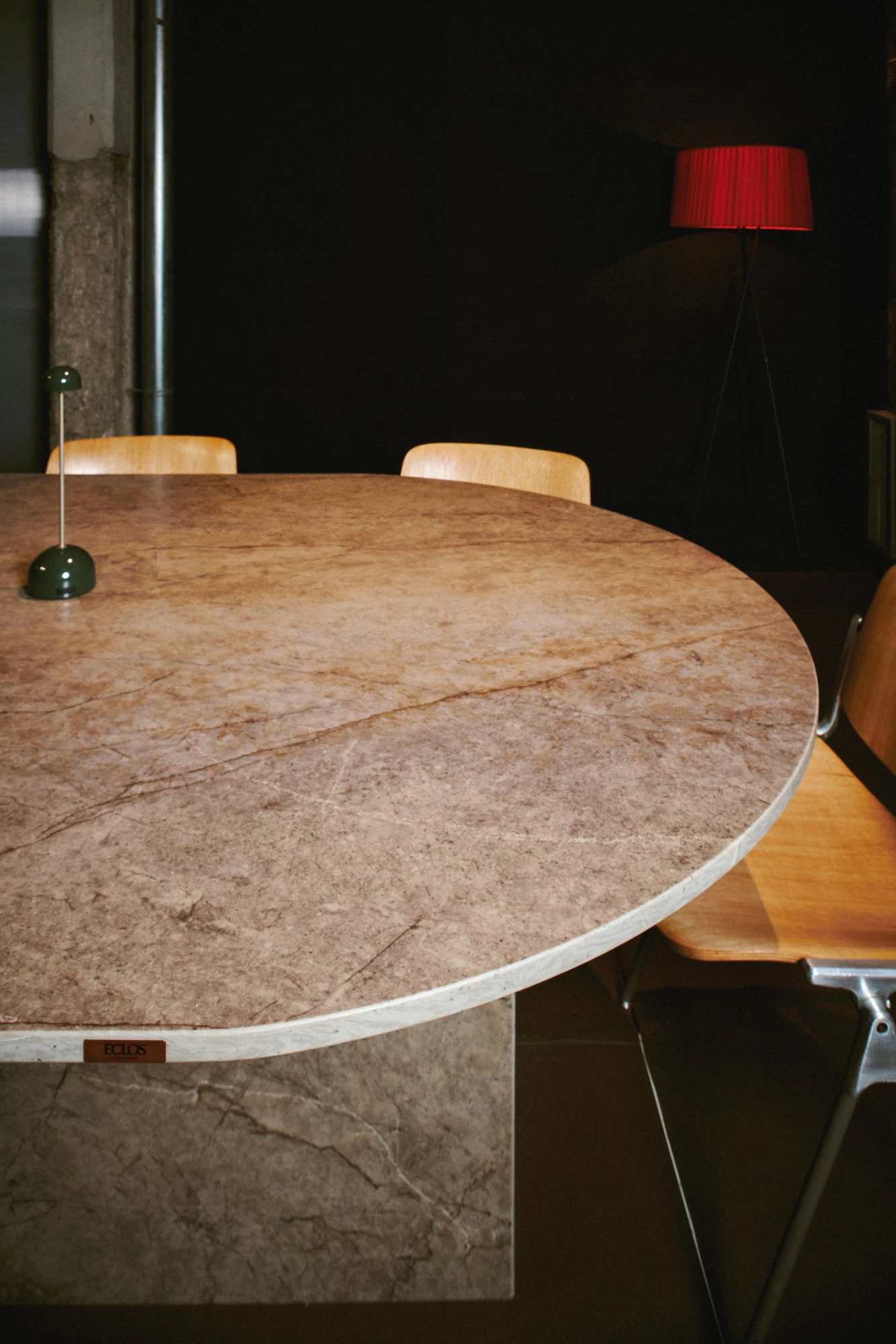 The first piece is the Ä’clos Legnd Table, a six-and-a-half-metre oval table conceived as a bold yet serene gesture. Its continuous form, without edges or interruptions, creates a fluid reading that invites the eye to travel across the surface. The scale transforms the horizontal plane into a true interior landscape.
