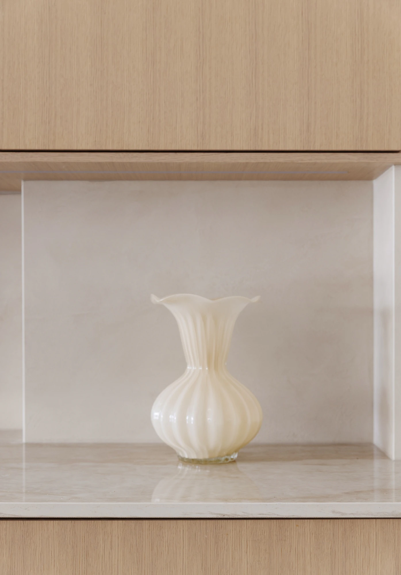 This is why the ultra-compact surface was chosen to decorate the kitchen and laundry room. The brilliant Dekton Arga, inspired by Taj Mahal quartzite, spans the worktop and kitchen island, as well as the laundry worktop. Dekton Khalo, which mimics the patterns of the prized Patagonia stone, shines with its polished finish on the wall behind the shelves, and Dekton Nacre colours the front with a cream tone that oscillates between fine microcement and lime stucco.