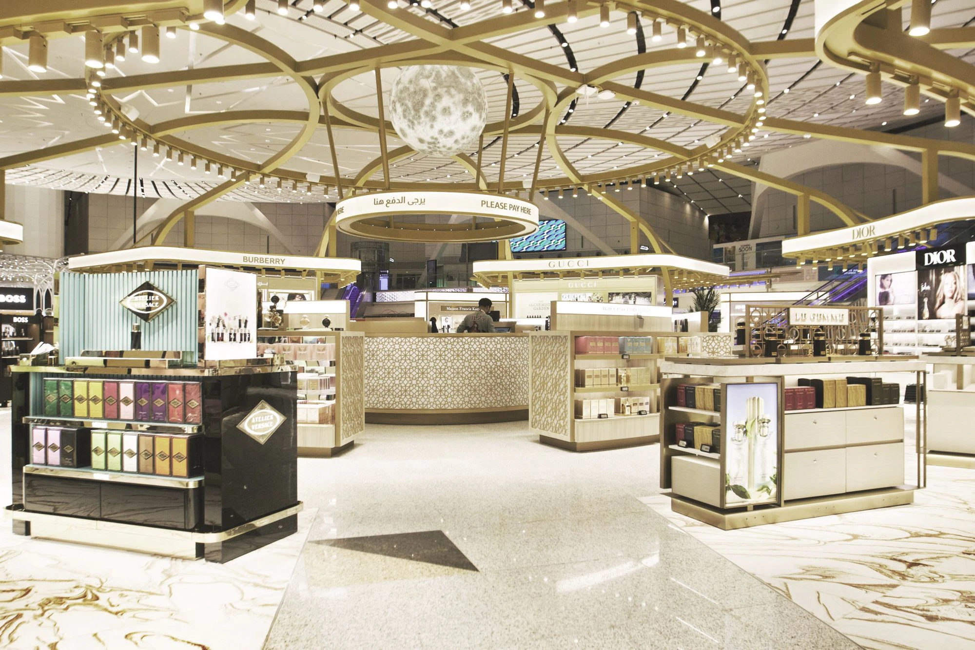 The shopping experience is organised into distinct thematic zones, carefully choreographed. The Perfumery and Cosmetics area evokes the desert through oasis-inspired forms, palm motifs, and warm champagne gold tones. Tobacco, Sweets, and Kids create a marine atmosphere with fluid lines and reflective surfaces reminiscent of the Red Sea. Meanwhile, the Fashion area elevates the narrative towards the sky, using celestial geometries and sophisticated materials that express lightness, movement, and spirituality.