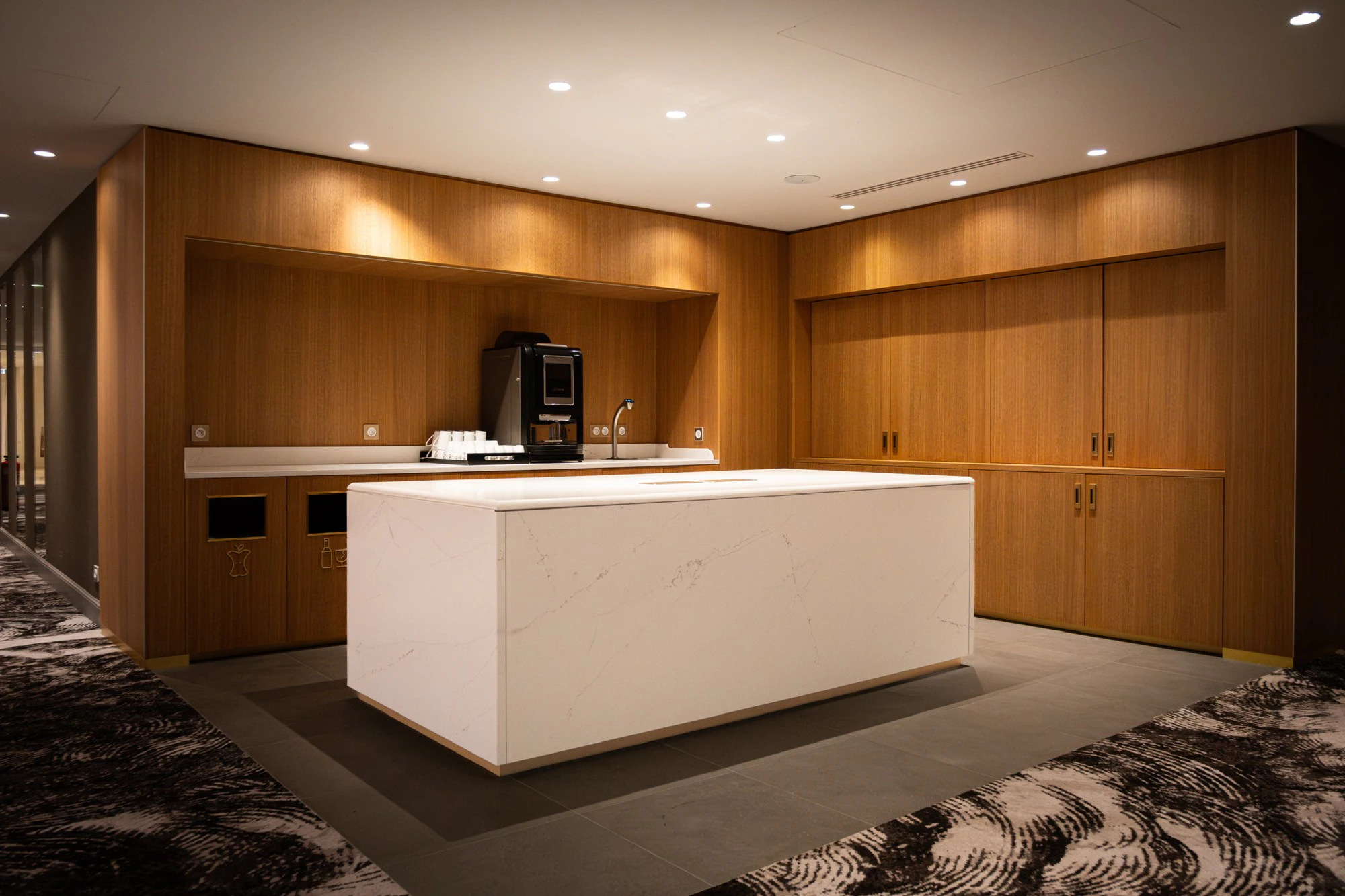 Once again, the quality of installation is essential. Marbrerie De Zorzi Frère ensured a precise and durable application, guaranteeing long-term performance while maintaining aesthetic continuity with the public-facing areas.