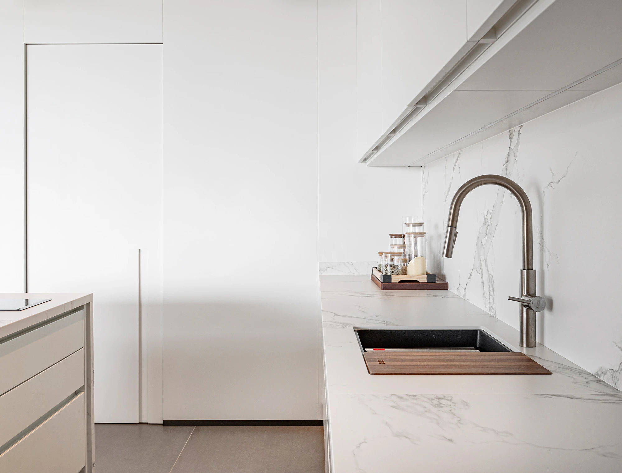 Faced with the potential 'rawness' of the preserved material, it seemed logical to apply colours and finishes that would create a harmonious and elegant contrast. Thus, the studio chose to use DKTN Aura in the kitchen worktops and also in the vertical cladding of the wall supporting the staircase, with thicknesses of 8 and 12 mm. The white veining with soft grey streaks adds brightness and understated elegance, perfectly integrating with the rest of the finishes.