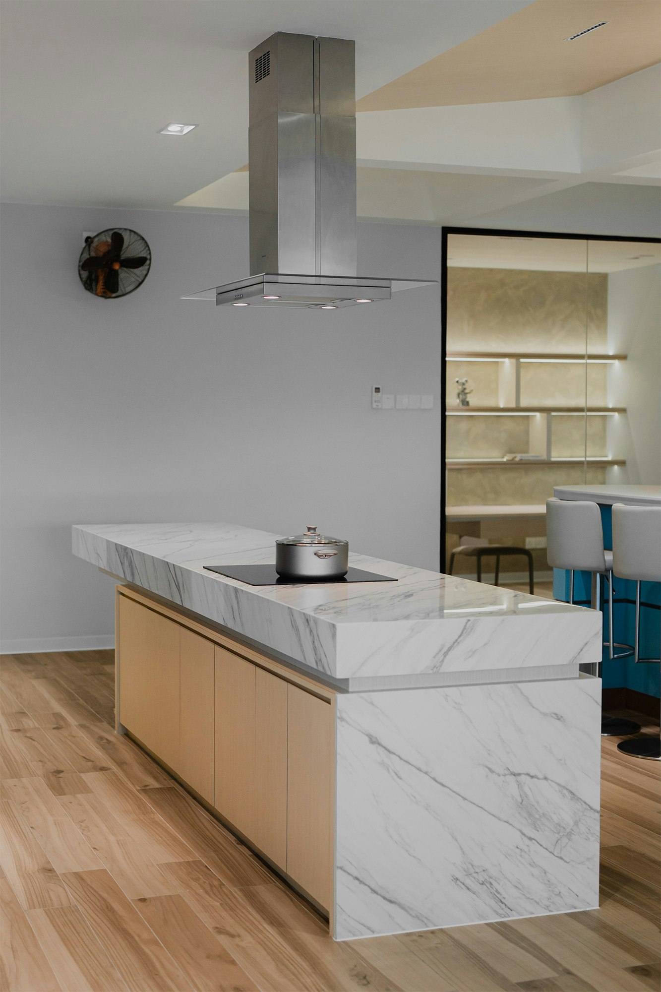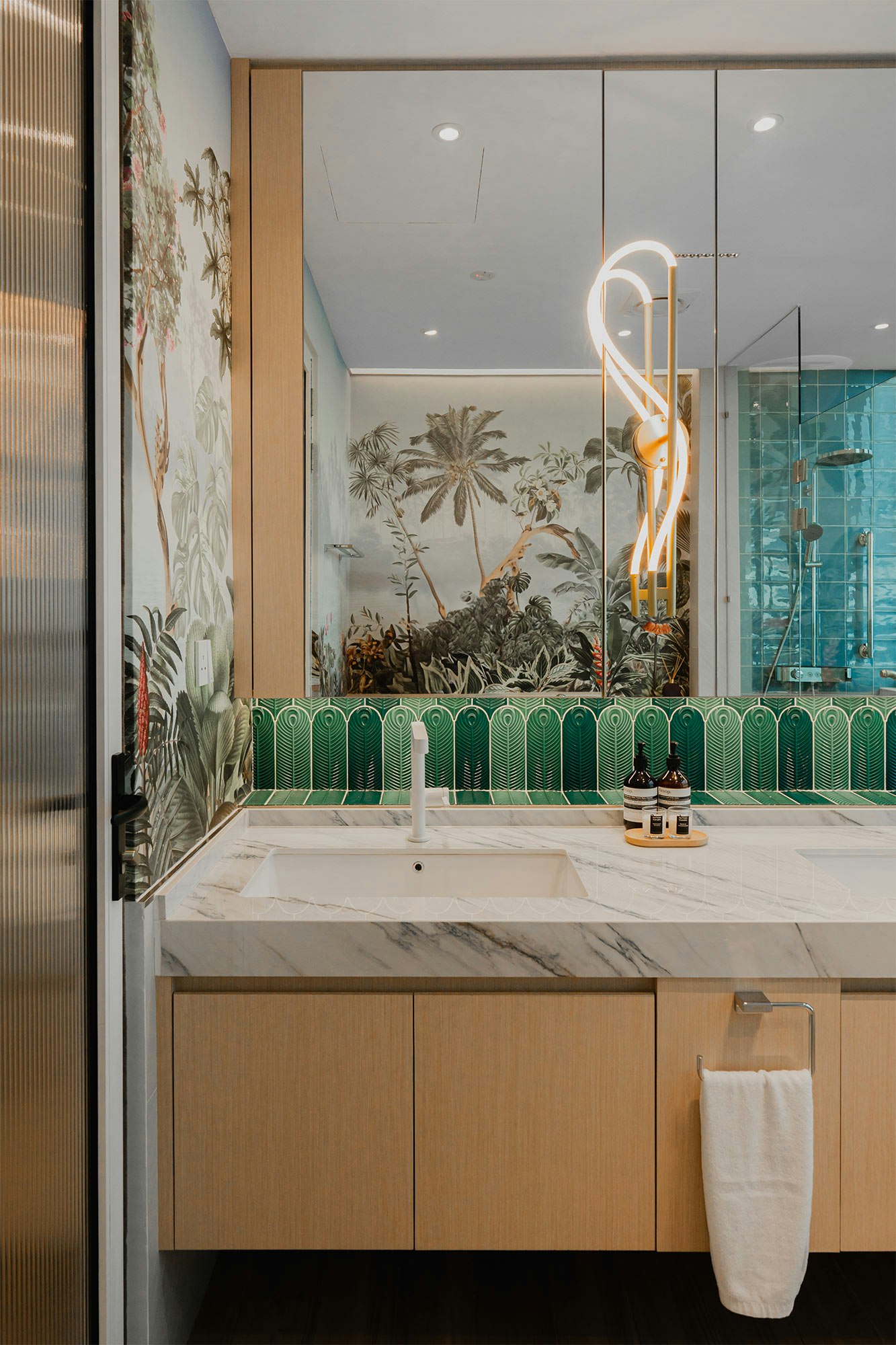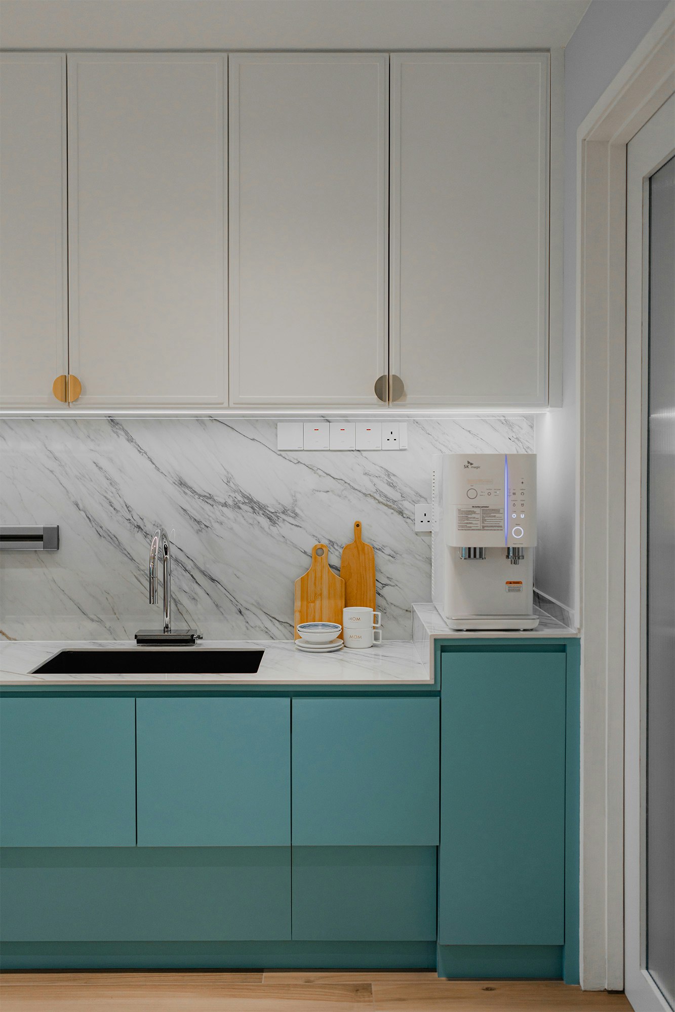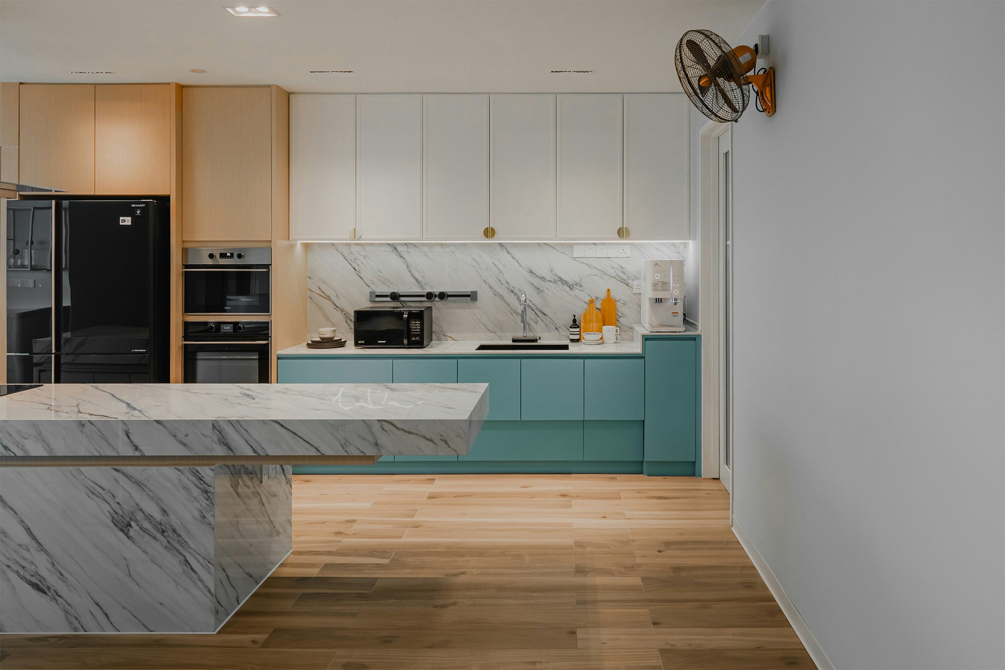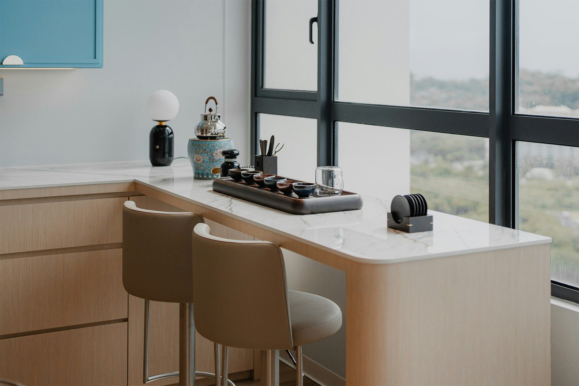 With a colour scheme of serene blues, vibrant wallpapers and imaginative details, the team has created a unique home in which the kitchen is the star. “The pièce de résistance of the project is undoubtedly the floating kitchen island, a marvel of both form and function,” they say.